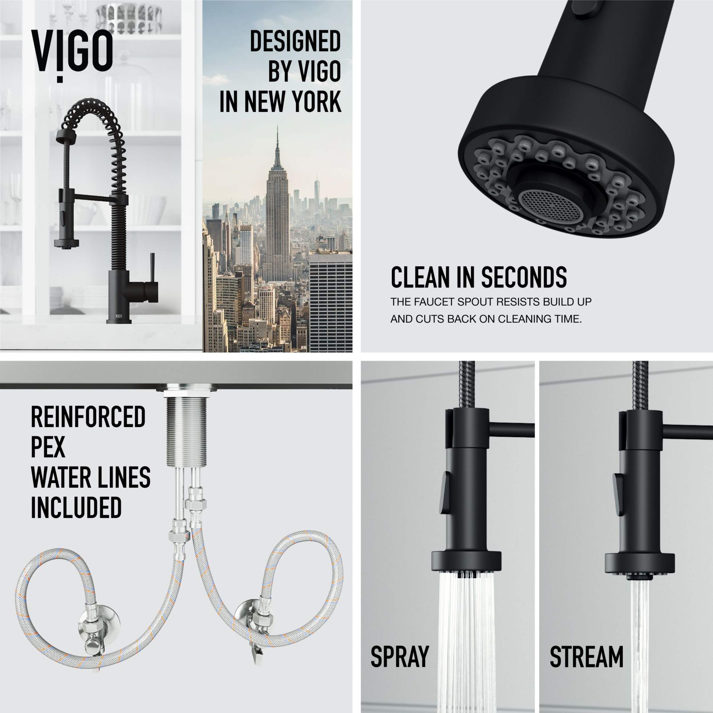 The VIGO Edison Pull-Down Spray Kitchen Faucet in Matte Black combines industrial style with high functionality, perfect for any modern kitchen. Featuring a pull-down spray head with dual-function settings, this faucet provides the flexibility needed for various kitchen tasks. The matte black finish resists fingerprints and water spots, keeping it looking clean and polished. Built with durability and ease of use in mind, the VIGO Edison faucet is both a stylish and practical choice for busy kitchens.
