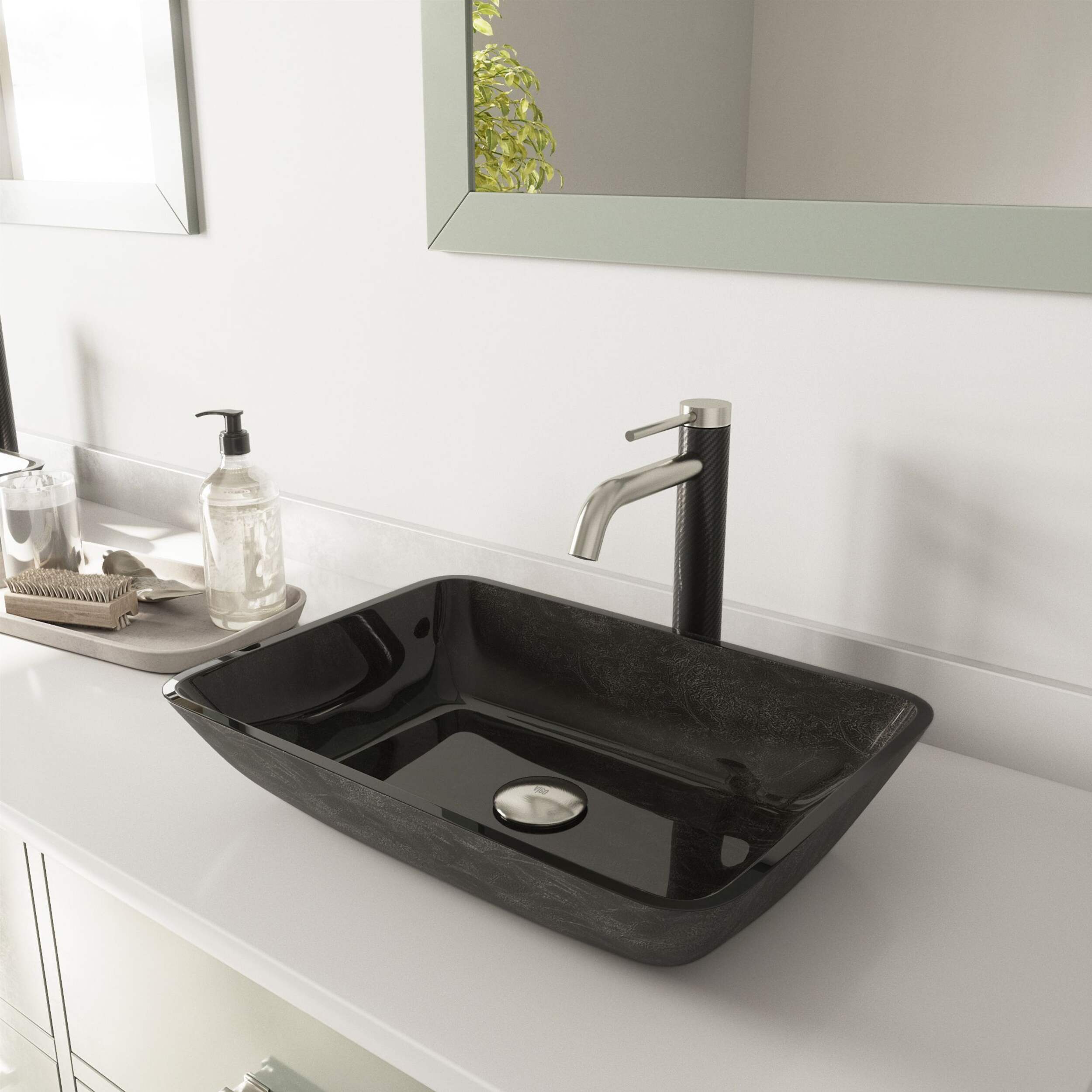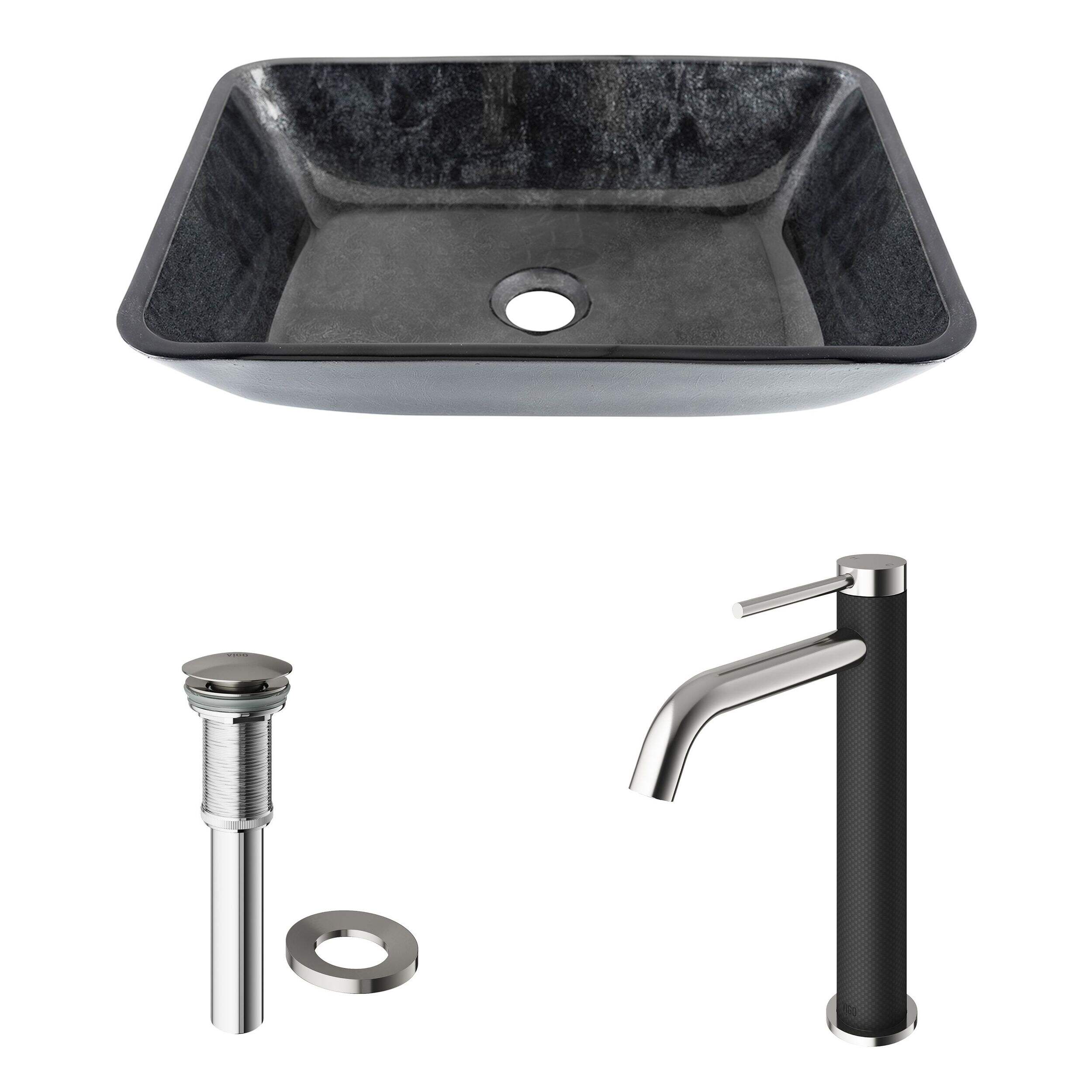 This complete Onyx bathroom sink set includes a rectangular vessel sink, 10-in H Lexington 1-hole deck mounted bathroom faucet and a matching pop-up drain