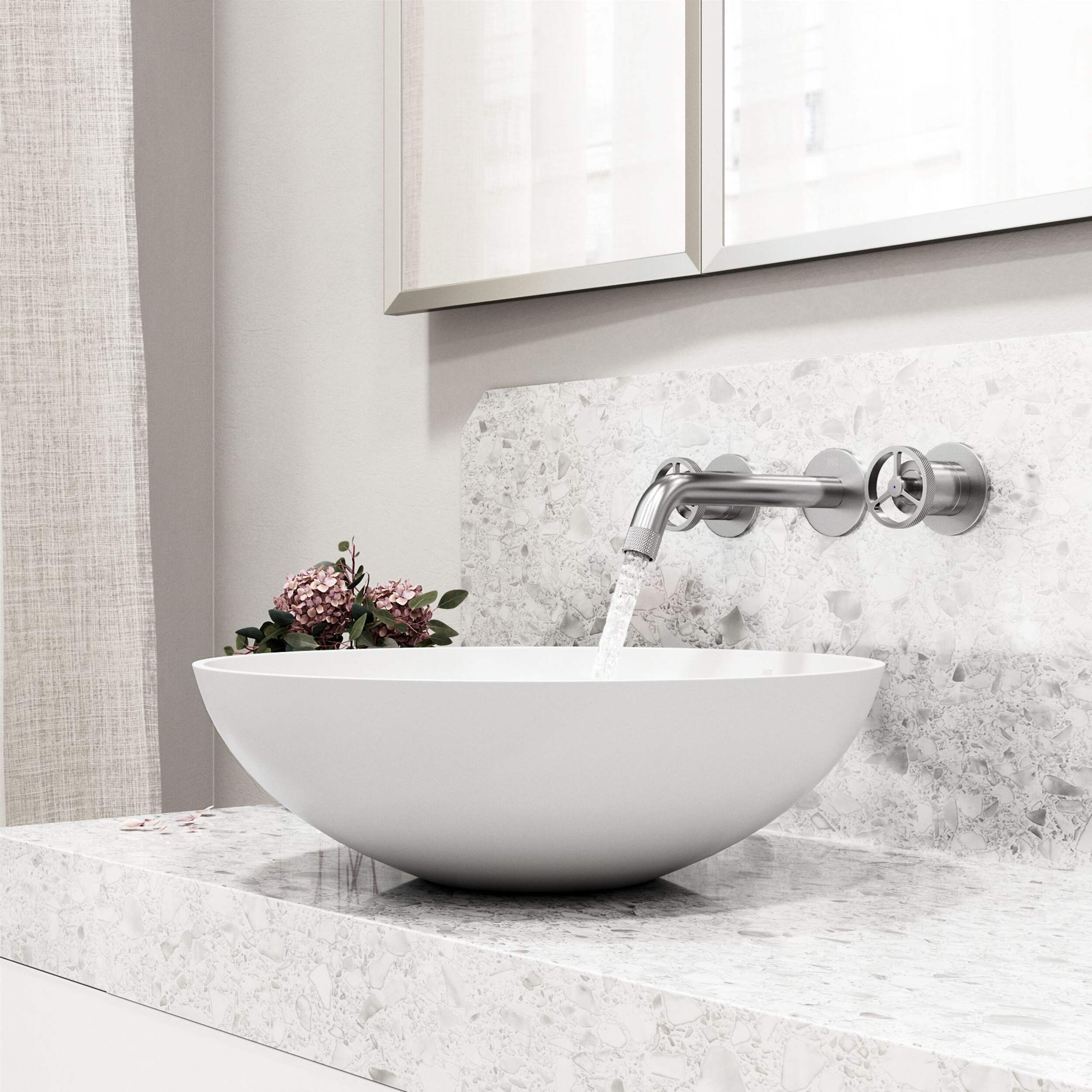 This Lotus bathroom sink set includes a sleek sink, 3-in H Cass 3-hole wall mounted bathroom faucet and a matching pop-up drain for compatibility and consistency in design