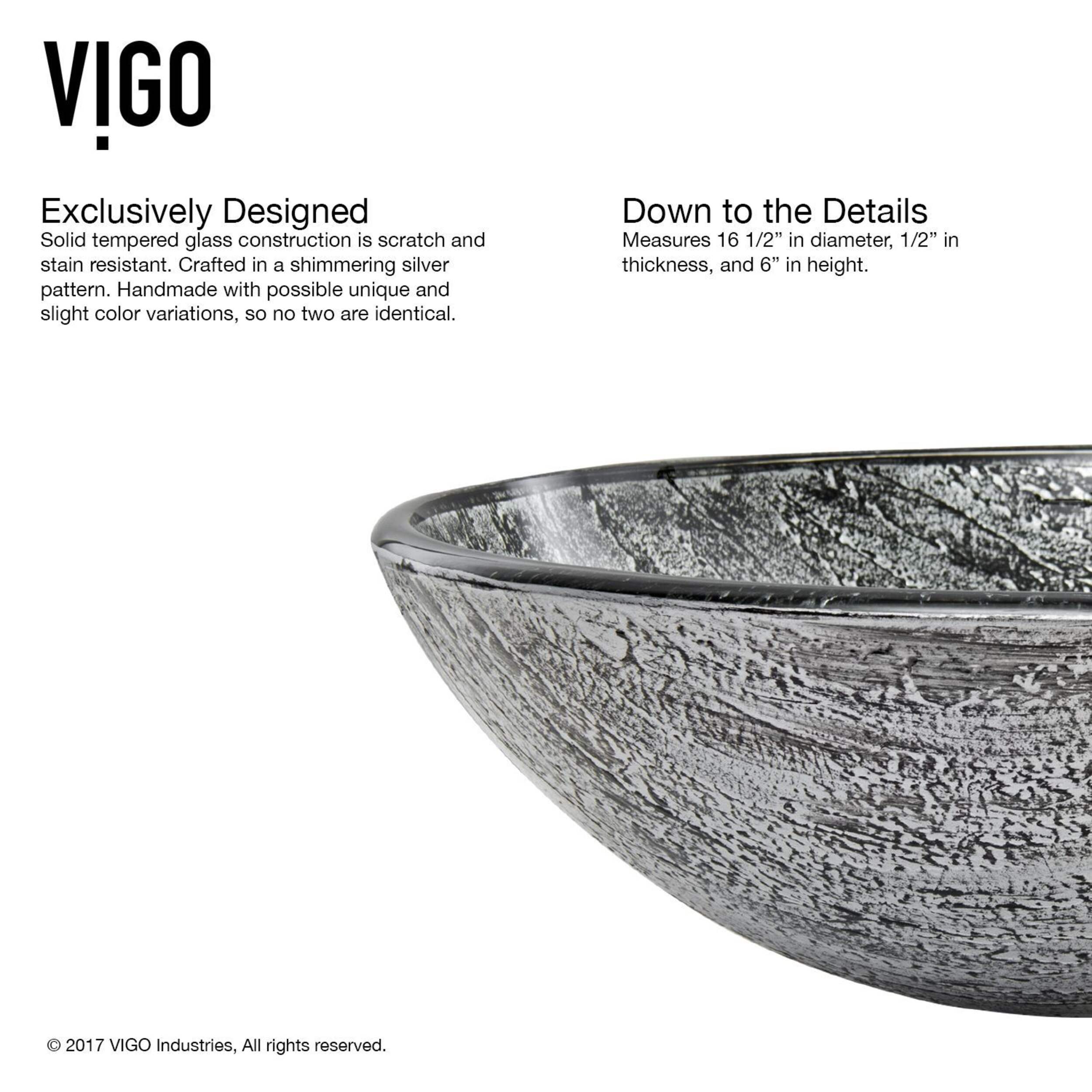 Vessel bathroom sinks look effortlessly stylish propped in the bathroom counter, and this one from VIGO is no different. The solid tempered glass is durable enough for family use, scratch and fade resistant, and non-porous so spills wipe clean easily. The polished interior and textured exterior mean no staining and simple cleaning. Handpainted details make each sink unique, and it pairs with any VIGO faucet for a complete bathroom set. The silver and black pattern of this glass vessel sink gives a sophisticated update to any bathroom counter.