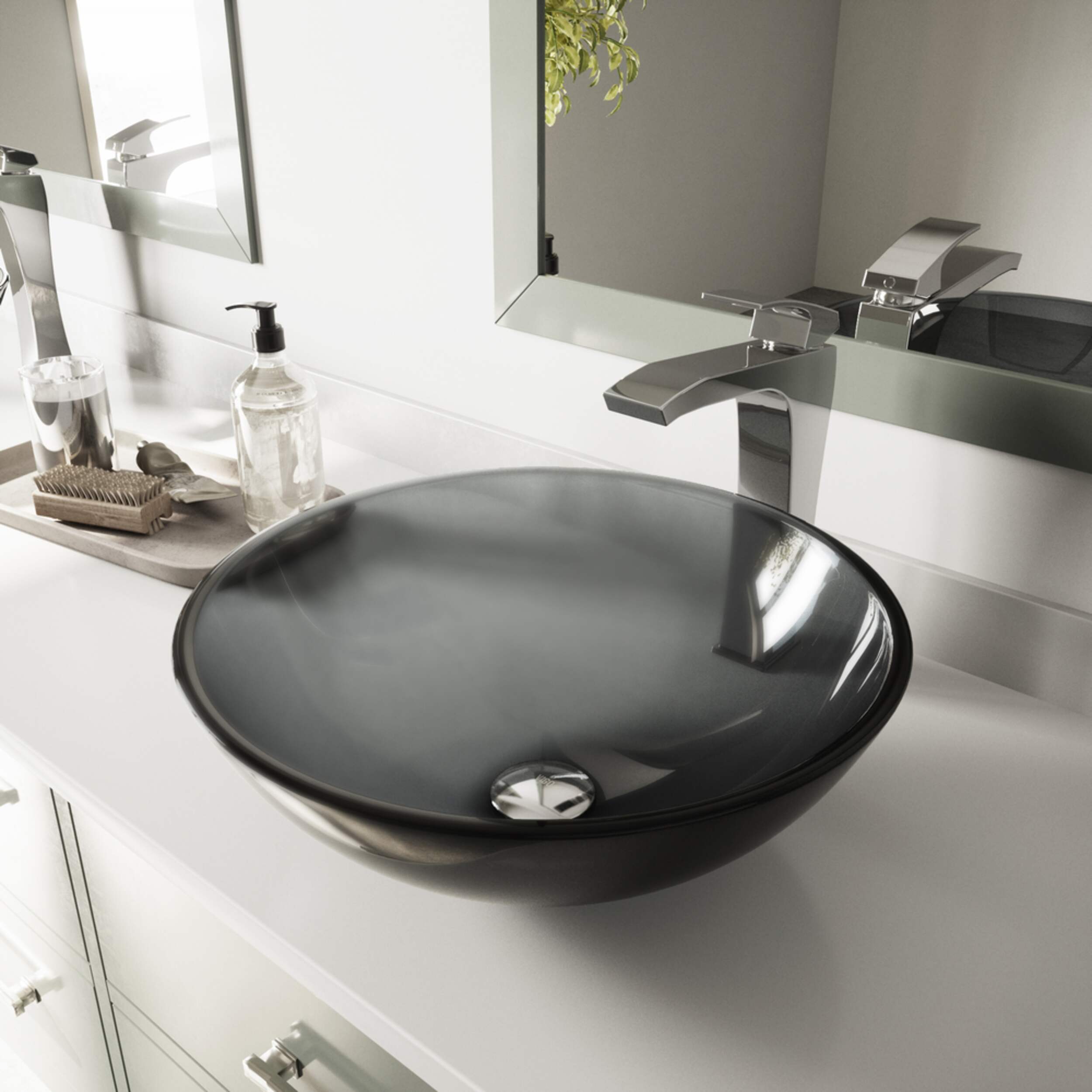 Handcrafted from solid tempered glass, the VIGO Sheer Black Glass Vessel Bathroom Sink is ideal for everyday use. The polished interior and exterior are stain-resistant and easy to clean. The sleek, highly reflective transparent black bathroom sink makes a stunning presence in any modern bathroom renovation.