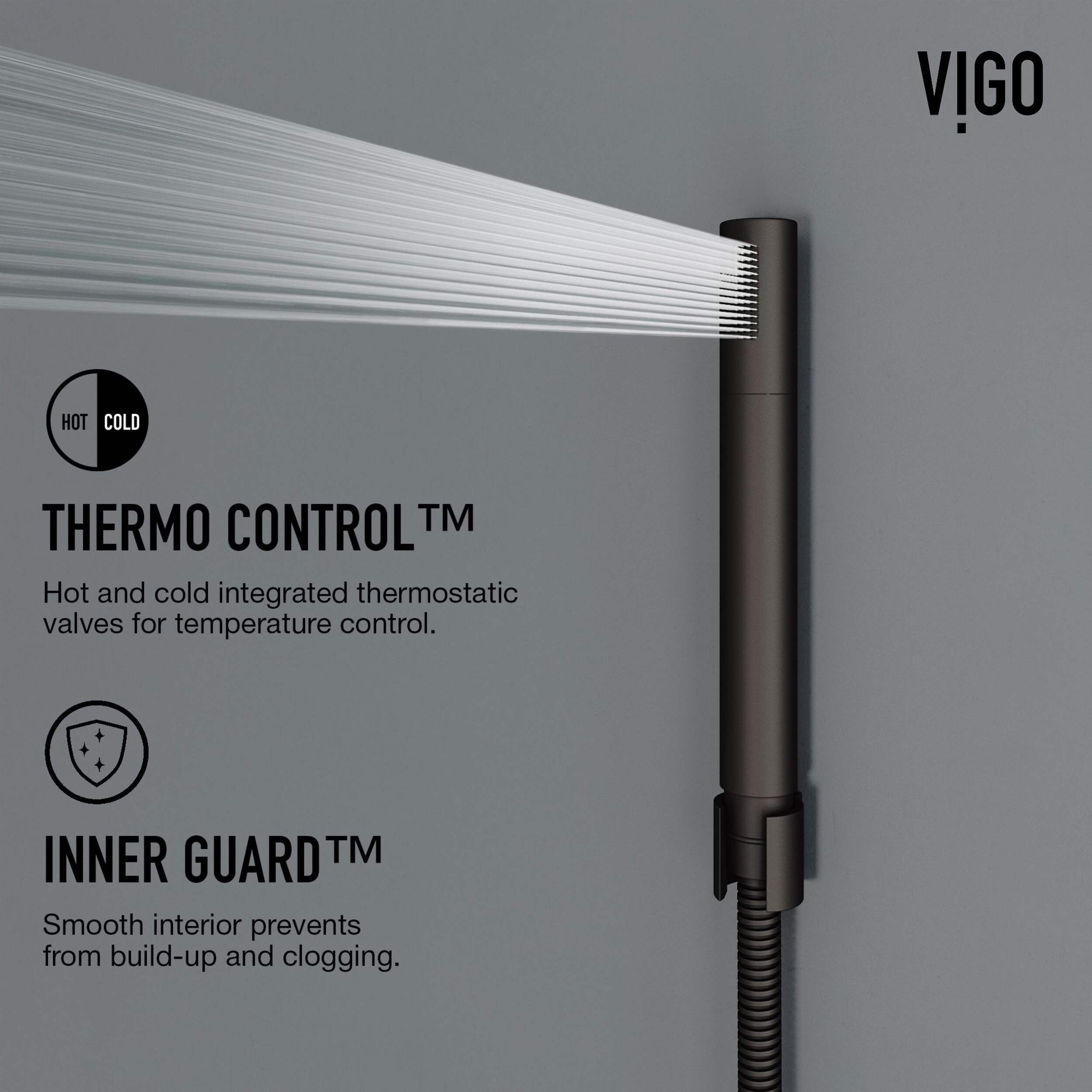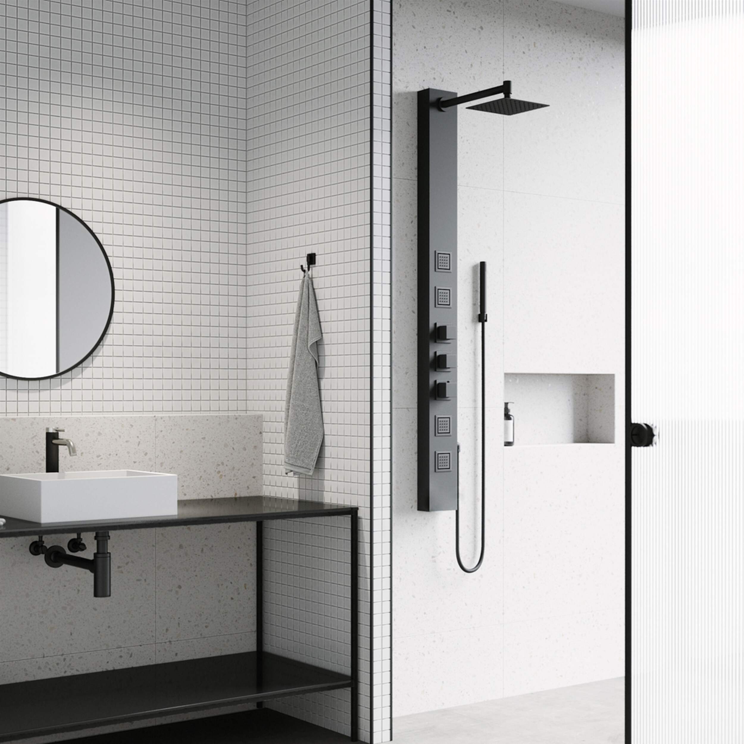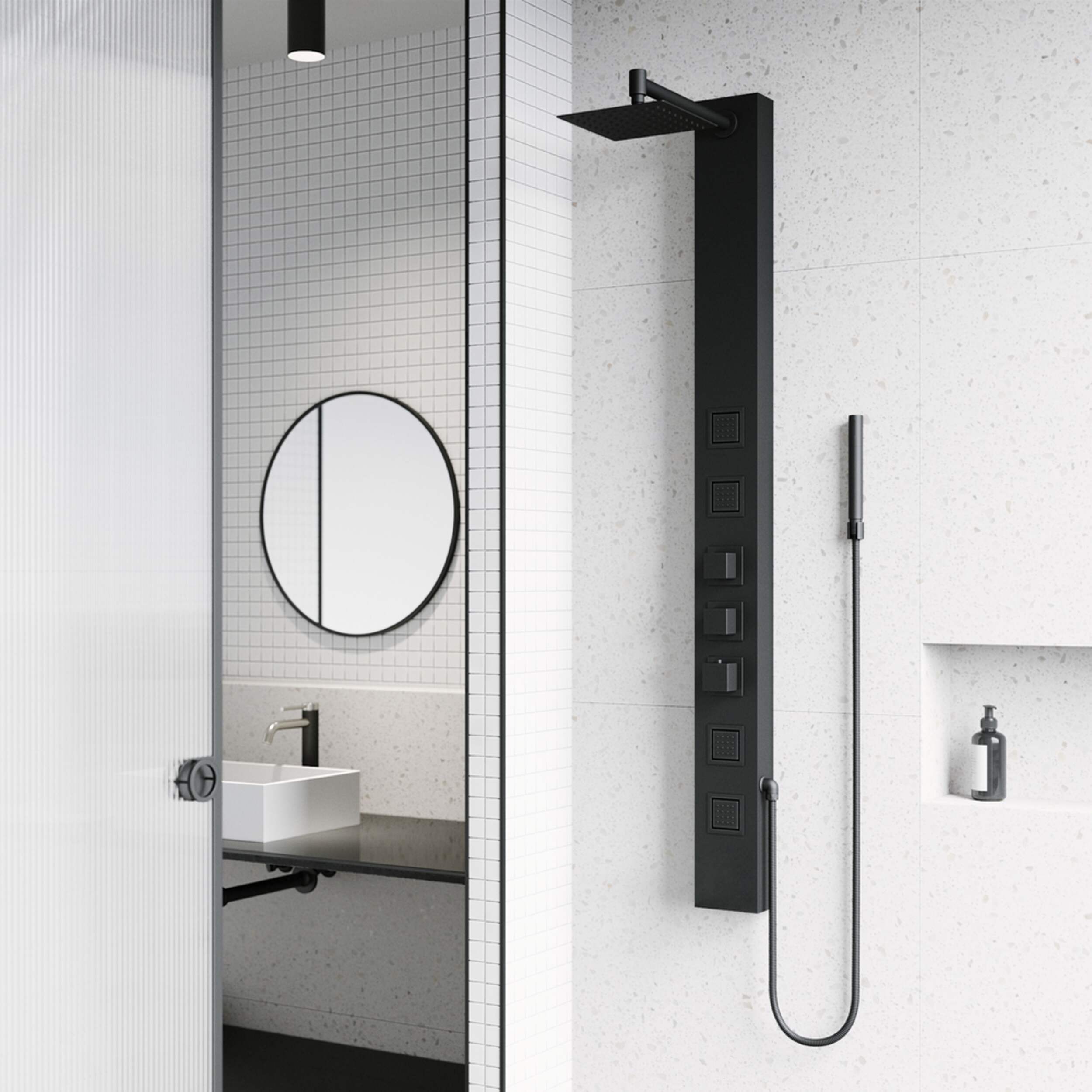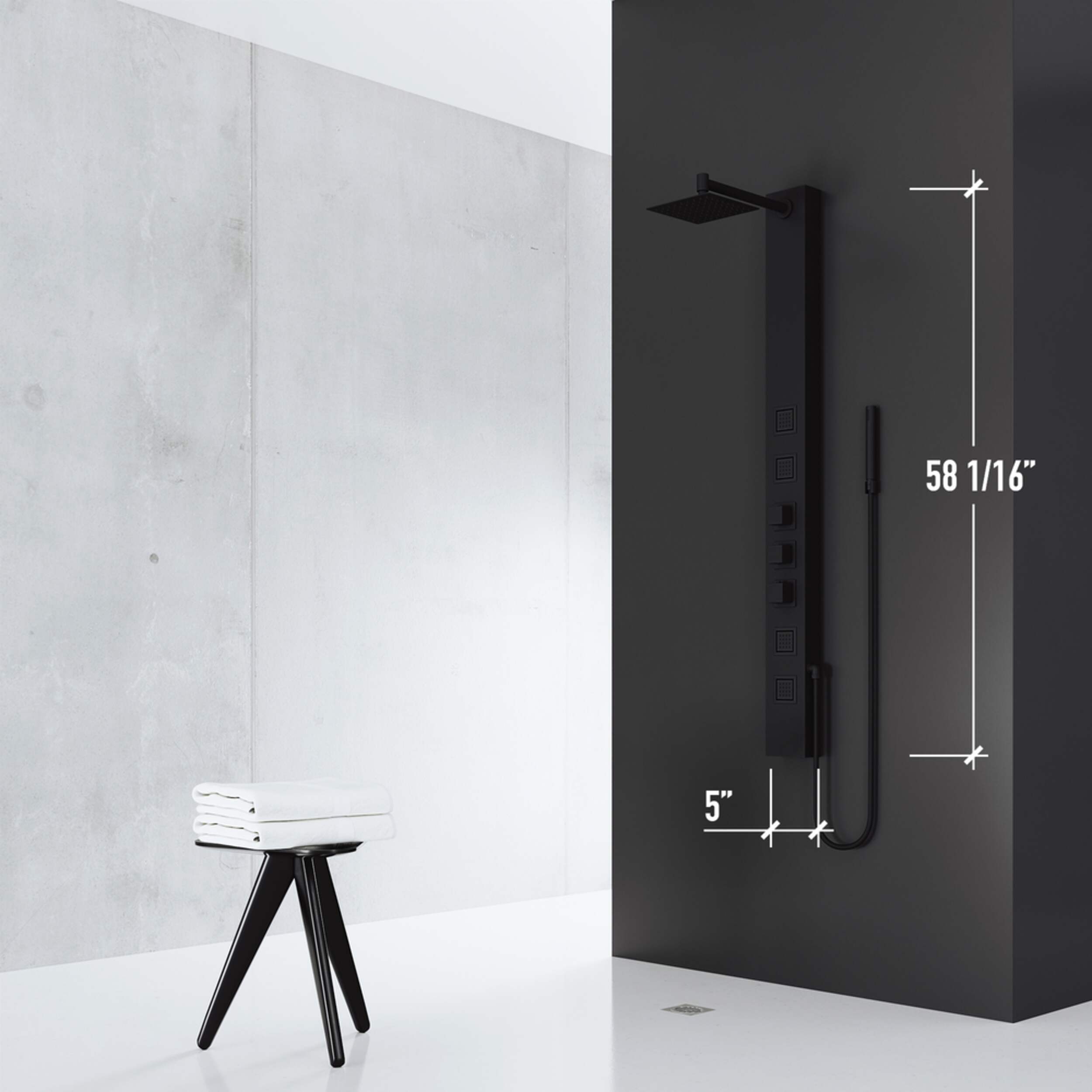 Revitalize your mind, body and soul with VIGO's Sutton, a rainfall shower panel with a handheld shower that provides body coverage and massage therapy. Reimagining design, The Sutton integrates intelligent hydrotherapy with pressurized body sprayers. It delivers a powerful sensation yet still saves water. Designed for water conservation, The Sutton makes your home eco-friendly and exceptionally relaxing. VIGO's premium hardware finish adds modern luxury and pairs perfectly with your sliding shower door or shower enclosure.