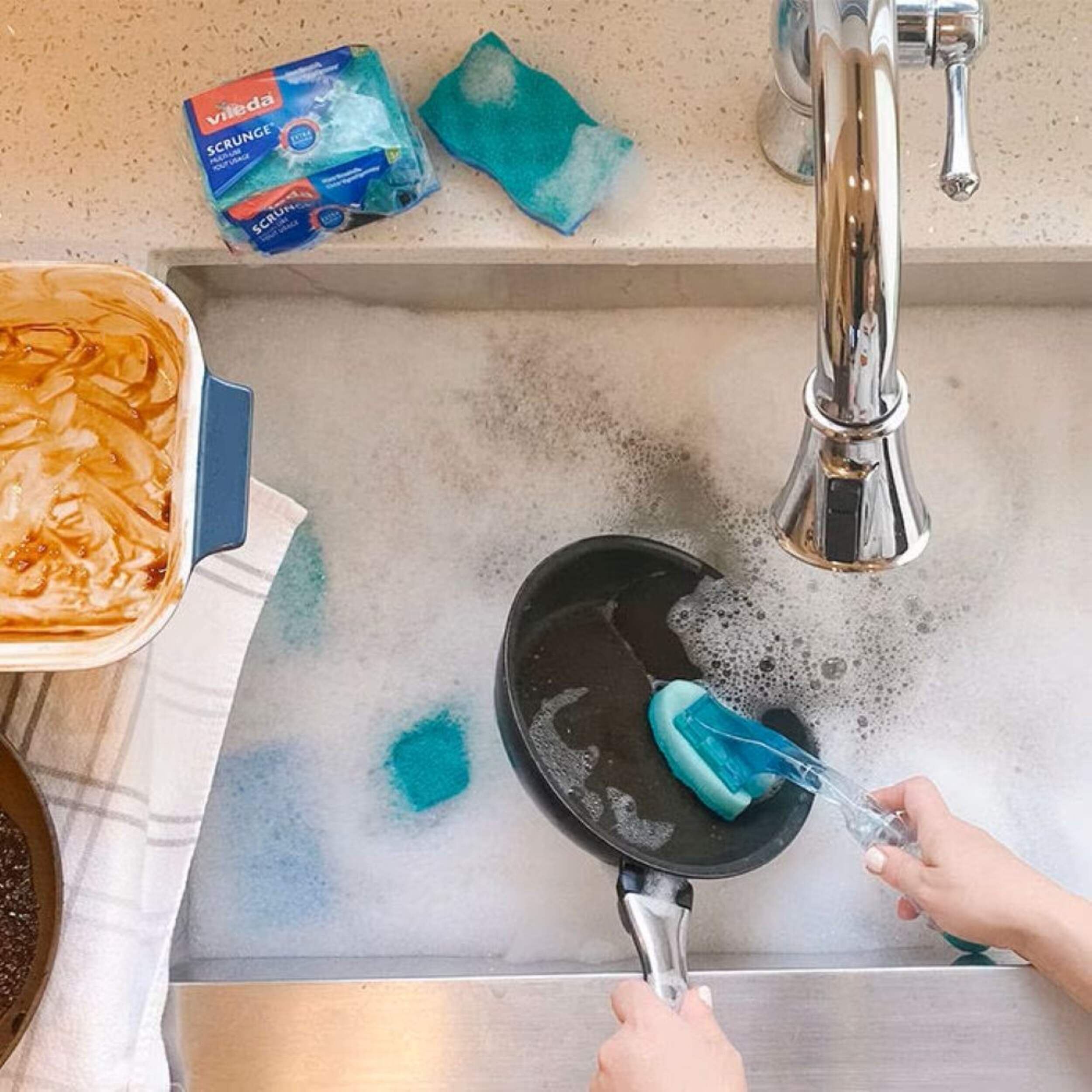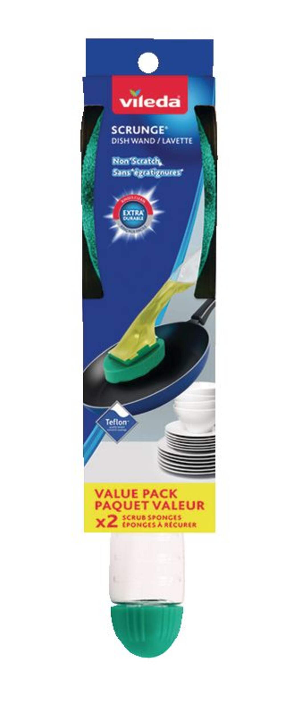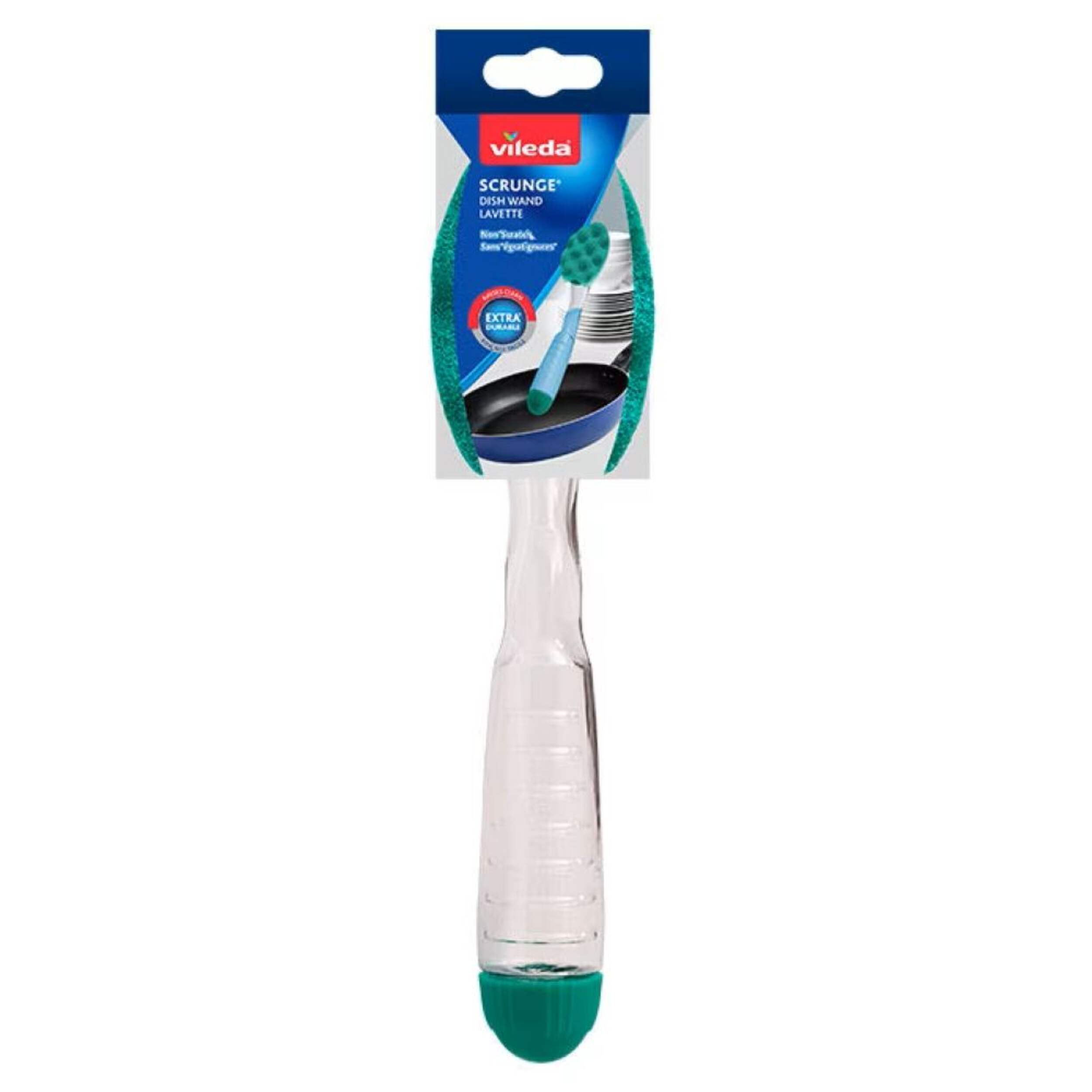 The Vileda Scrunge Multi-Use Dishwand cleans all kitchen dinnerware and cookware without your hands having to get into the mess. Its easy-to-fill, detergent-dispensing handle makes it a complete and convenient kitchen tool. Simply fill with your favourite detergent and scrub! Clean everything from glasses, dishes to pots and pans without leaving a streak or scratch. The Scrunge refill removes tough dirt, rinses clean and is long lasting. Ideal for washing non-stick pots and pans and cleaning the sink.