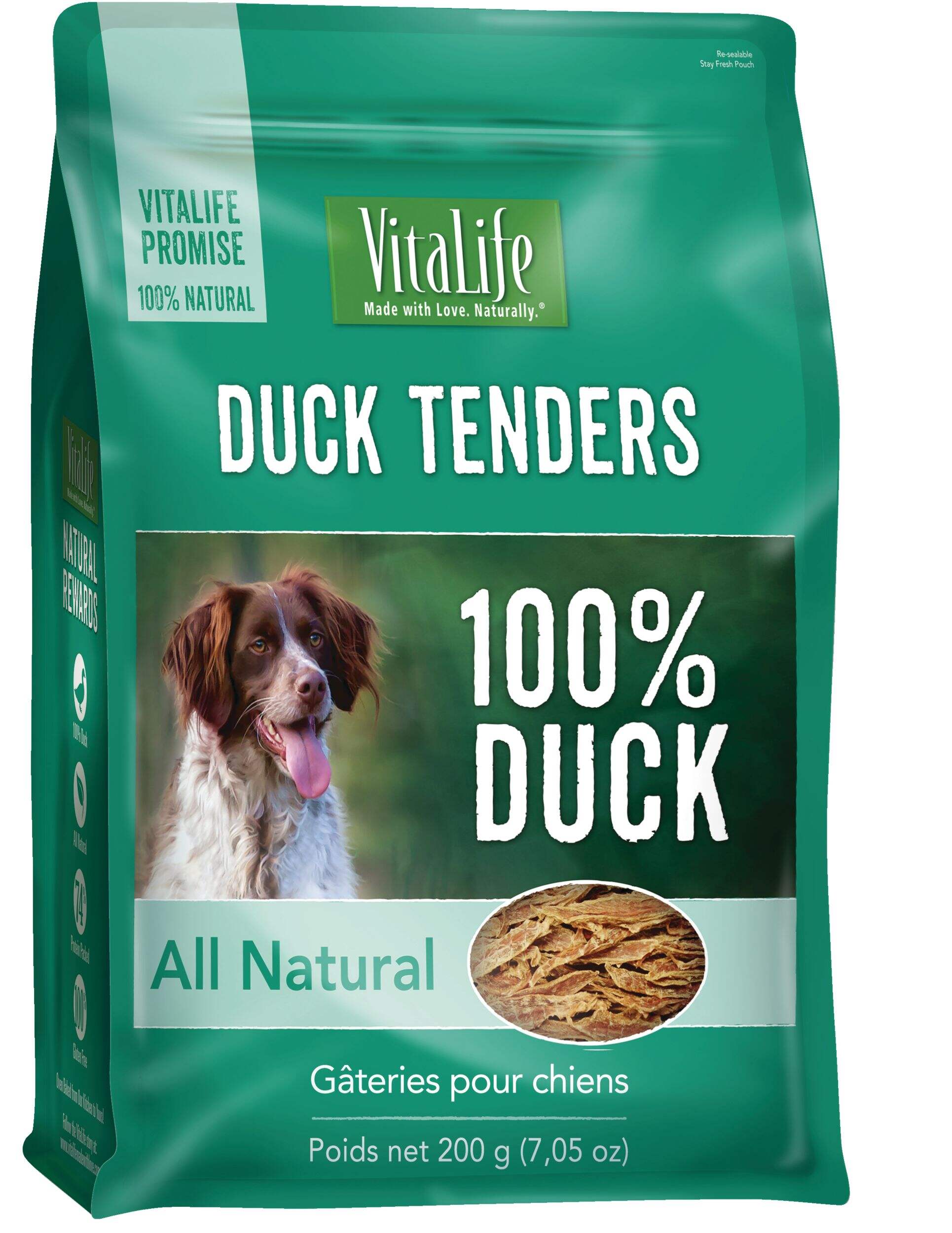 All natural, real jerky dog treats that taste as good as they sound! Hand-crafted with fresh, never frozen, premium duck breast fillet, VitaLife Duck Tenders deliver 68% protein and all of the flavour.