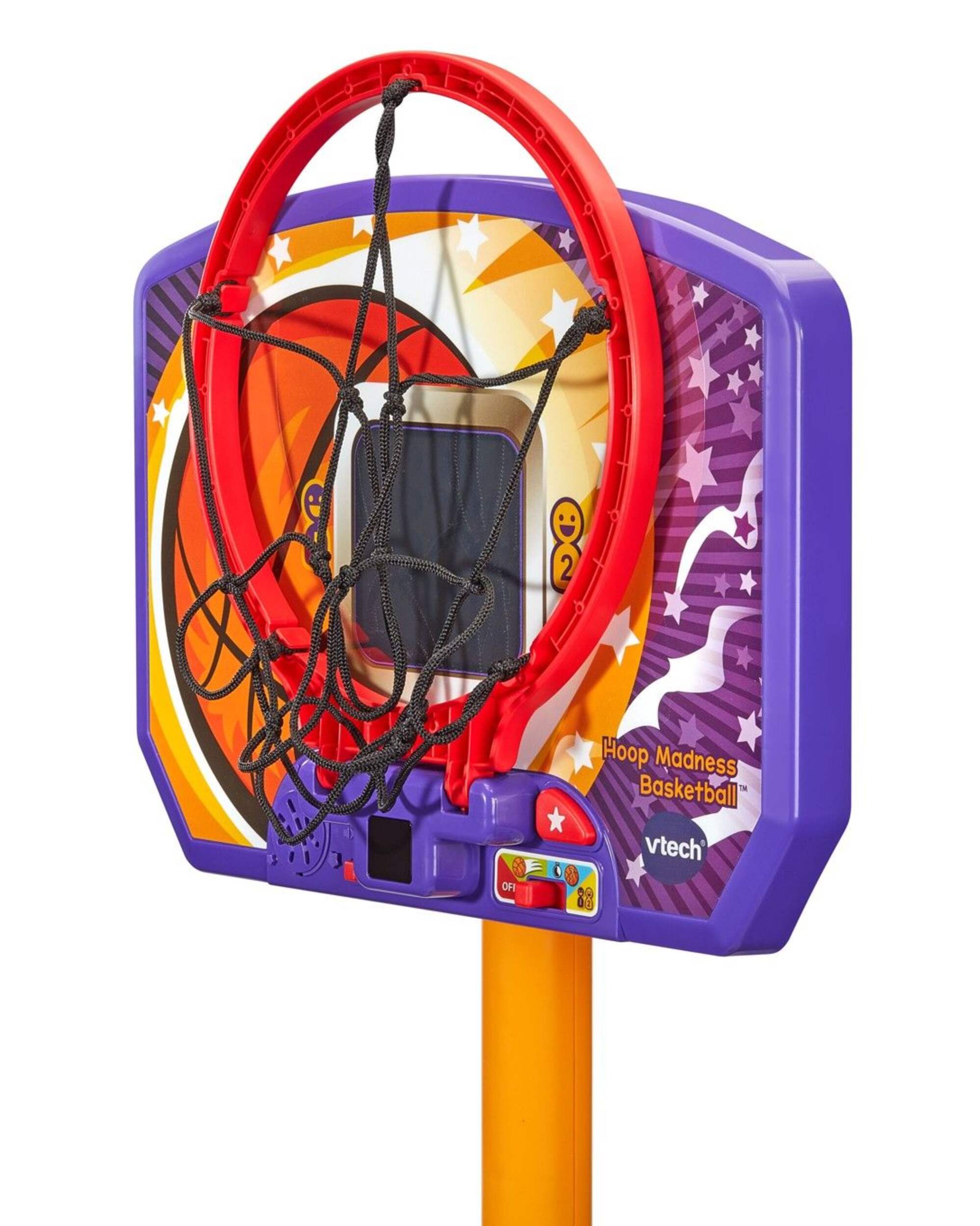 Choose the perfect volume level to pump up playtime, then flip up the hoop to stay out of the way until the next practice