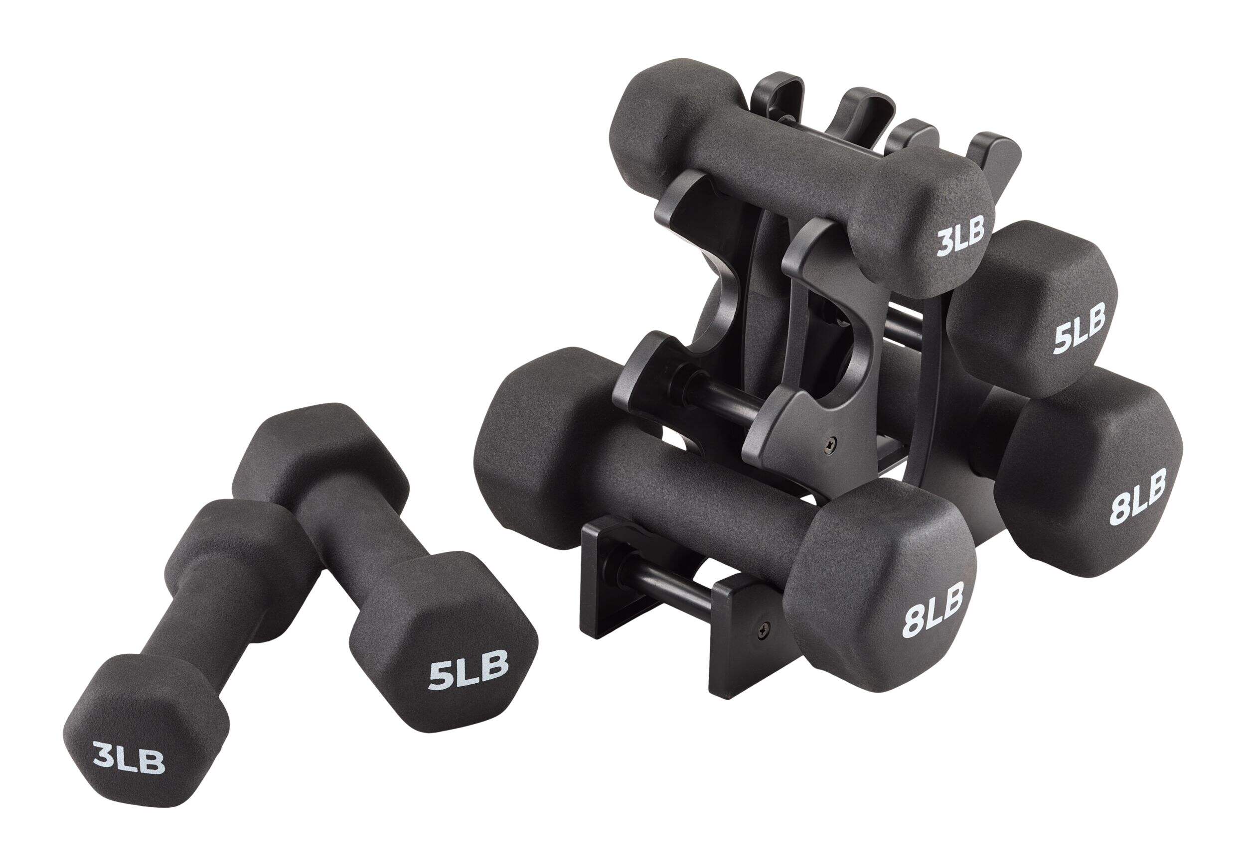 Set includes: 2 x 3 lbs (1.36 kg), 2 x 5 lbs (2.26 kg), 2 x 8 lbs (3.6 kg)