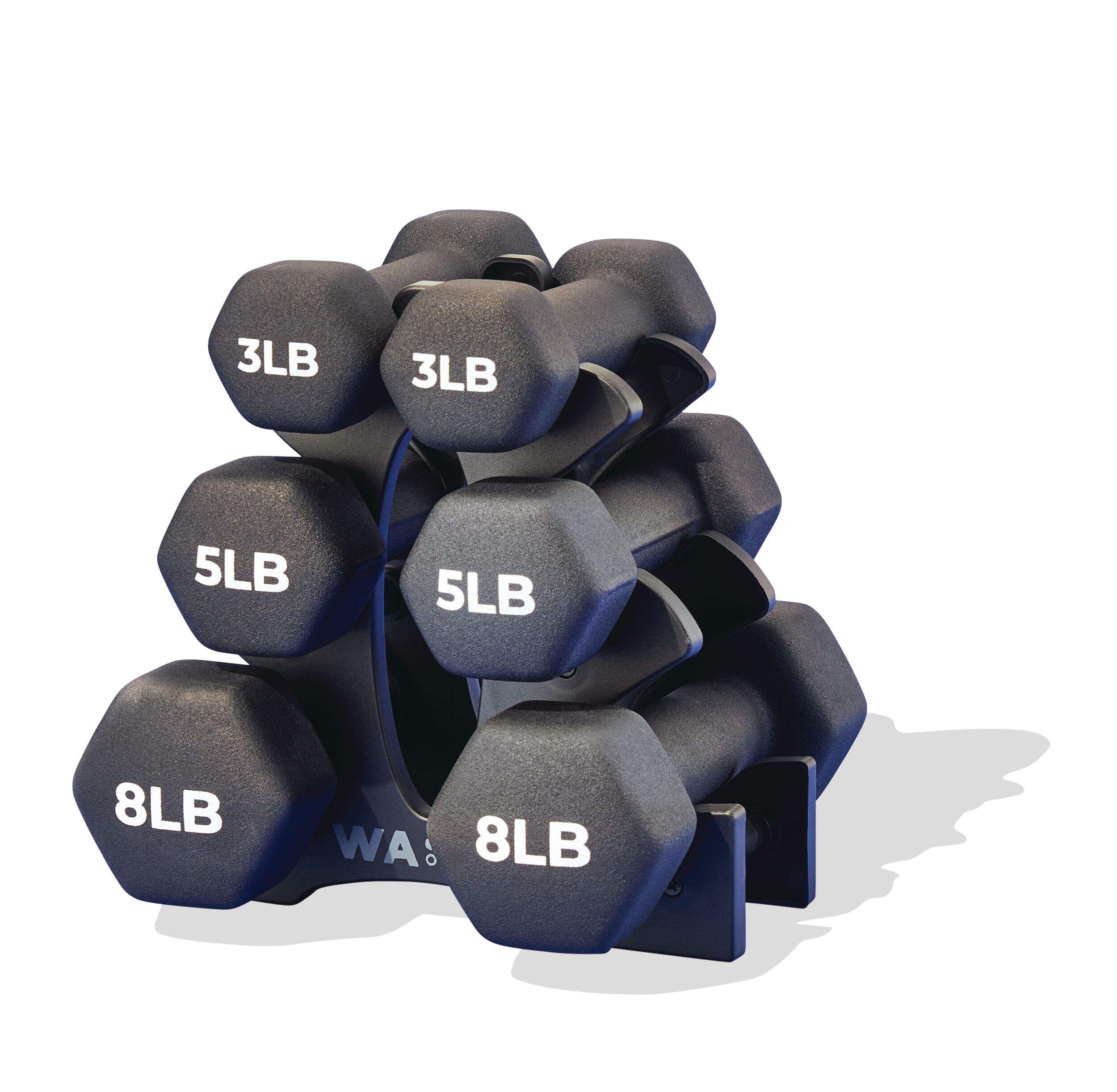Amplify your fitness routine with WA:KE Athletic's Neoprene Dumbbell Set! Ready to level up? With a range of weights, you can challenge yourself as you progress. Featuring easy-to-hold grips and roll-free hexagon shapes, these dumbbells make every lift effortless. The durable neoprene coating keeps your floors and gear safe, so you can focus on smashing those goals. Plus, the sleek storage rack keeps everything tidy and out of the way.