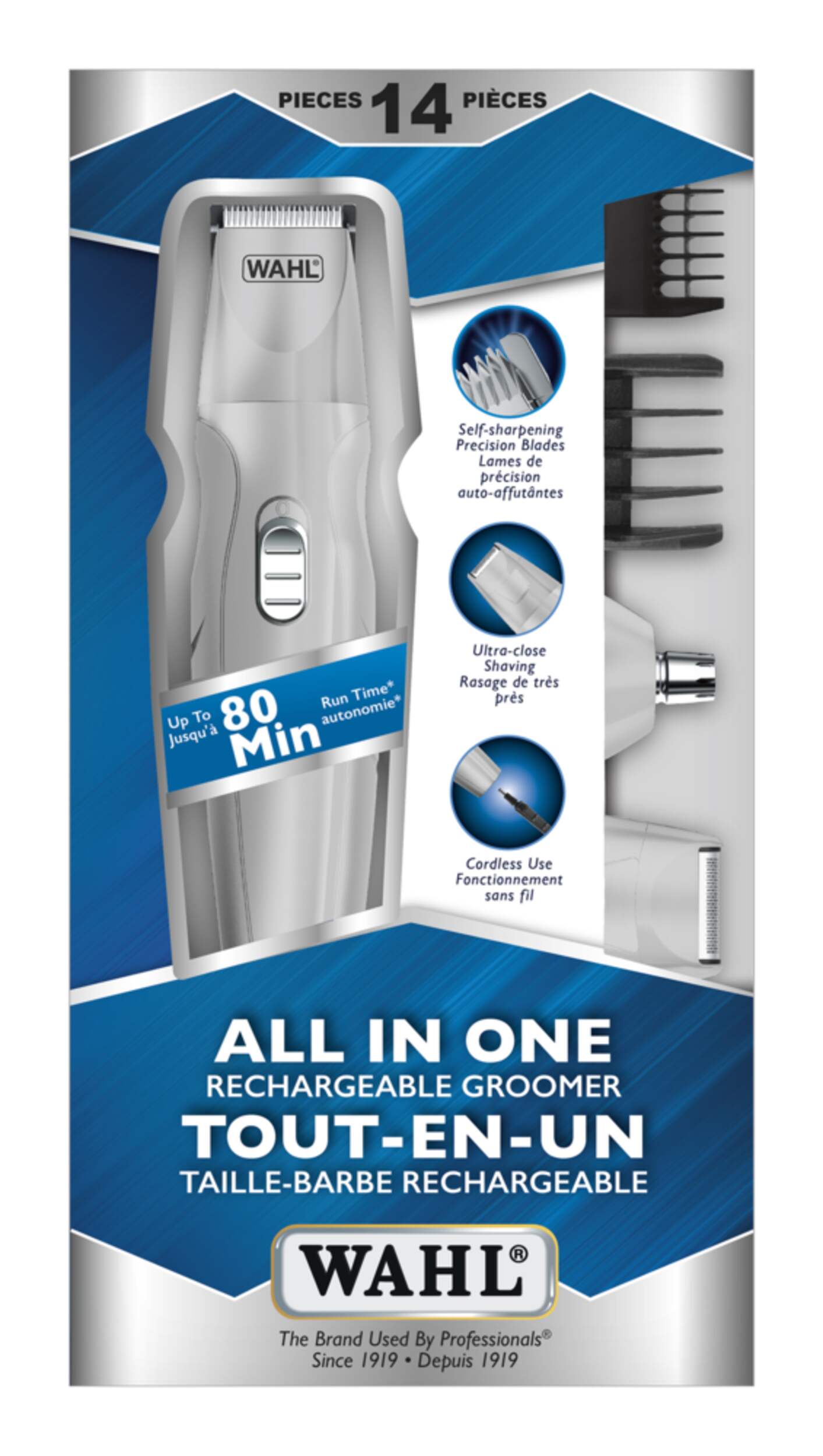 The Wahl 3110 Rechargeable All-In-One Grooming Kit is designed for a complete grooming experience. This 14-piece set includes an electric hair clipper, beard trimmer, and various attachments to meet your personal grooming needs. The self-sharpening precision blades offer clean, precise cuts, and the ergonomic design allows for comfortable handling, making it ideal for both beginners and professionals.