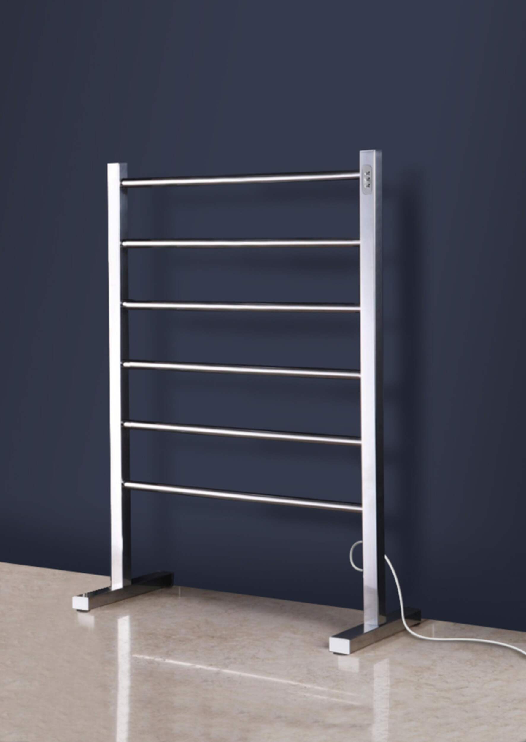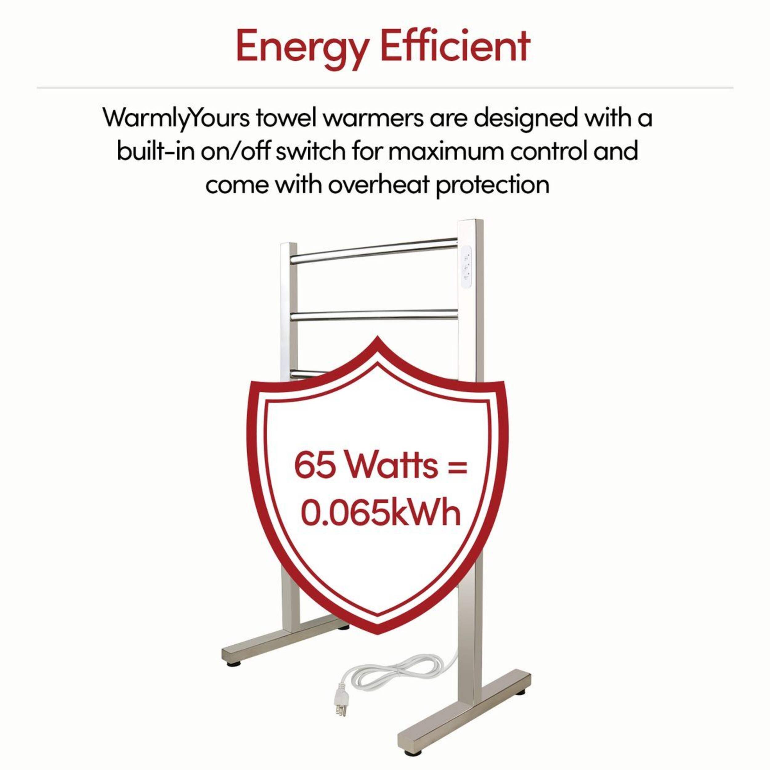 The Ibiza towel warmer from WarmlyYours represents the perfect blend of versatility and functionality. With its freestanding construction and plug-in connection, the DIY-friendly Ibiza, unlike wall-mounted towel warmers, can be used in almost any room with a functioning outlet and easily moved to different locations. Additionally, the integrated control offers several options: manual on/off control, on for 2 hours, and on for 4 hours. The 6 evenly spaced bars of the Ibiza towel warmer will deliver a heat output of 222 BTUs per hour, which will not only warm your towel or bathrobe but it can also dry them between uses. This model’s polished finish and 304-stainless steel construction means the Ibiza is sure to be a star attraction in any room. This model comes with built-in TempSmart™ overheat protection to prevent the unit’s surface temperature from exceeding 149°F (65°C).