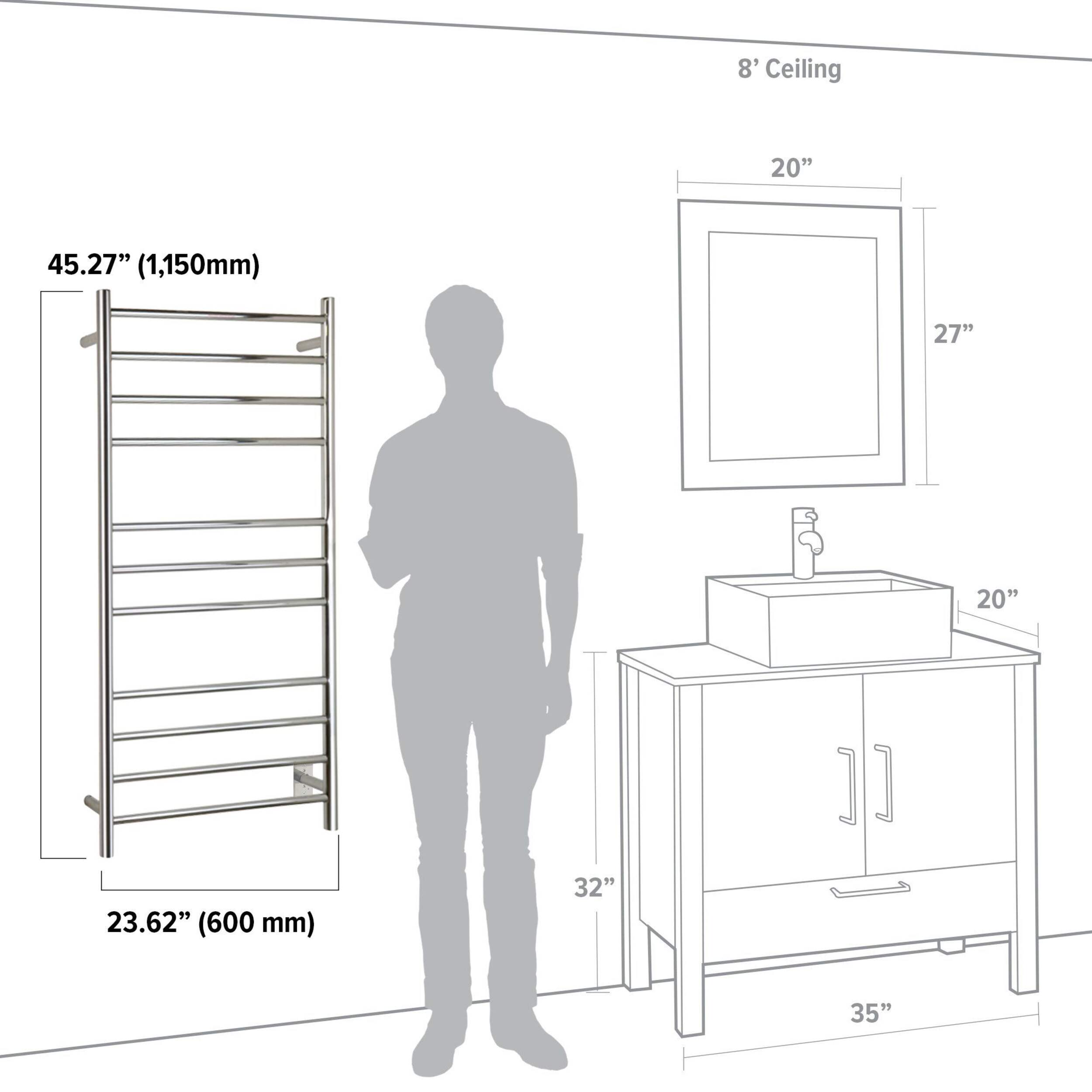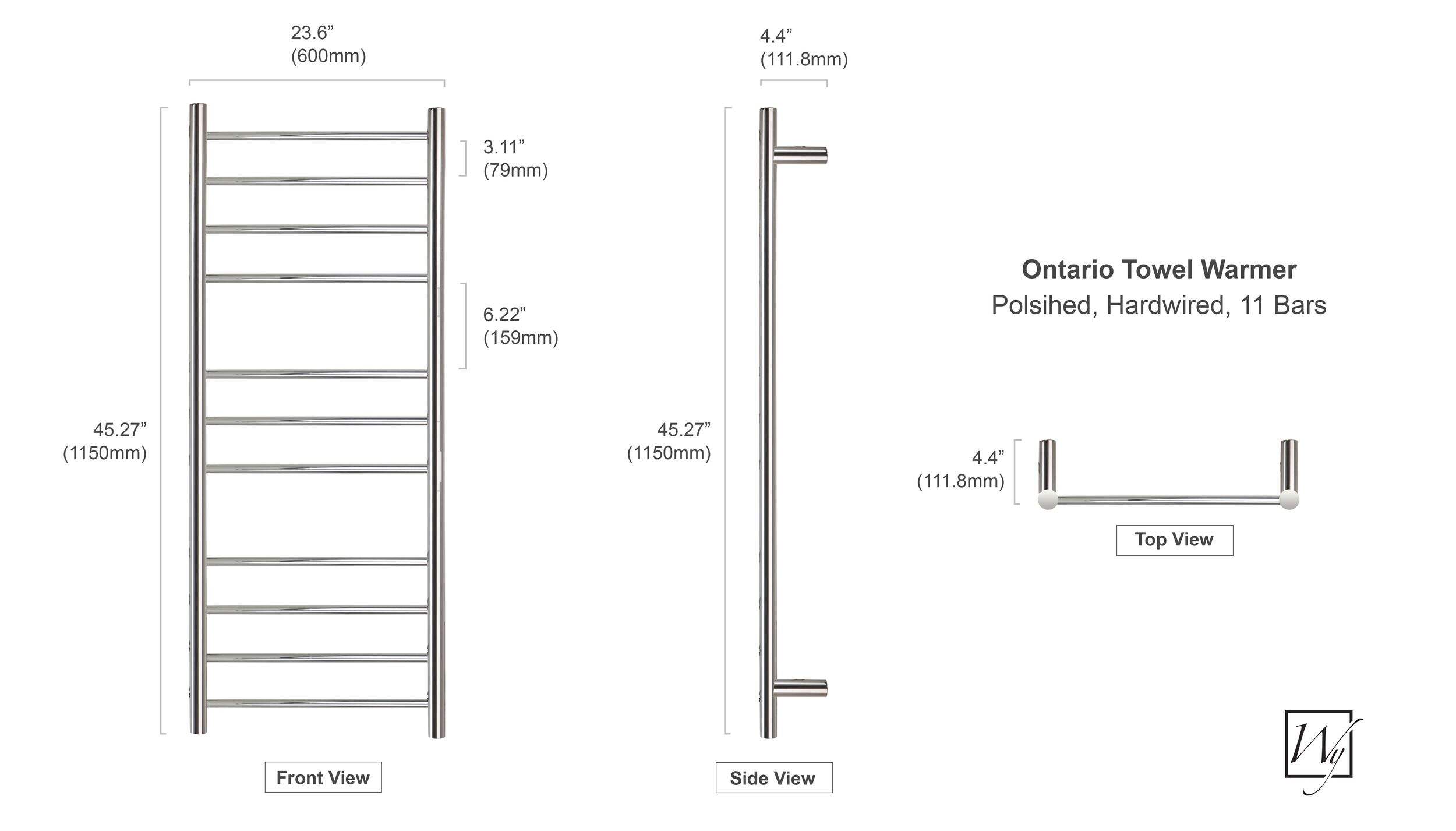 There’s no doubt that a towel warmer delivers comfort and luxury, but the Ontario XL from WarmlyYours is a perfect example of how functional an electric towel warmer can be. The economical Ontario XL’s distinctive size offers two immediate benefits: it can easily accommodate multiple towels and its heat output of 443 BTUs per hour is hard to beat for the price. The heat is delivered through 11 round bars that are spaced in groups of 4, 3, and 4. This orientation makes the Ontario XL well suited for heating and drying towels of different sizes. The polished finish and hardwired connection of this model is both streamlined and aesthetically pleasing. This model comes with built-in TempSmart™ overheat protection to prevent the unit’s surface temperature from exceeding 149°F (65°C).