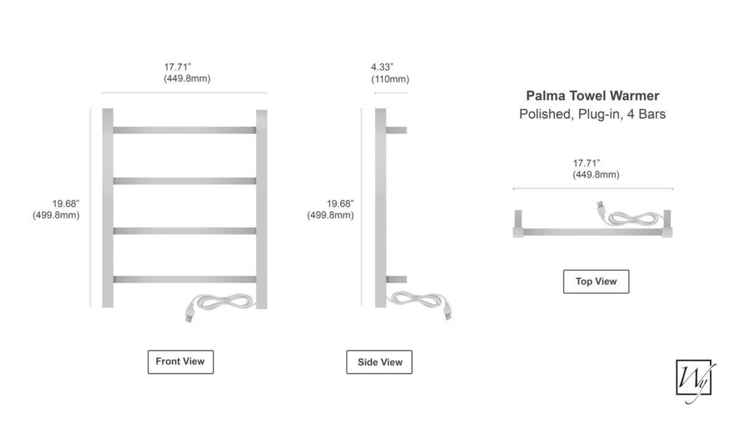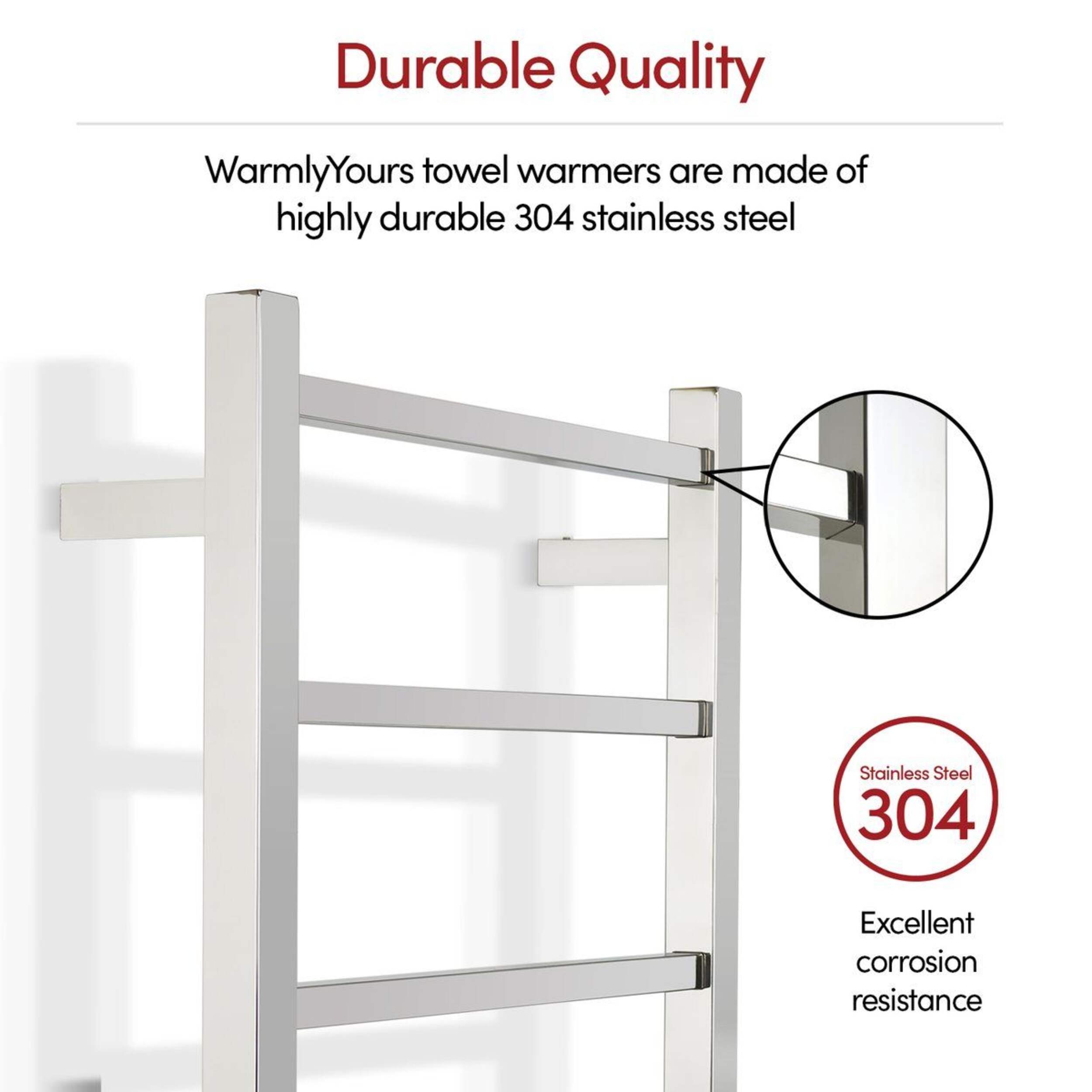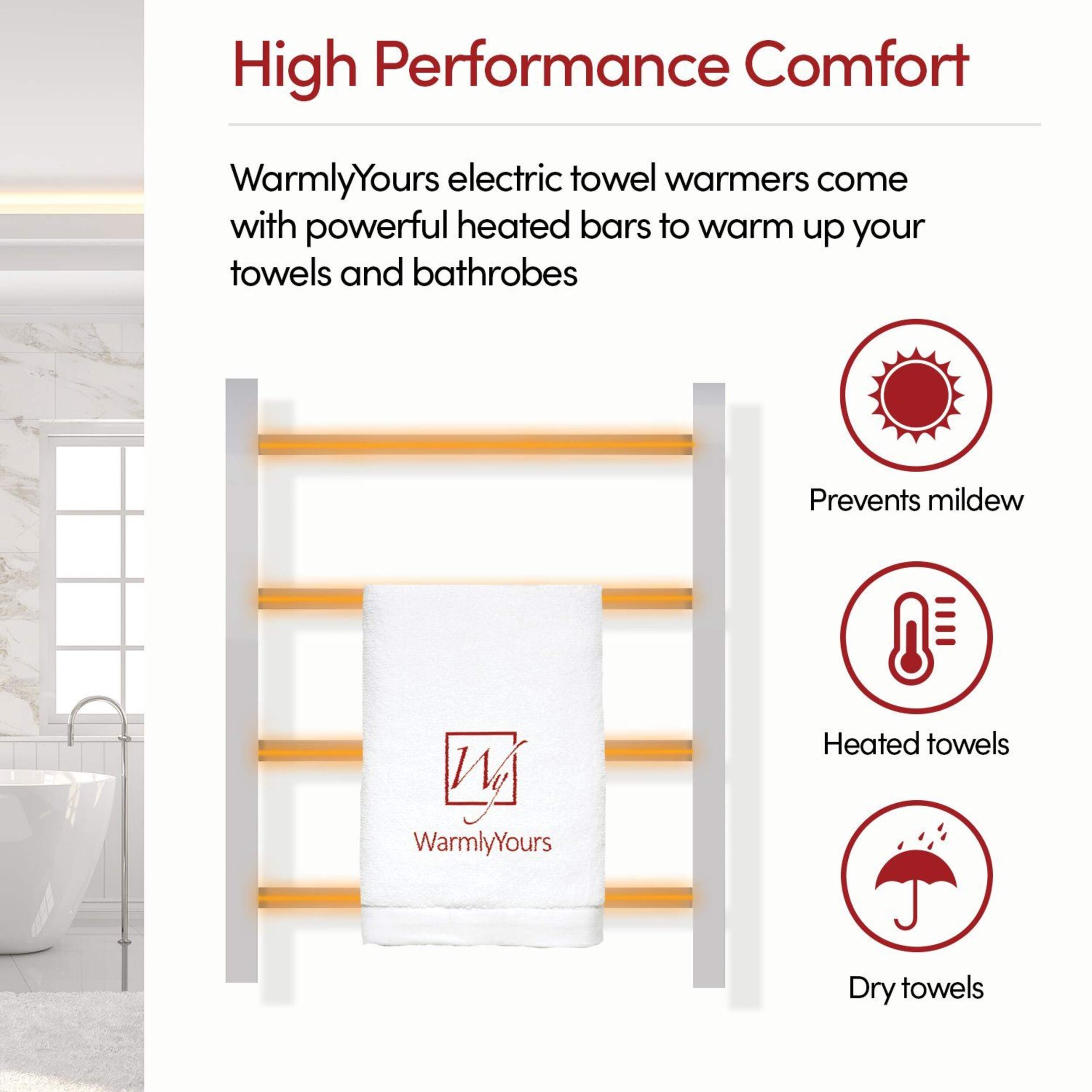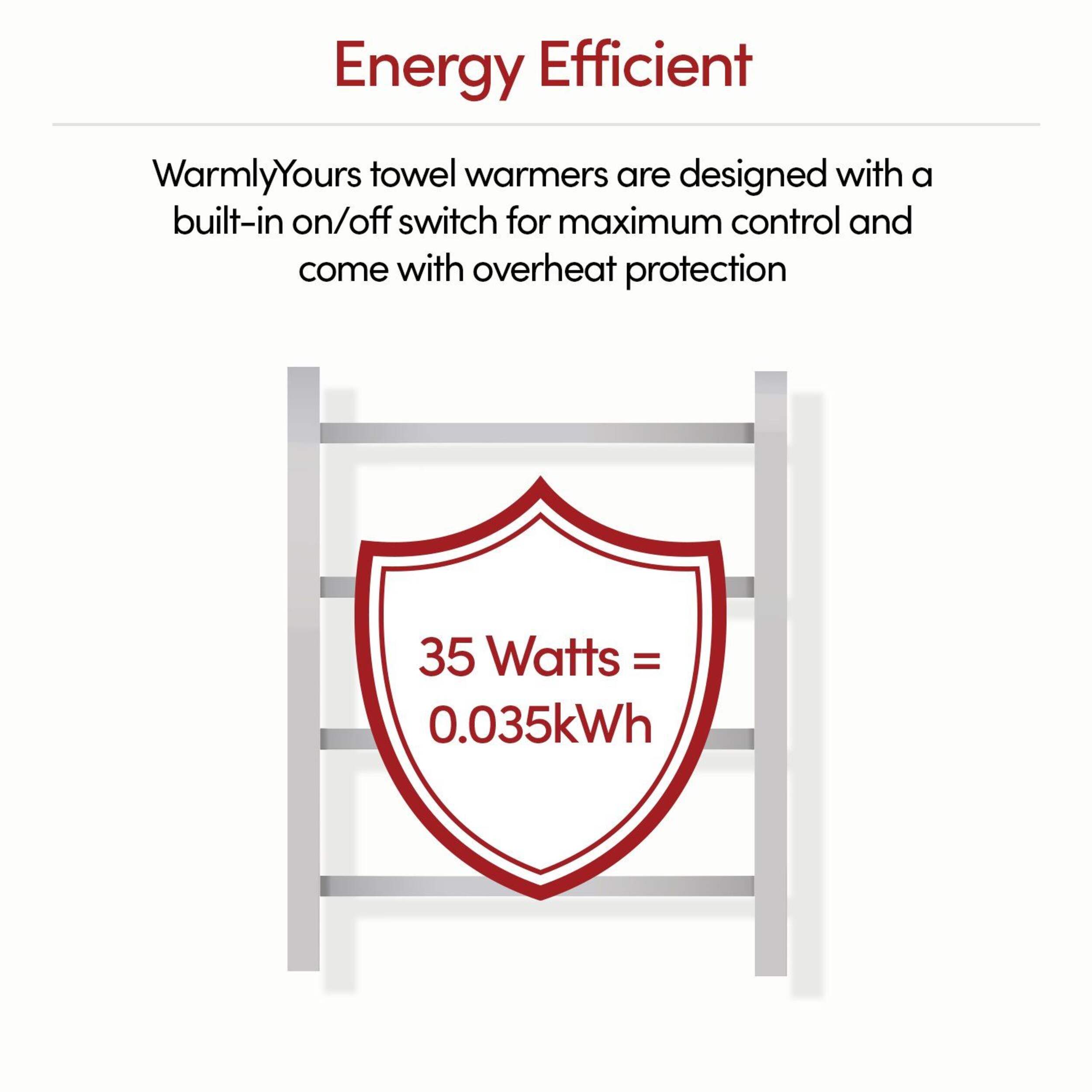 The compact and economical Palma towel warmer from WarmlyYours provides all of the functionality of larger models, while taking up less wall space. The 4 evenly spaced bars have a heat output of 119 BTUs per hour, which means this unit will not only warm your towels and bathrobes but it can also dry them between uses. This wall-mounted model, with its plug-in connection, is very DIY-friendly and its 304-stainless steel construction means that the Palma is durable and easy to maintain. The square bars, linear design, and highly polished finish means this unit will be a functional and attractive addition to any room. This model comes with built-in TempSmart overheat protection to prevent the unit’s surface temperature from exceeding 149F (65C).