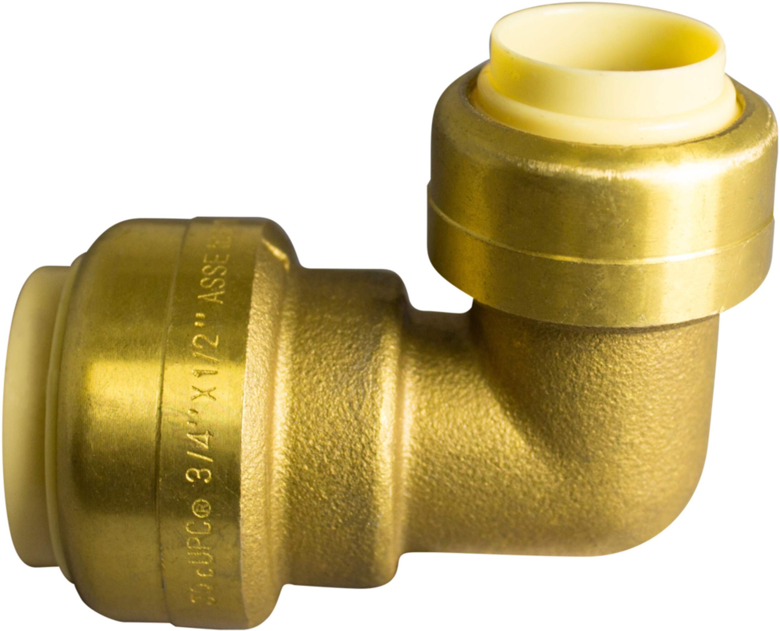 This Waterline 3/4 x 1/2-inch push-to-connect 90-degree elbow adapter allows contractors to easily join copper, CPVC and PEX piping at a 90-degree angle. The push-in fitting provides a secure, leak-free connection without requiring soldering or gluing. Certified to meet industry standards, this elbow adapter enables efficient on-site assembly of water supply lines. With pre-attached o-rings, the fitting pushes in and locks into place for a fuss-free way to route pipes around corners. This time-saving elbow adapter lets professionals optimize workflow and complete jobs quickly.