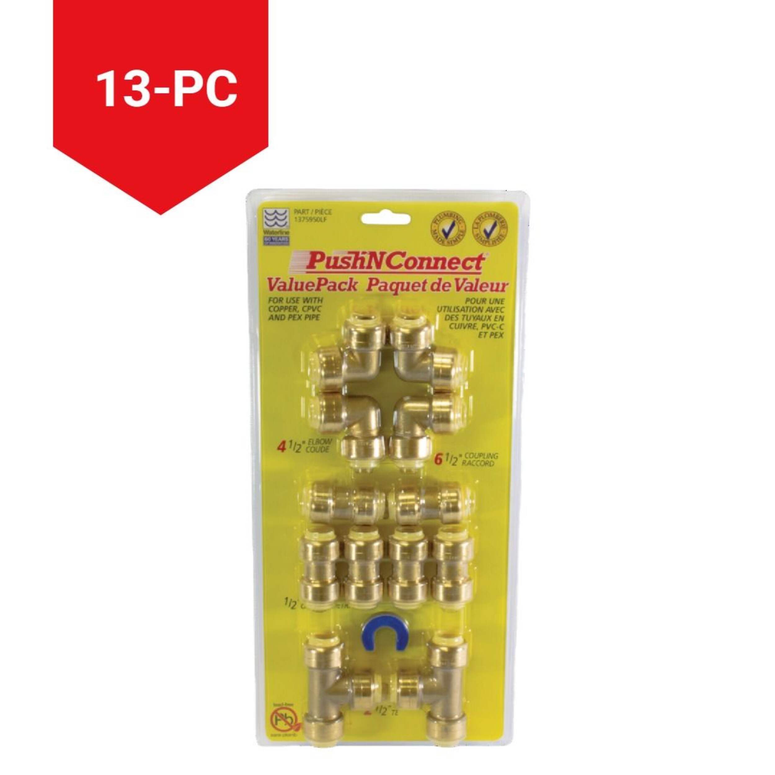 The Waterline Push N' Connect Plumbing Fittings Value Pack includes 13 easy-to-use fittings designed for both potable water distribution and hydronic heating applications. These innovative push-fit fittings allow for quick and secure connections, making them perfect for DIY enthusiasts tackling plumbing projects at home. The unique design enables fittings to be rotated on the pipe after installation, providing flexibility in tight spaces. With this value pack, you have all the essentials needed for seamless plumbing repairs or installations without the hassle.