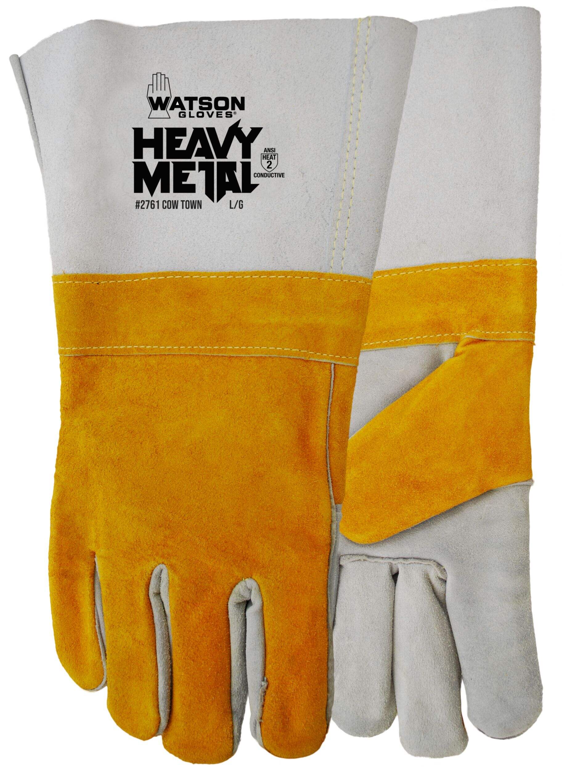 The Watson Gloves Cow Town Welding Glove features a premium split cowhide leather with full cotton fleece lining with foam lined back