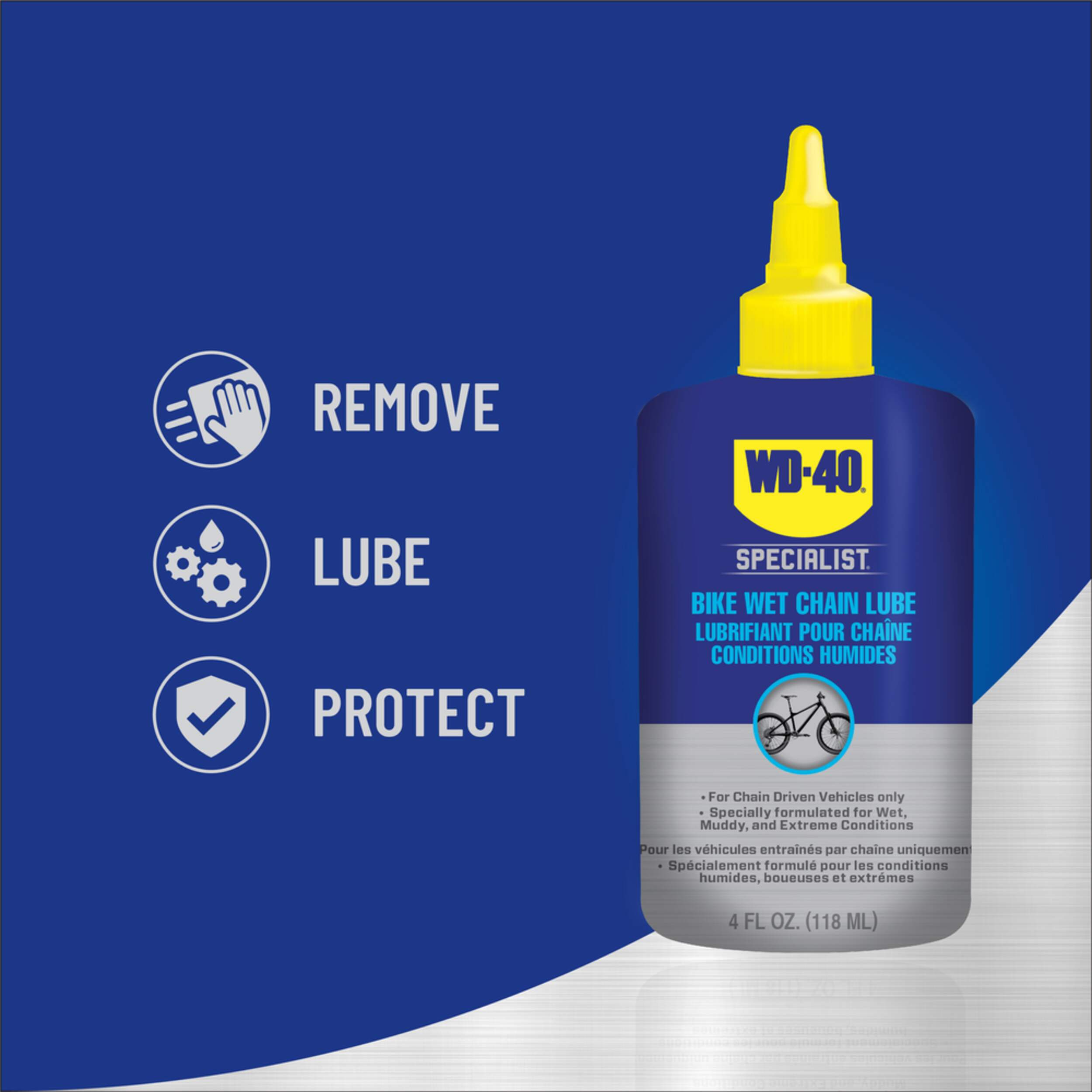 The secret for a smooth ride in any weather is proper chain lubrication. WD-40 Specialist® Bike Wet Chain Lube is specially formulated to repel water and mud, keeping your chain protected no matter how wet or muddy the conditions. The non-sticky formula ensures a smooth ride every time you cycle, while the drip bottle allows for quick and easy application. With 118 ml of lube at your fingertips, you'll be ready for rain, sleet or slush - and your bike chain will keep spinning with minimal effort.