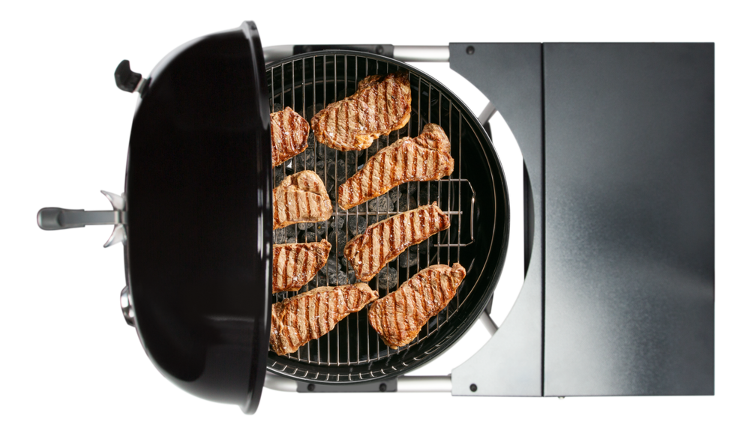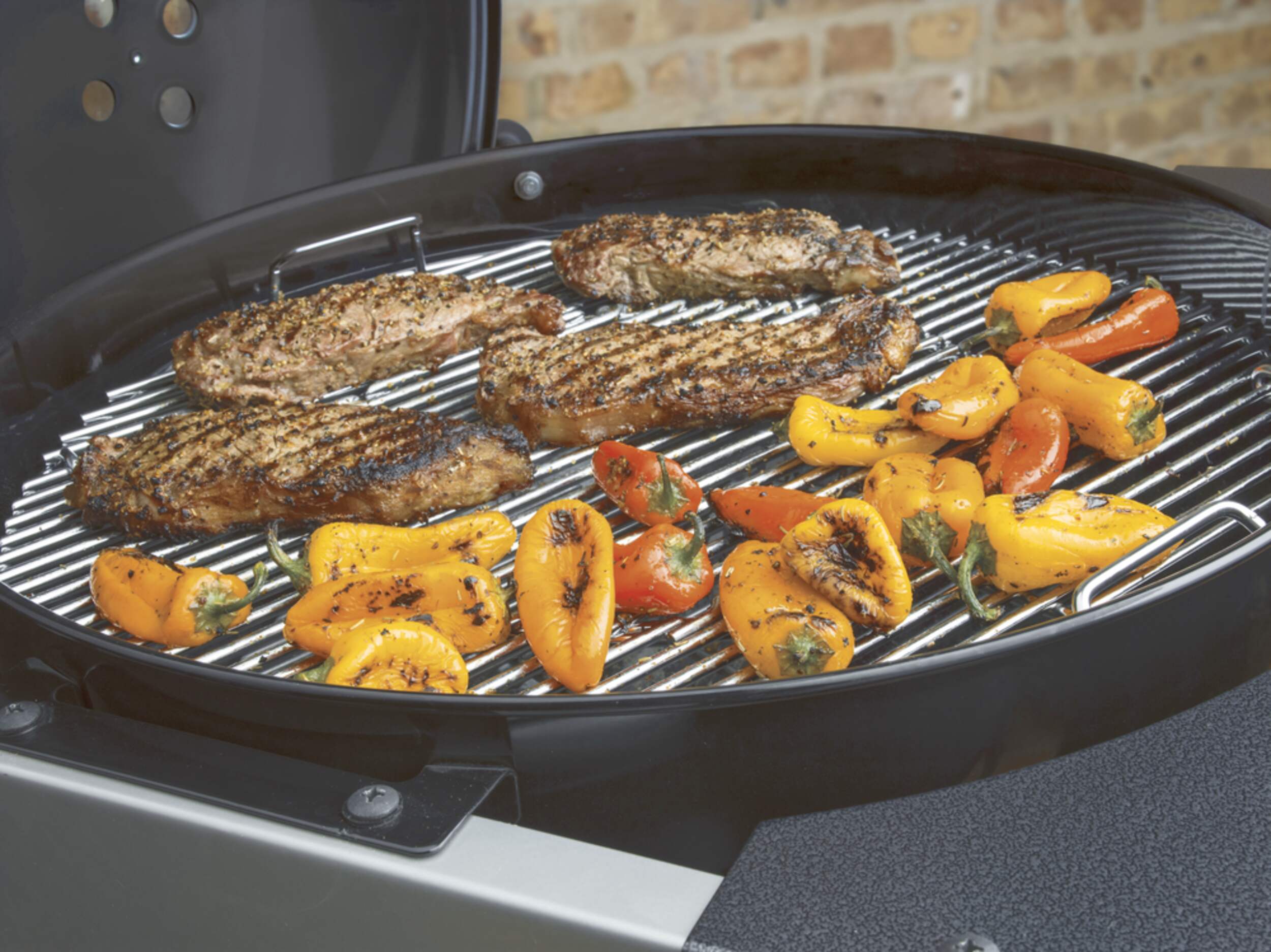 Hinged steel cooking grate allows easy access for adding charcoal while grilling