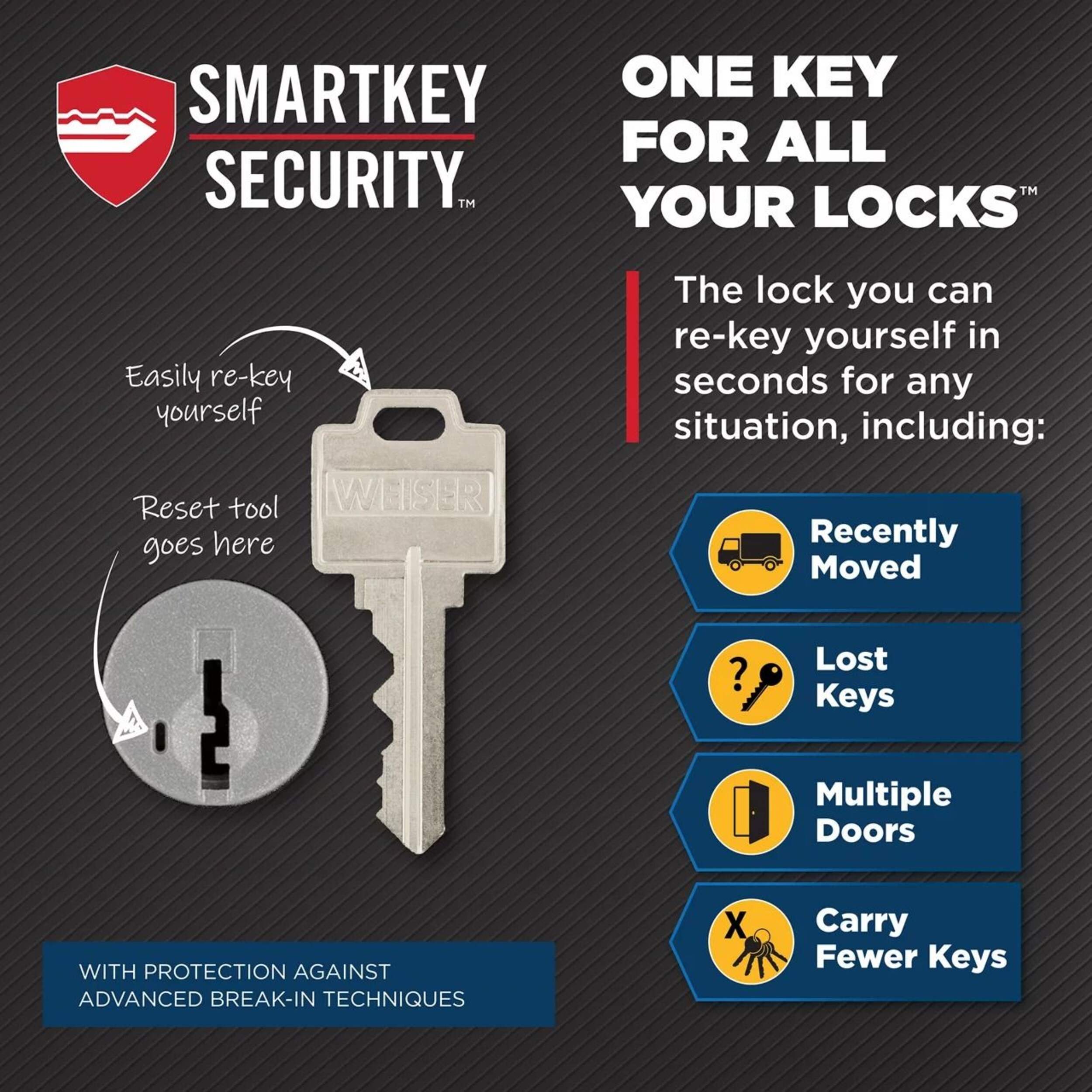 SmartKey® re-key technology allows you to quickly re-key the lock yourself in 3 easy steps