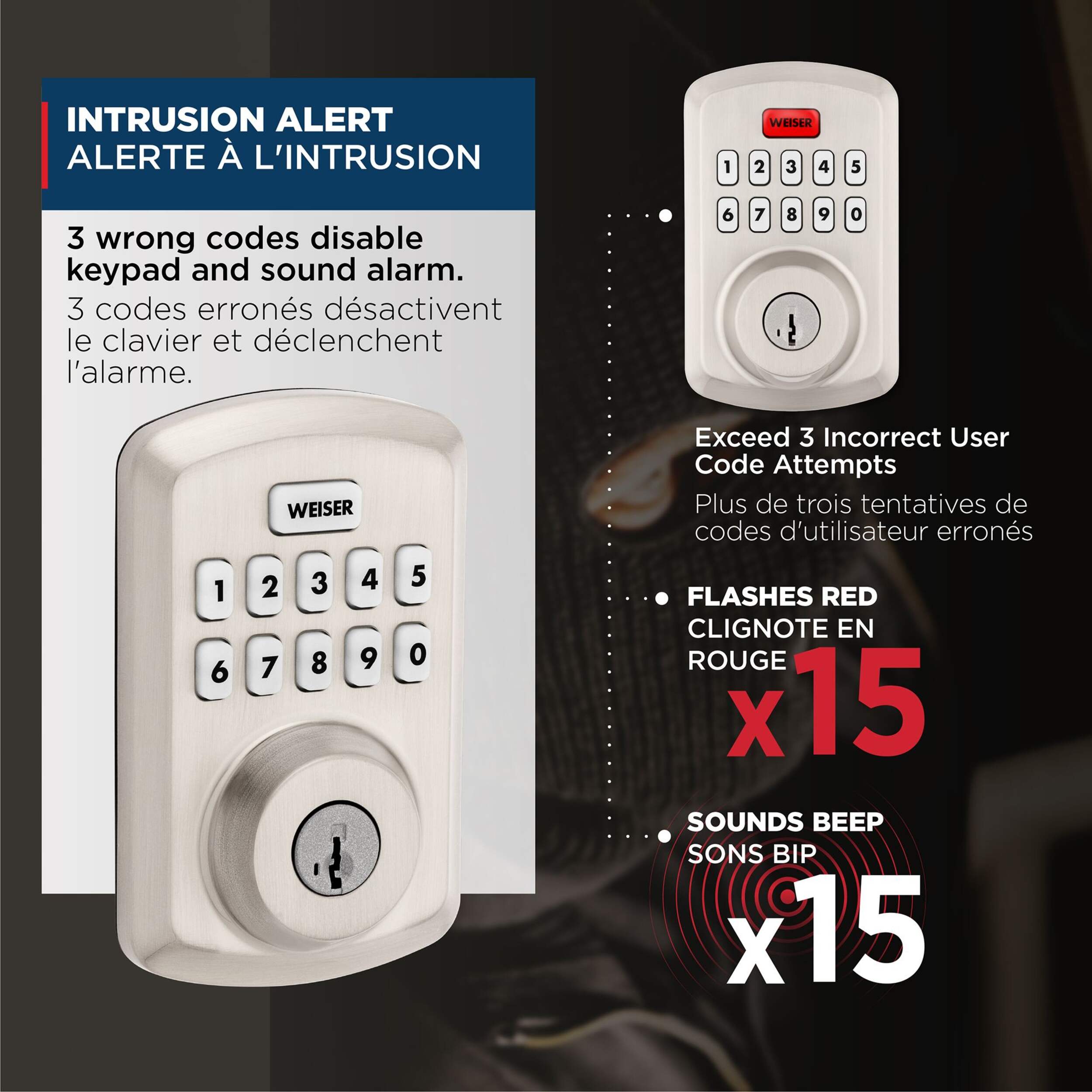 Upgrade your home security with the Weiser Powerbolt 3 Electronic Deadbolt Door Lock. Effortlessly access your home using keypad entry and customizable access codes for hassle-free entry. The auto-lock feature secures your door after a preset delay, enhancing safety. With SmartKey technology, you can easily re-key the lock for added convenience. Plus, built-in intrusion alerts activate a 1-minute alarm and lockout after three incorrect code entries, helping to ensure your home remains secure at all times.