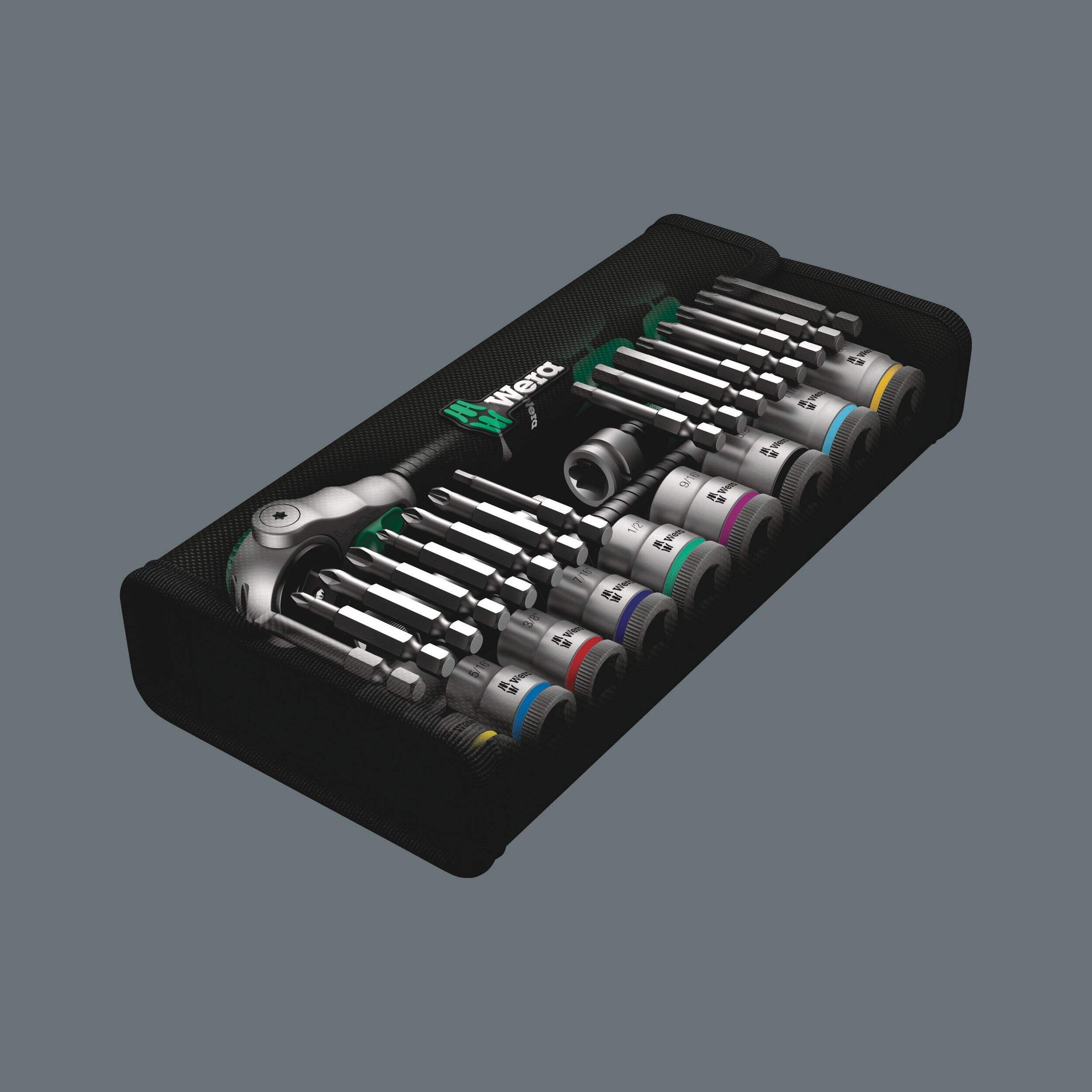 Enjoy the convenience of having every tool you need at hand with the Wera 3/8-in Drive Socket Set. This incredibly compact socket set features Zyklop Speed Ratchets for quick changes and faster screwdriving, anti-rounding sockets and easy-to-read markings. With a comfortable, ergonomically designed handle for a secure grip, colour-coded ratchets for accurate sizing, and a handy snap hook for fastening to a belt loop, this durable and corrosion-resistant set is an ideal addition to any workshop.