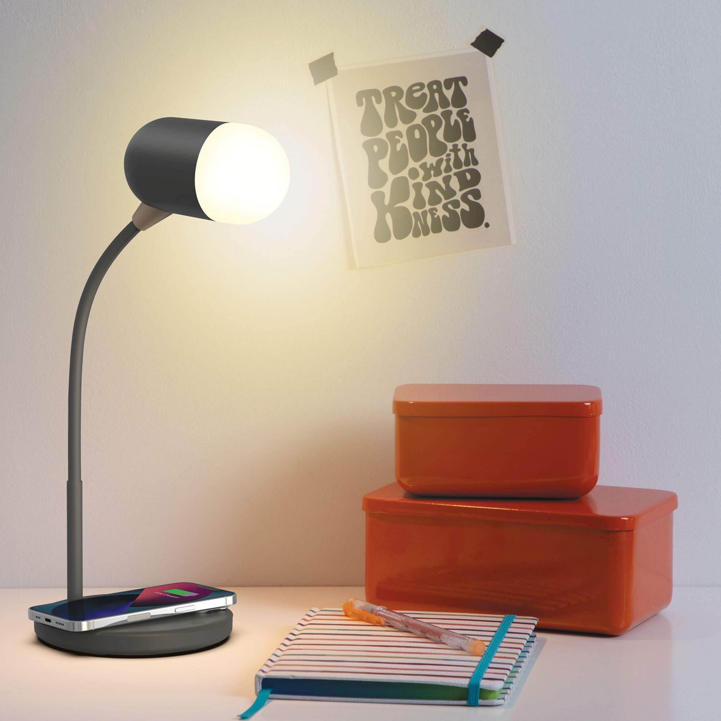 The West & Arrow LED Desk Lamp with Wireless Charging Base and Flexible Neck effortlessly blends style and practicality. Equipped with a wireless charging base, it supports a variety of devices for added convenience. With adjustable colour temperatures, it caters to different lighting needs, ensuring optimal comfort for any task. The flexible neck allows for easy, precise positioning, while its minimalist design makes it a perfect fit for any workspace. Illuminate your desk with this functional, sleek lamp that keeps you organized and powered up.
