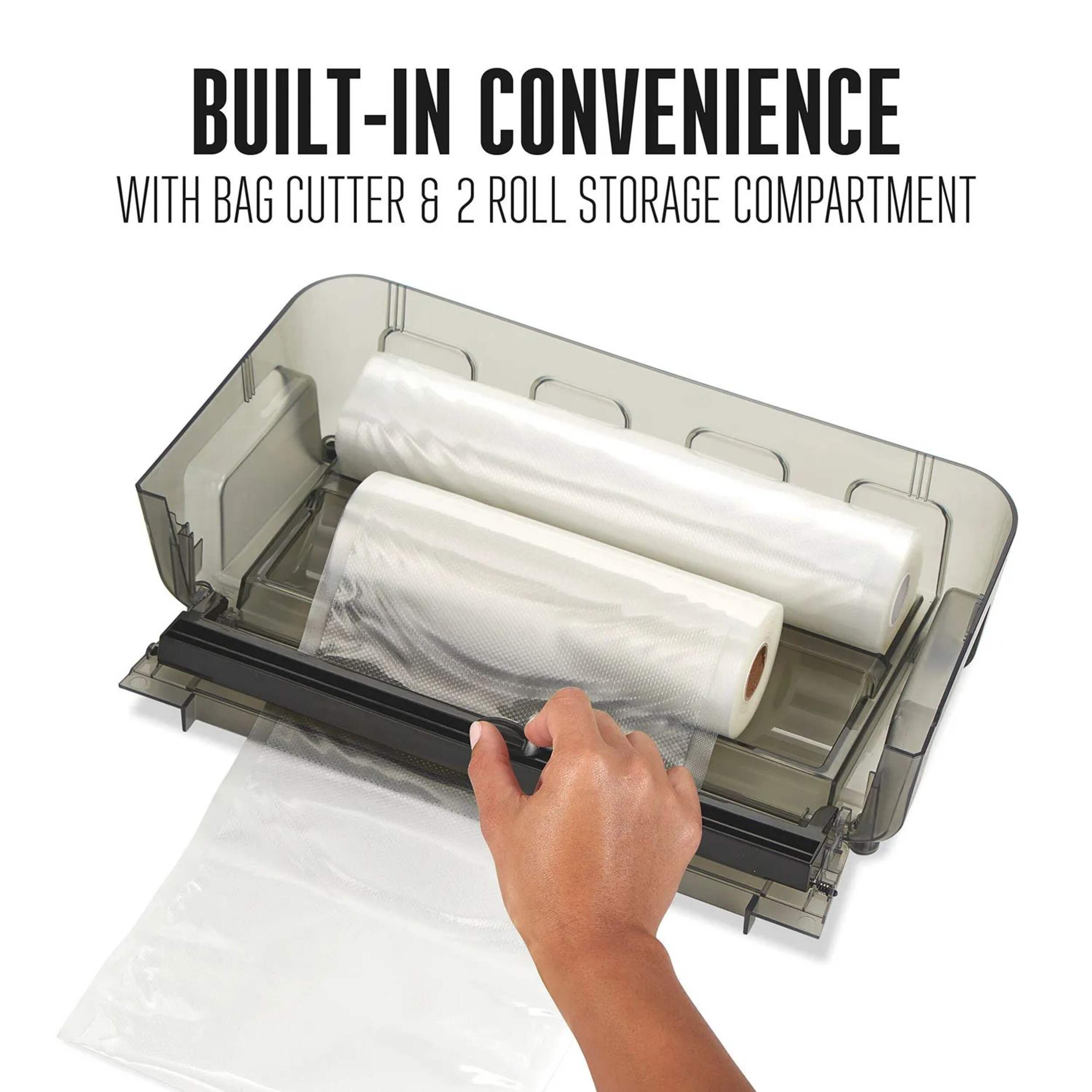 Built-in convenience with unique 2 roll storage compartment and bag cutter