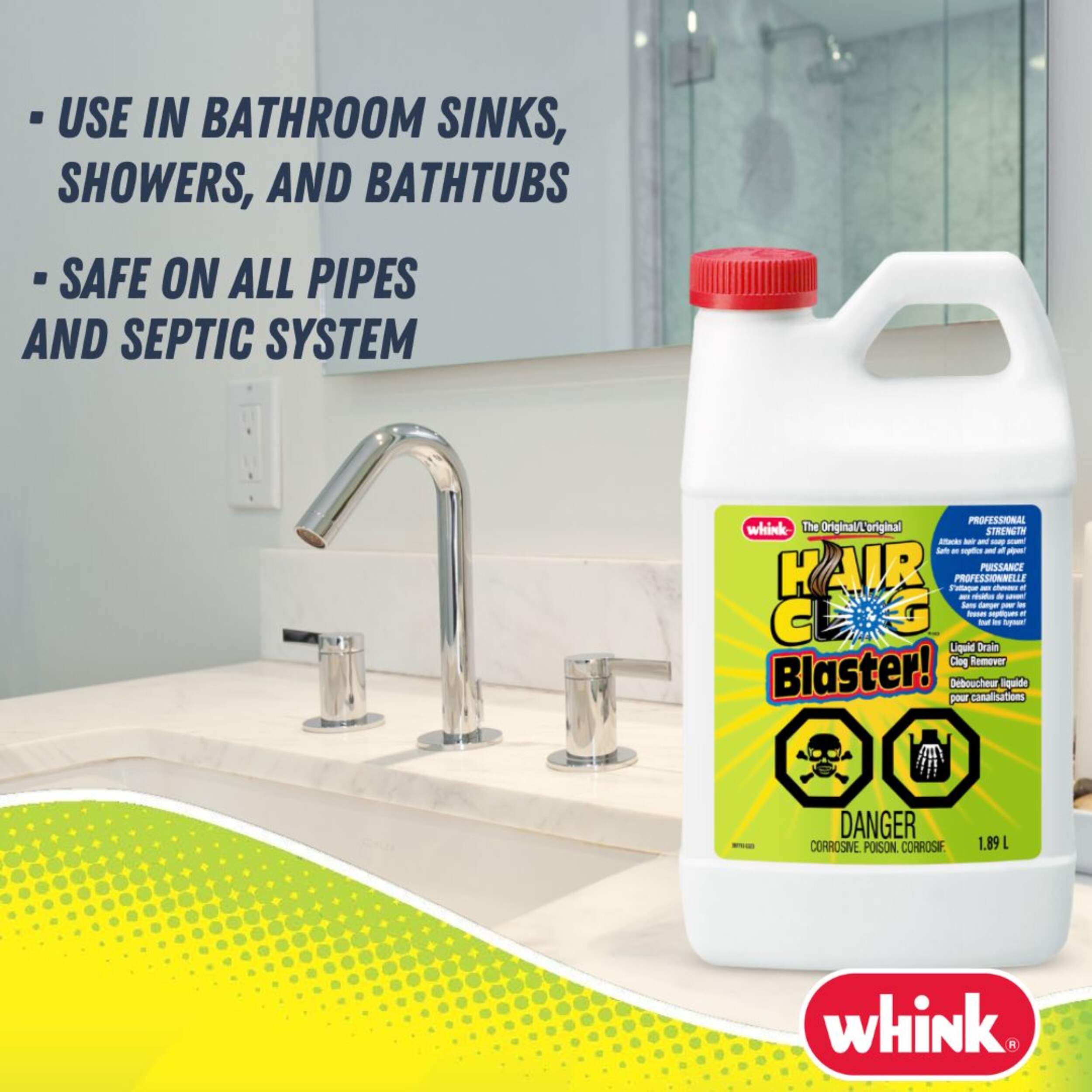 Whink Hair Clog Blaster Liquid Drain Clog Remover pours right through standing water to quickly target and break down stubborn hair clogs. This professional-strength formula tackles hair and soap scum buildup in a way that's safe for use in all varieties of pipes and septic systems. Simply pour the clog remover down the drain and let it break apart the blockage, so water flows freely once more.