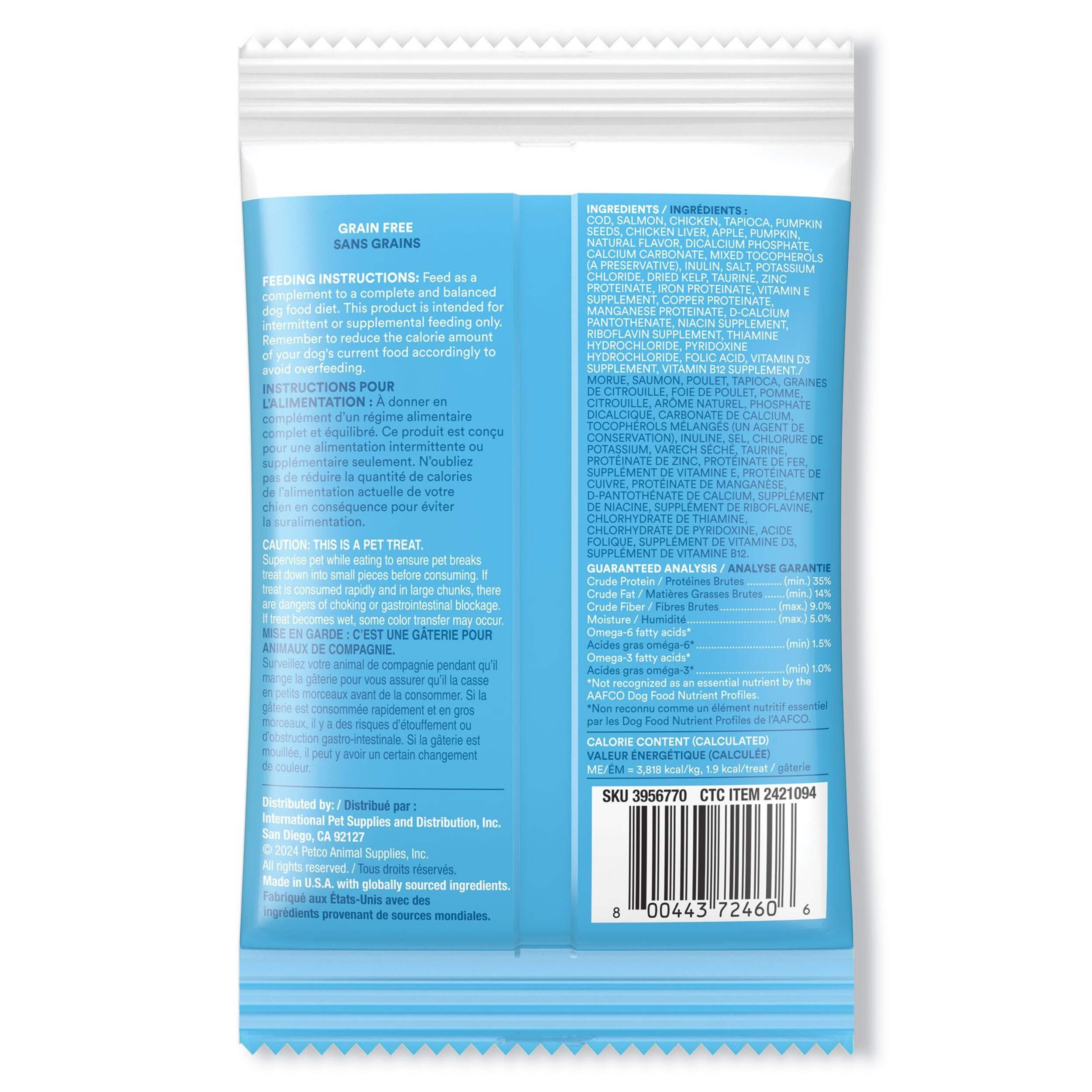 Contains cod, salmon, chicken, pumpkin seeds, chicken liver, apples, pumpkin, kelp, and vitamins