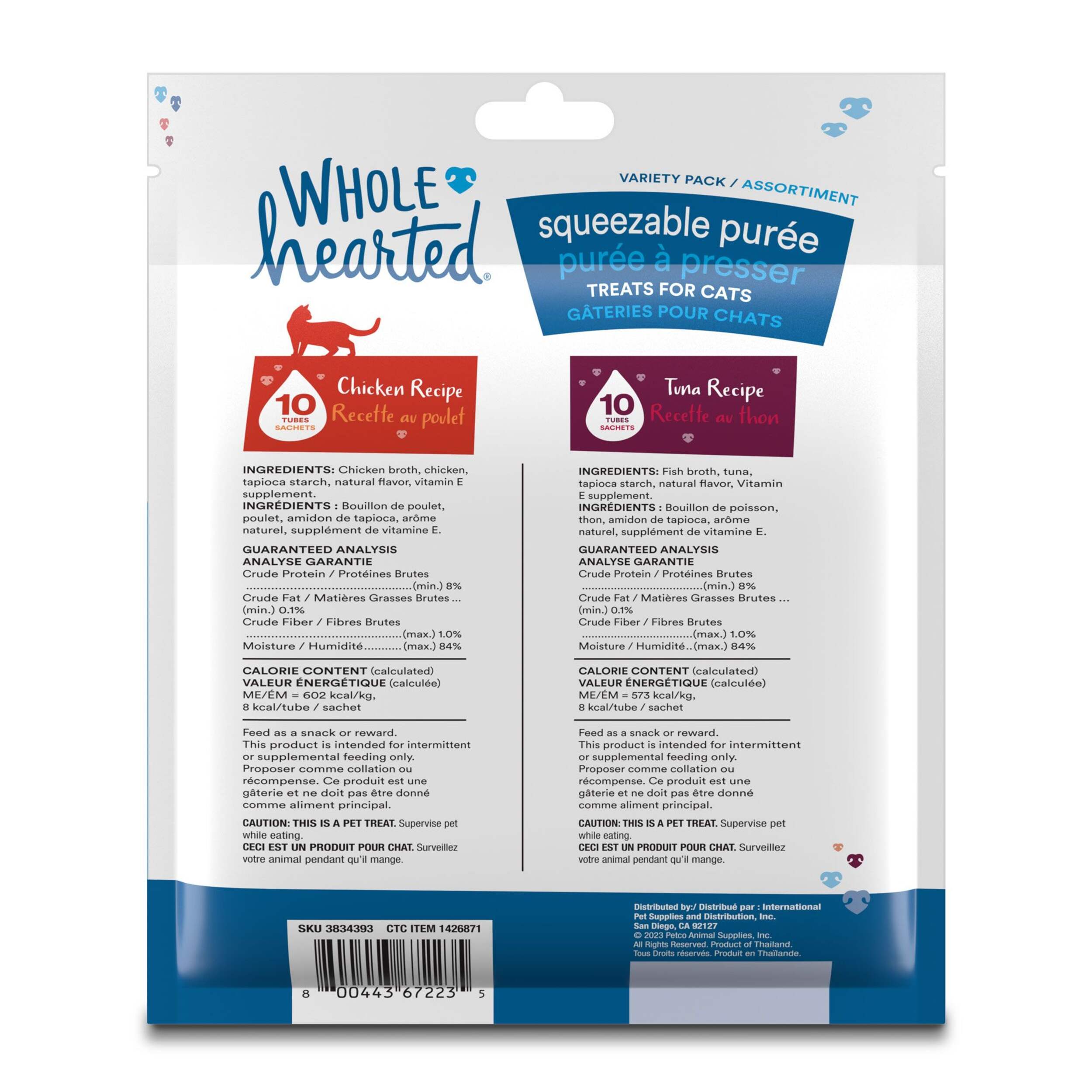 The WholeHearted Squeezable Purée Wet Cat Food Variety Pack features two grain-free recipes packed into easy-squeeze pouches for a tasty treat. These individual chicken and tuna recipes contain 5 simple ingredients with no artificial colours, flavours, or preservatives. Tear open and squeeze these lickable purées right onto your cat's dry food as a topper, or let them lick straight from the tube for an interactive feeding experience. With convenient single-serve pouches, this cat food variety pack makes on-the-go treating easy.
