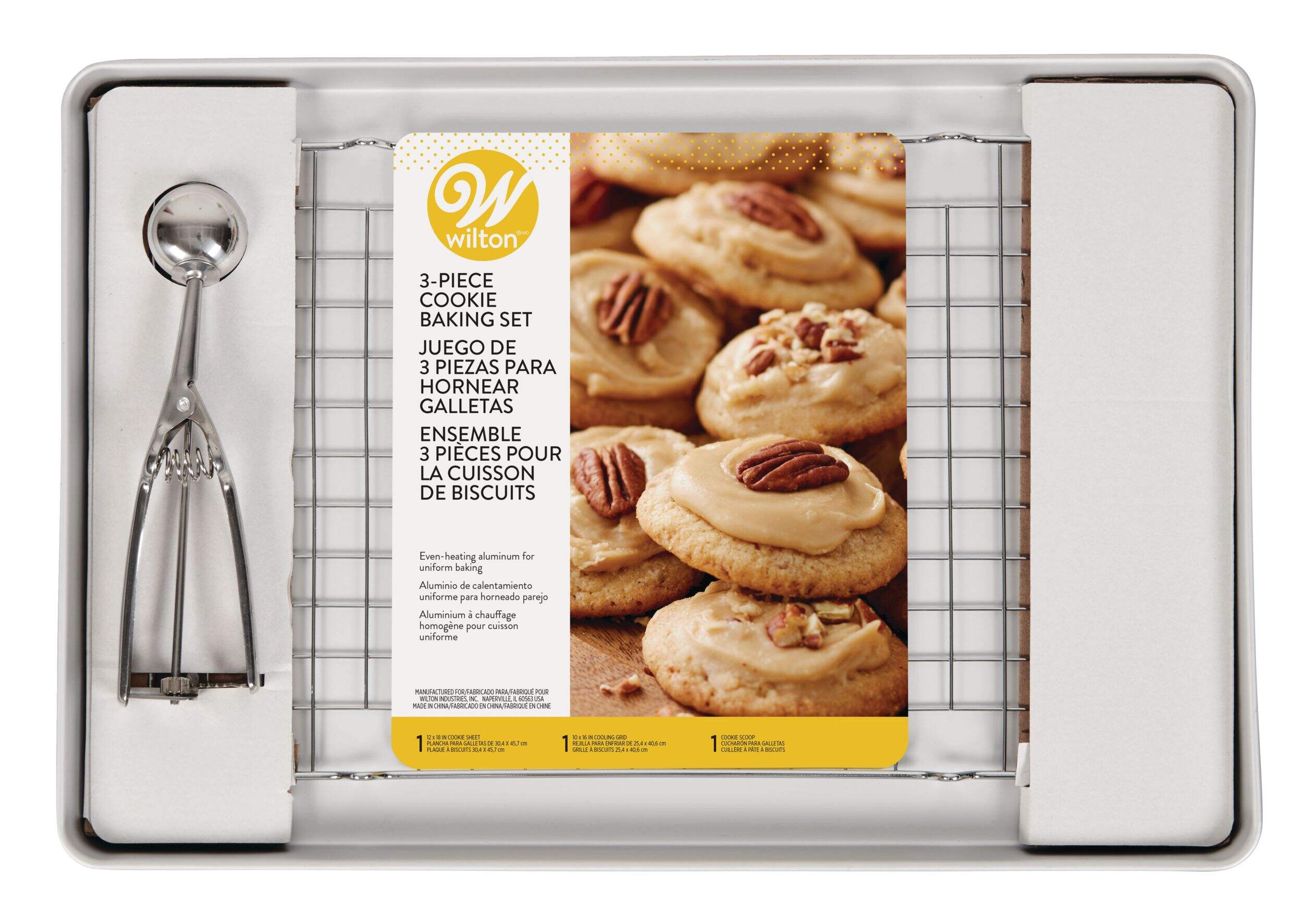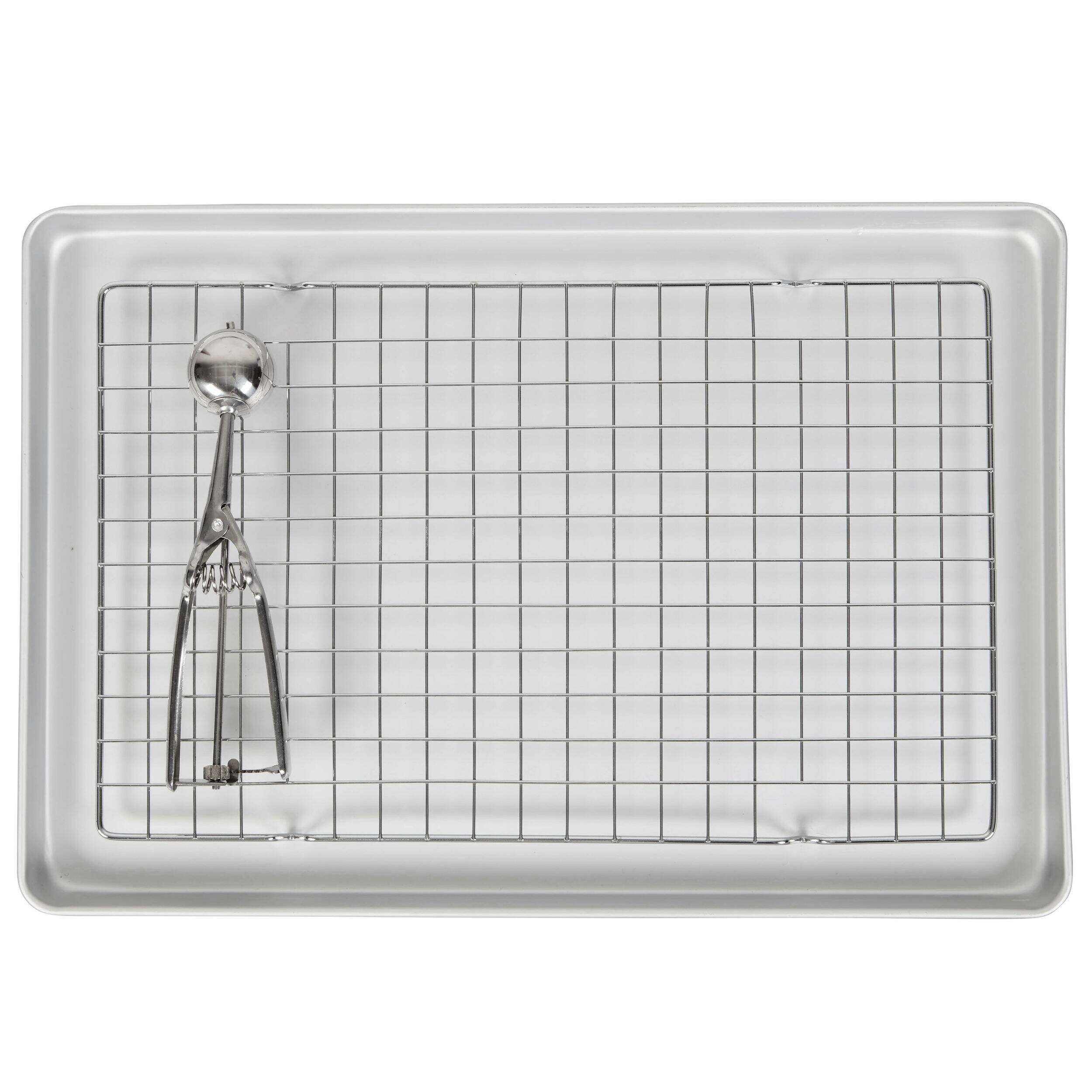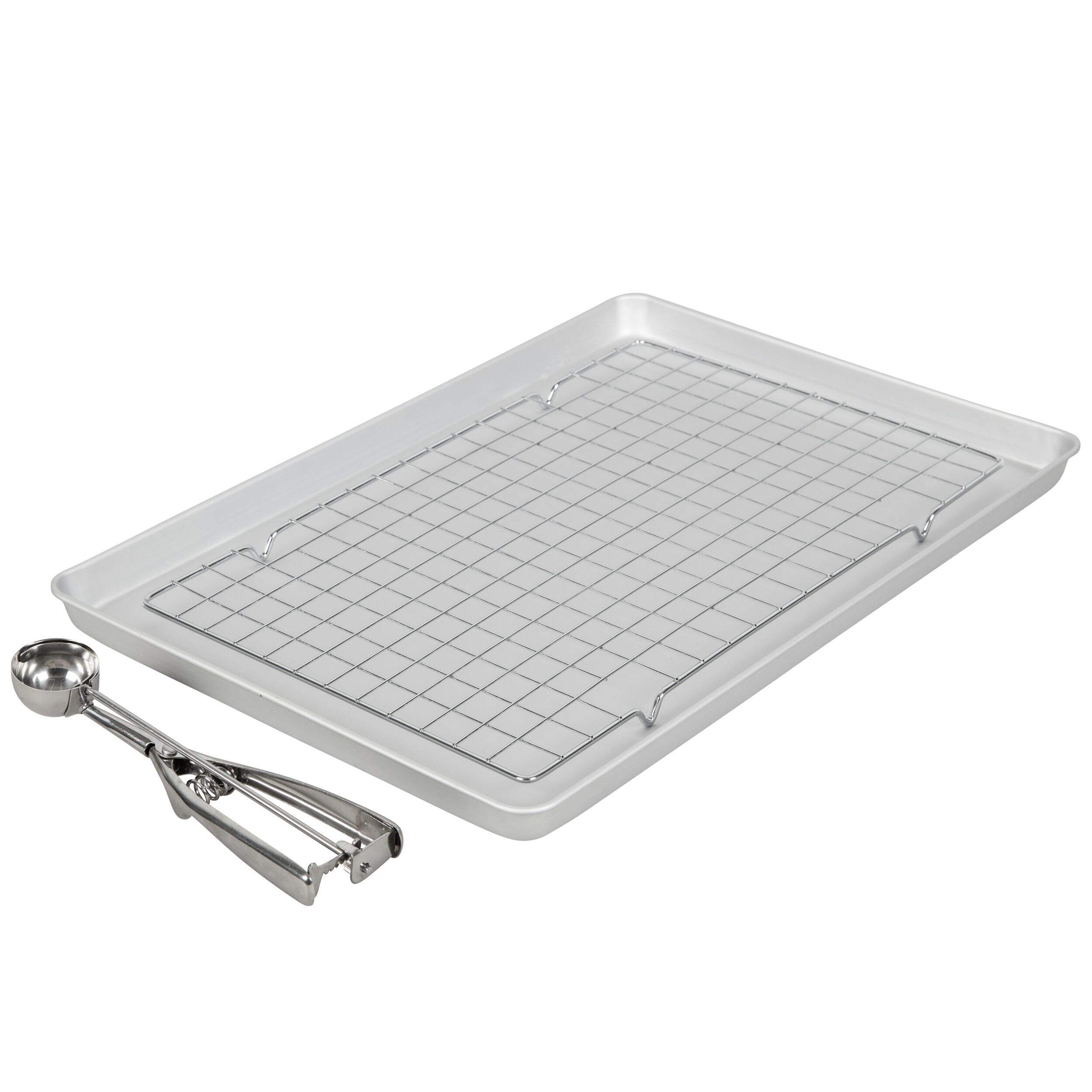 Includes cookie sheet, stainless steel cookie scoop and chrome cooling rack