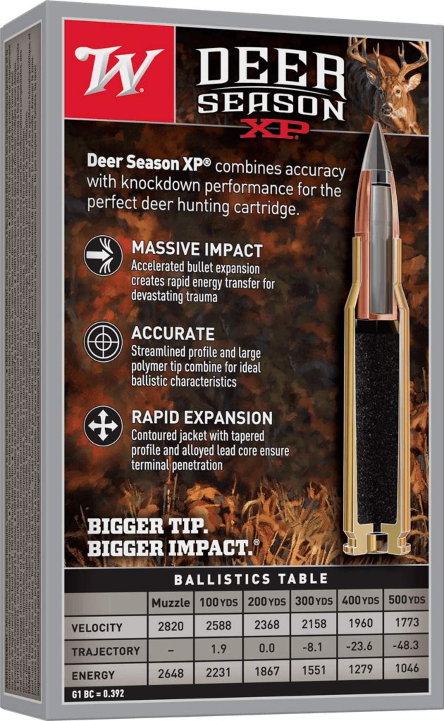 Deer Season XP combines decades of Winchester experience into the perfect choice for deer hunting ammunition. Accuracy, combined with massive bullet impact performance means that Deer Season XP is a great choice for all deer hunters. Suitable for use on Whitetail, Mule and Blacktail Deer.