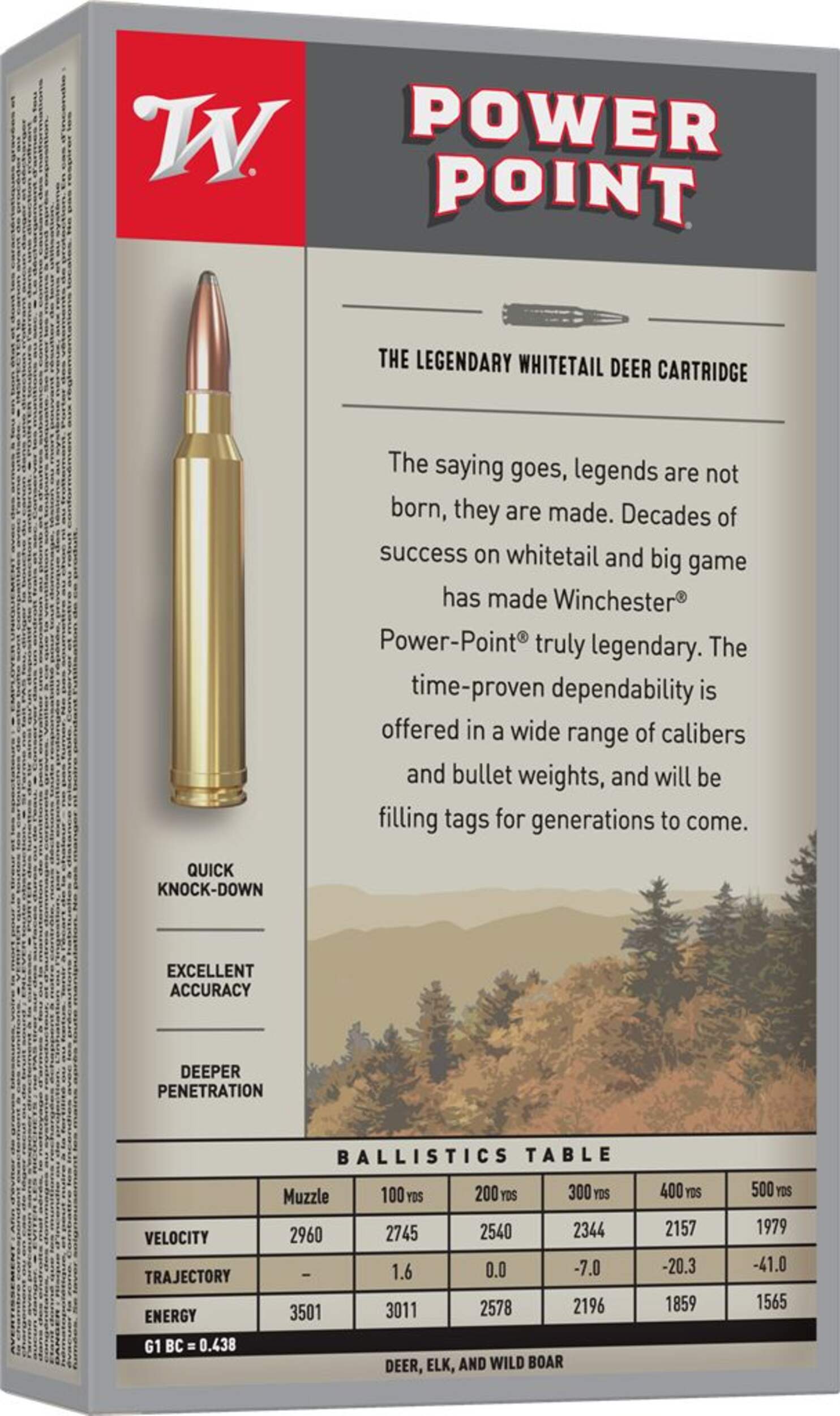 The saying goes, legends are not born, they are made. Decades of success on whitetail and big game has made Winchester® Power-Point® truly legendary. The time-proven dependability is offered in a wide range of calibers and bullet weights, and will be filling tags for generations to come.