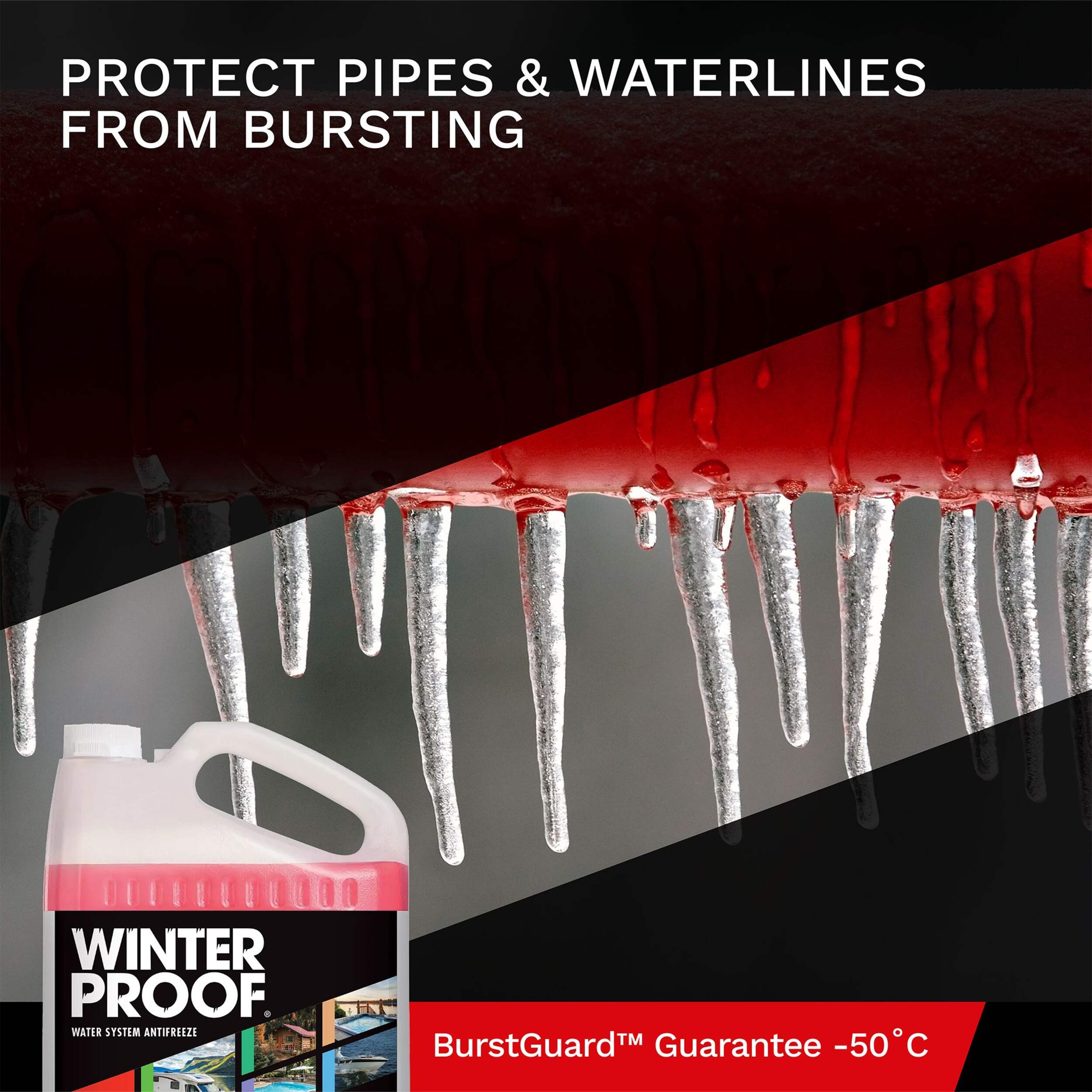 WinterProof™ All Purpose Water System Antifreeze helps you head into the off season with confidence. This ready-to-use formula protects your most valuable properties' plumbing from cracking, bursting, and other freeze damage. Safe to use for metal and plastic pipes, this antifreeze is specially formulated for recreational vehicles (RVs), cottages, swimming pools, boats (waterlines only), and more.