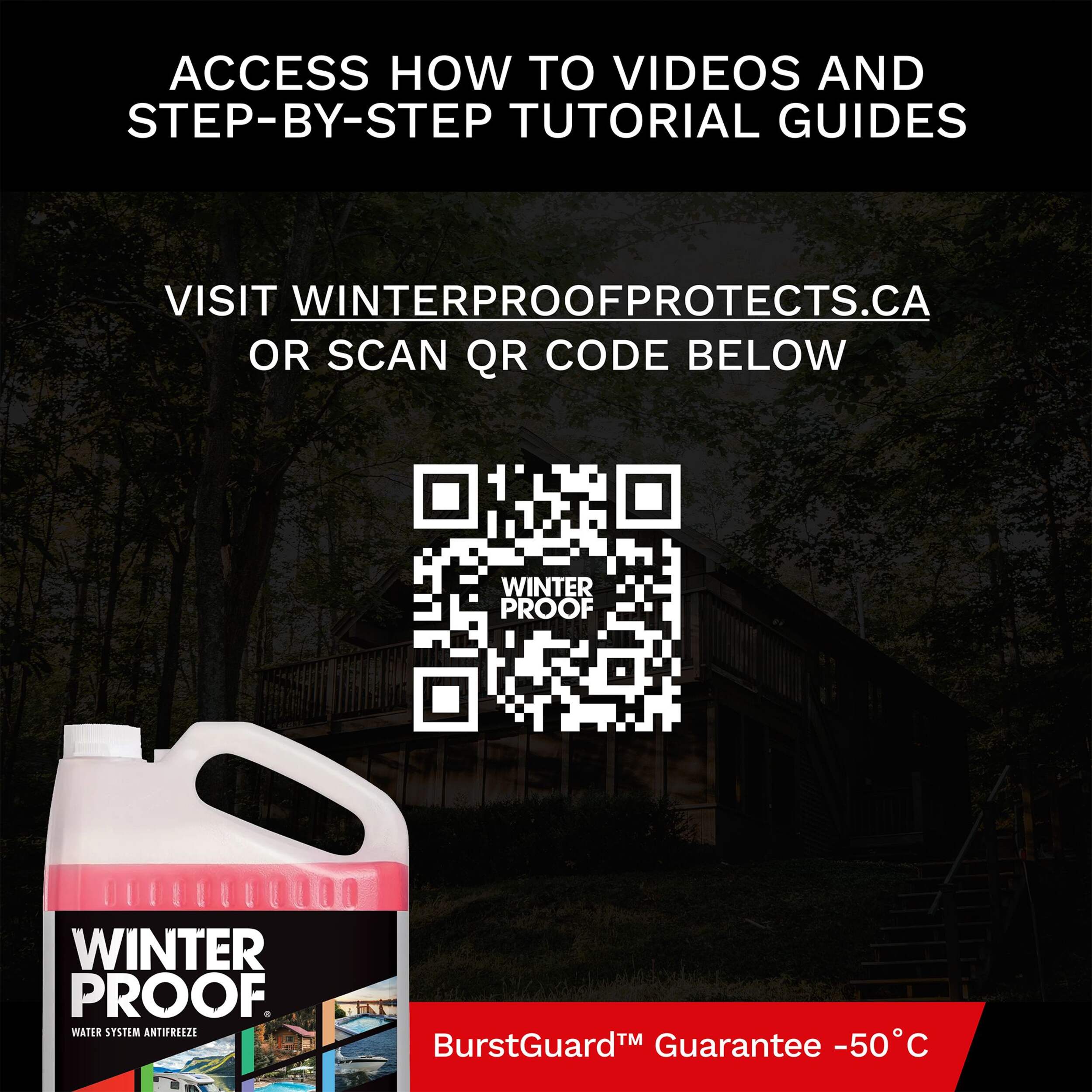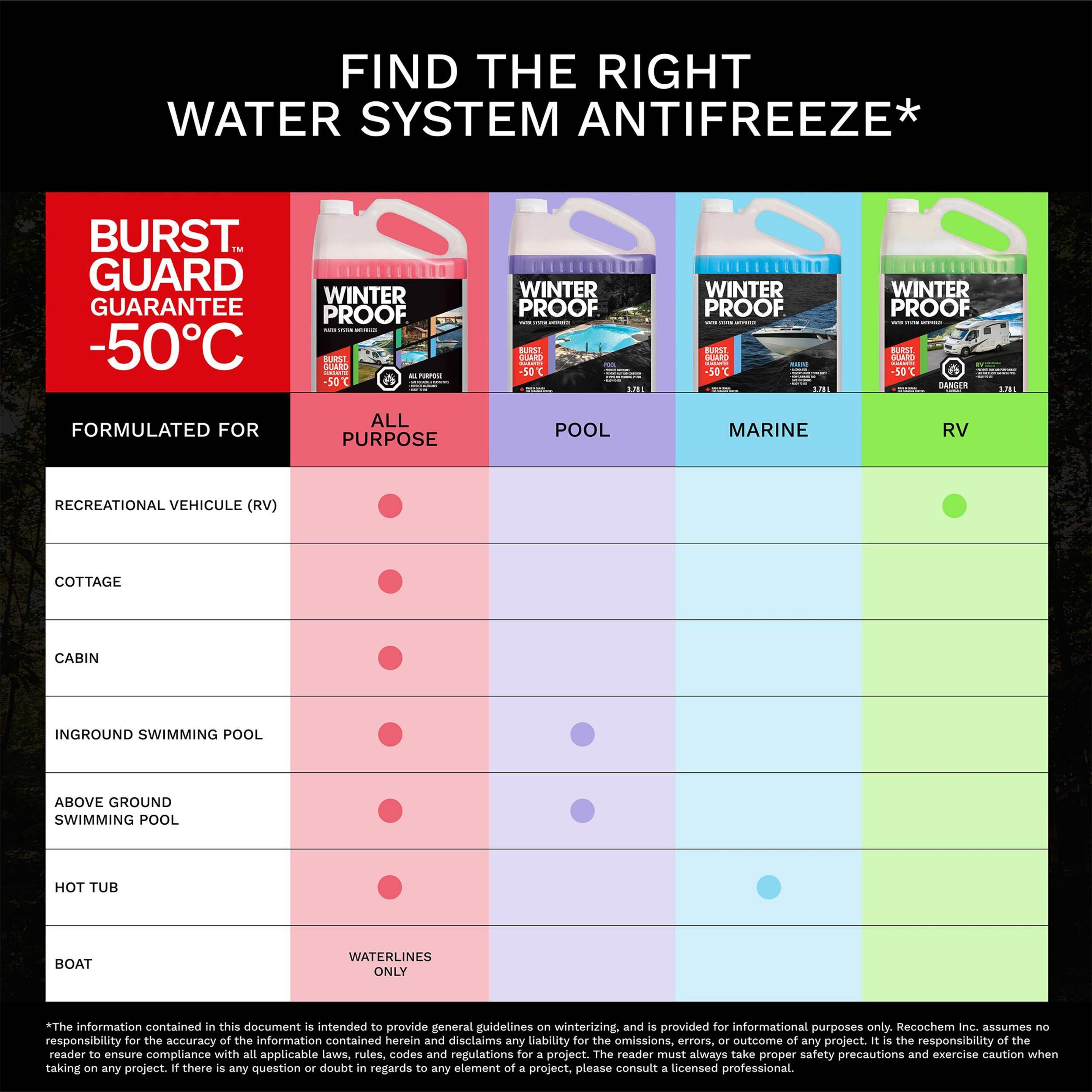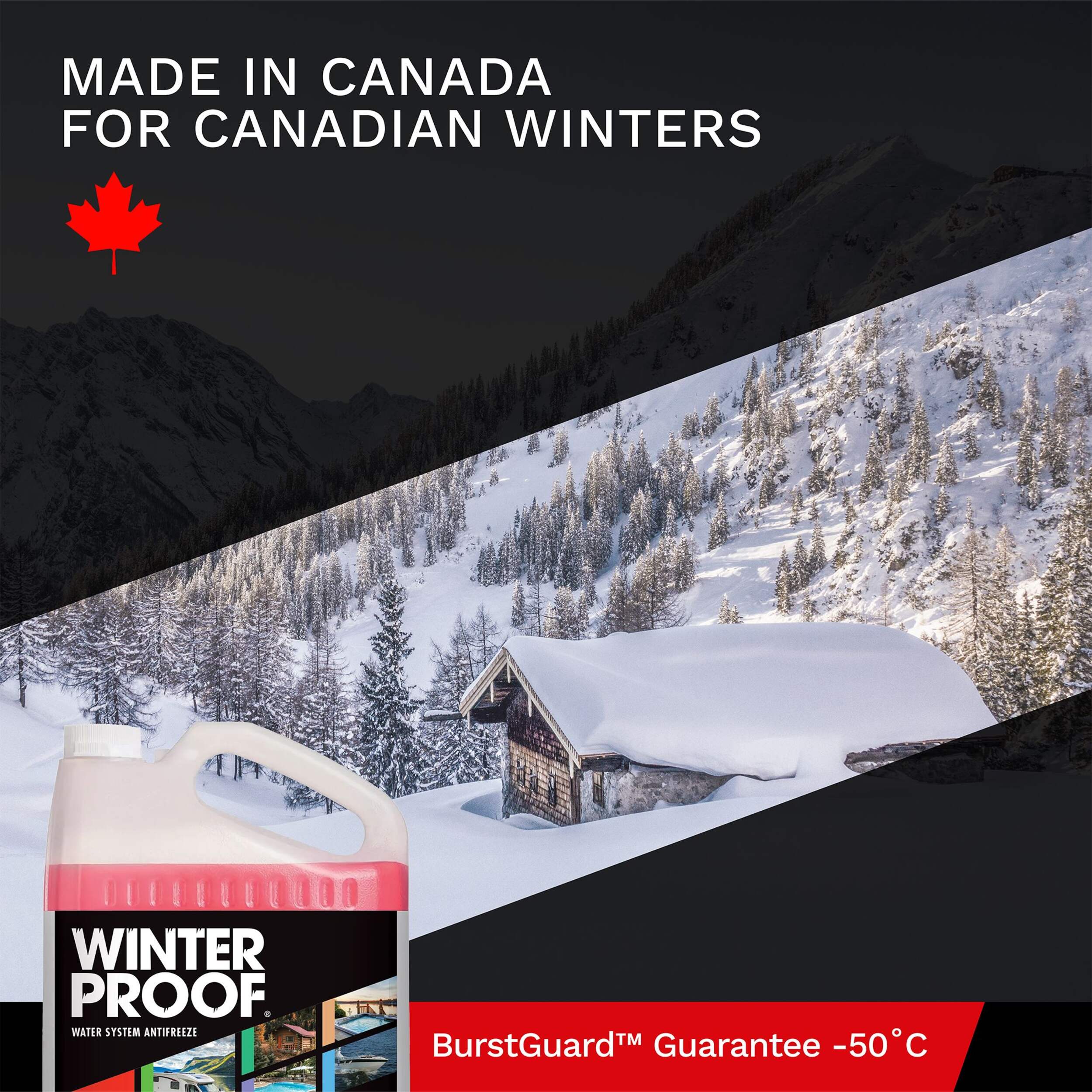 WinterProof™ All Purpose Water System Antifreeze with BurstGuard™ Guarantee -50°C gives you peace of mind in harsh Canadian winters. Avoid expensive and unexpected repairs with our ready-to-use formula that helps protect your most valuable properties' plumbing from cracking, bursting and other freeze damage. It's safe for winterizing metal and plastic pipes, preventing rust and corrosion. This formula also lubricates waterlines, pipes, and seals, ensuring a worry-free transition when the weather warms up. Plus, it is formulated to winterize all types of water systems from camper trailers, RVs, inground or above-ground pools, hot tubs, cottages, cabins, boats (waterlines only), and more.