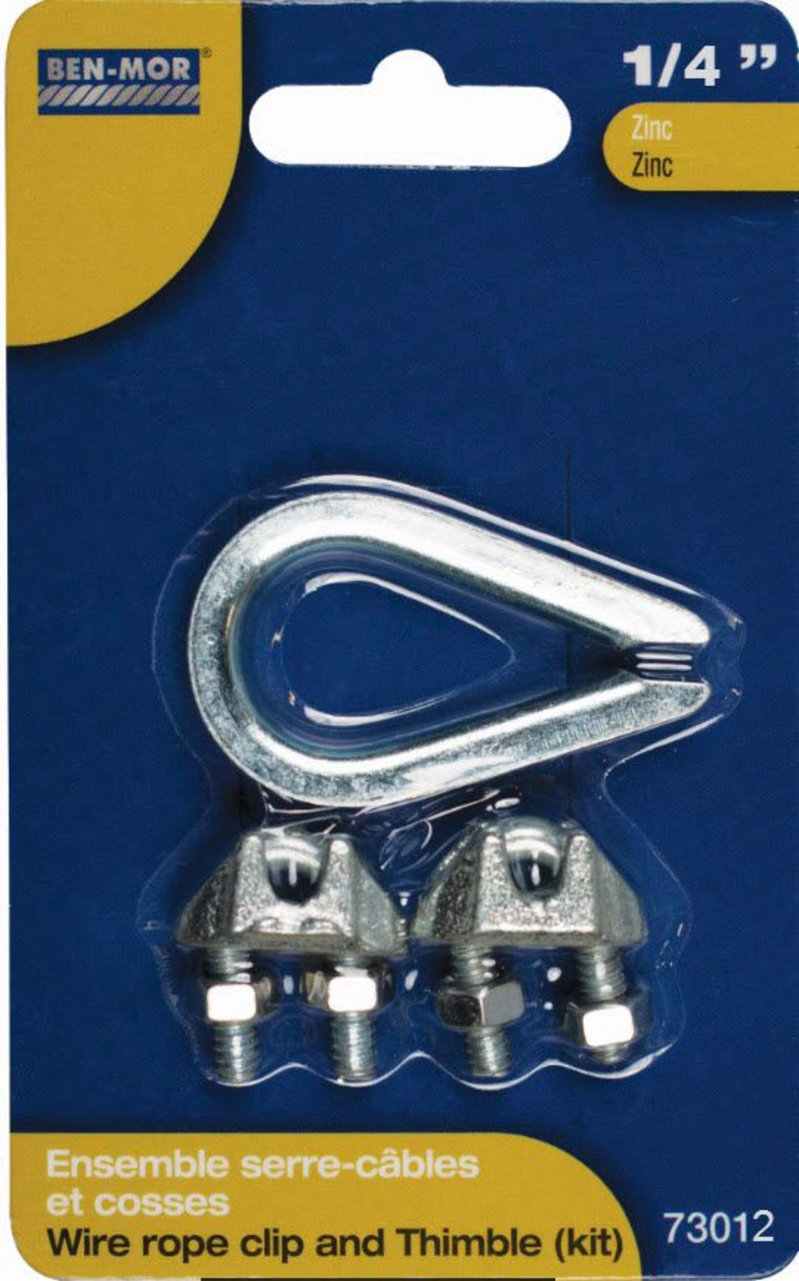 Ben-Mor's corrosion resistant zinc-plated wire rope clip and thimble lets you easily form secure loops in your wire ropes. The thimble defines the loop's radius while the two clips lock the wire rope together, perfect for applications that require a fixed wire rope loop.