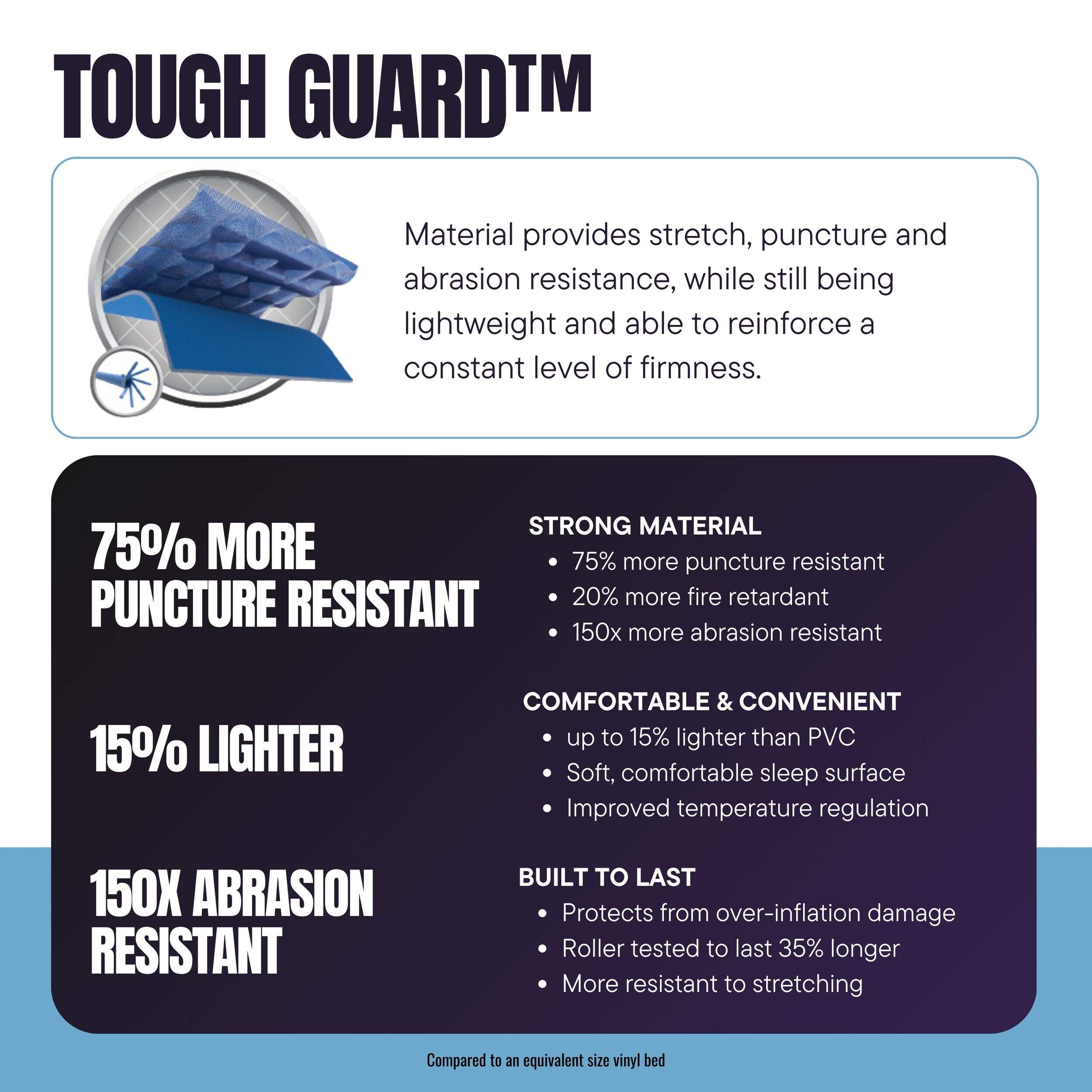 Tough Guard™ exterior is more abrasion resistant, more stretch resistant and more puncture resistant than PVC