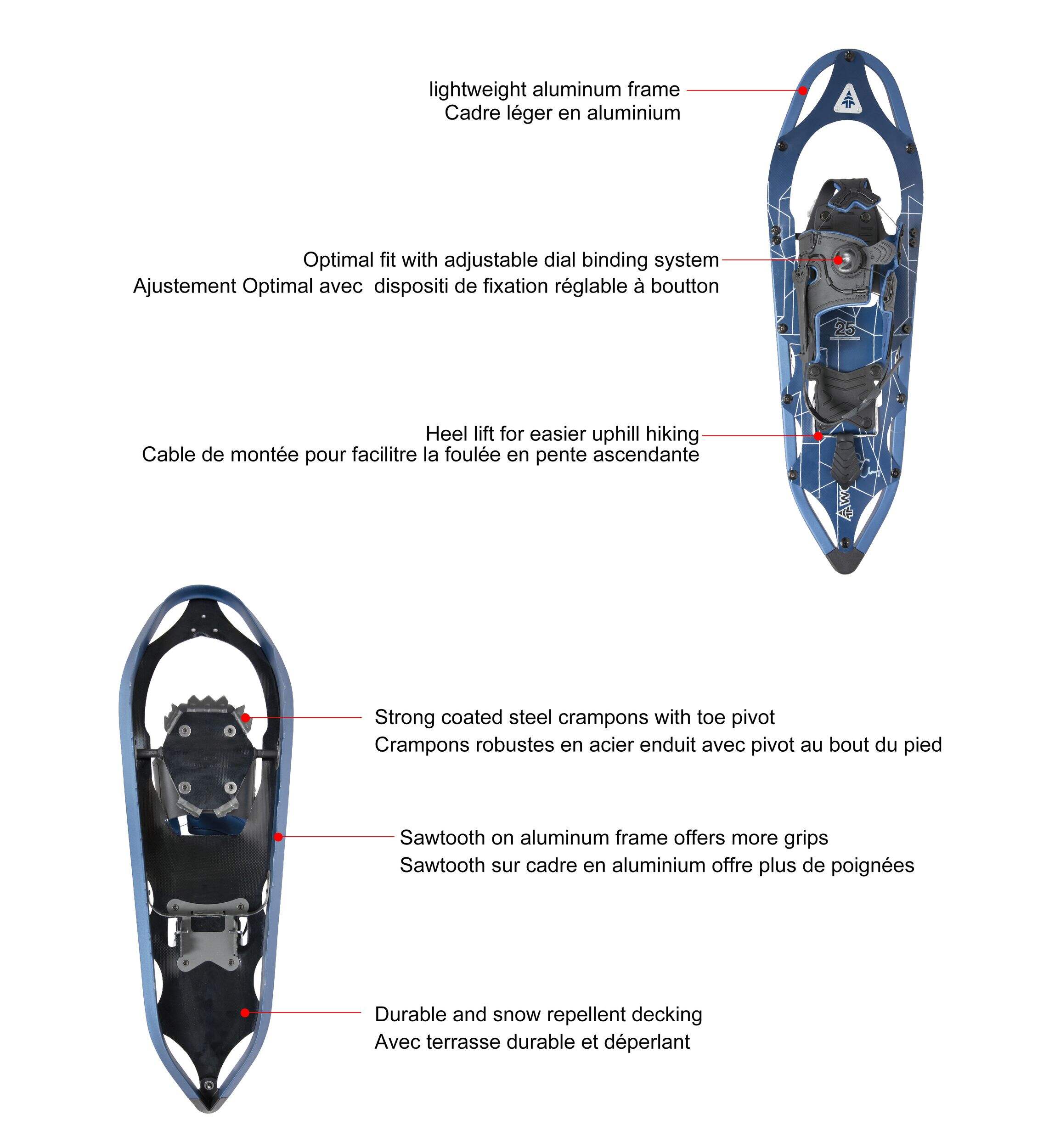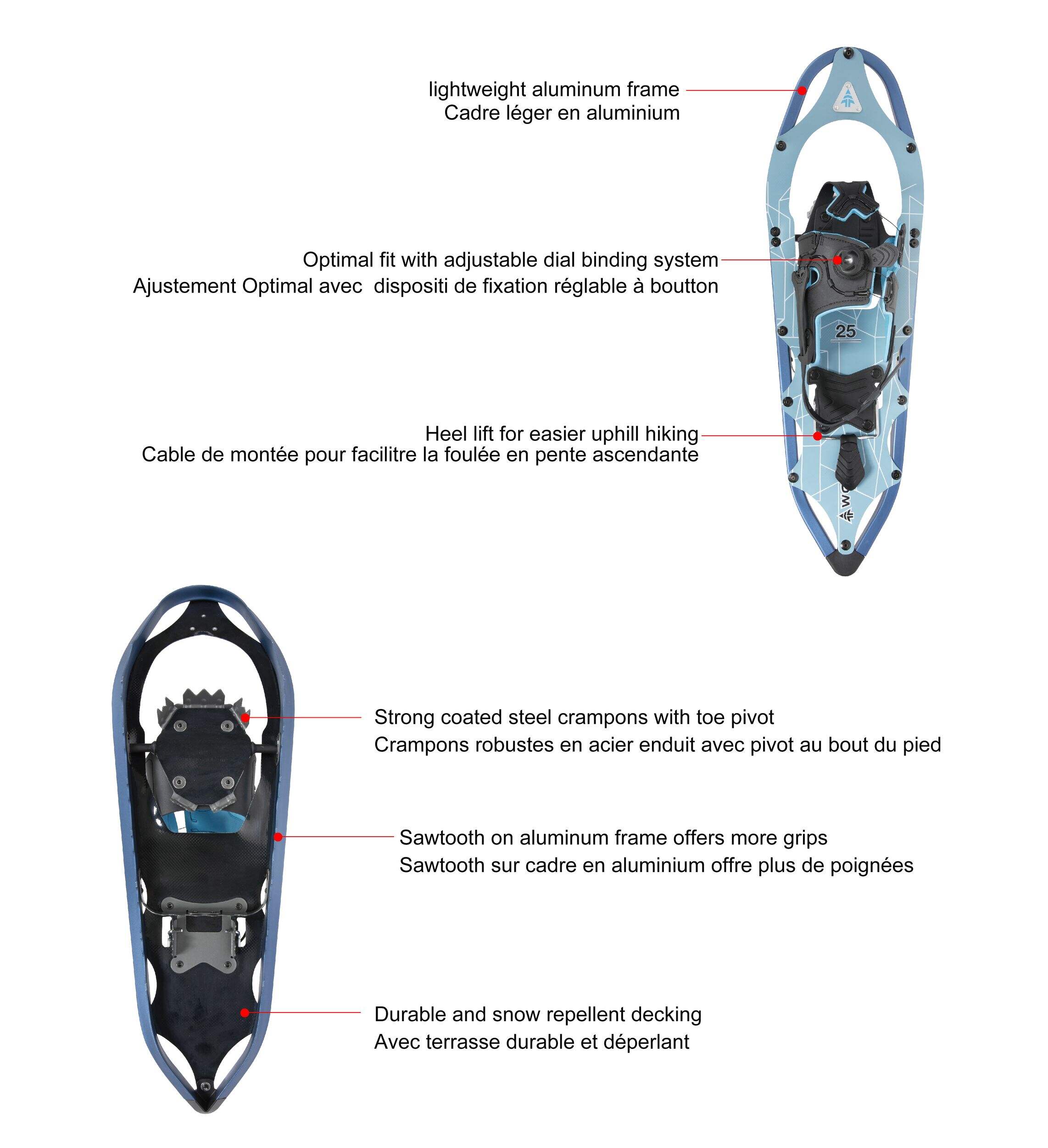 Hit the trails this winter in the Woods Men's Snowshoes, designed for both comfort and stability on snowy terrain. These snowshoes feature a lightweight, durable aluminum frame and a dial-adjustable binding for a secure, one-handed fit. The pivot system and steel crampons enhance traction on snow and ice to keep you moving safely. Built-in EVA padding provides comfortable protection around your boots for long days of snowy exploring.
