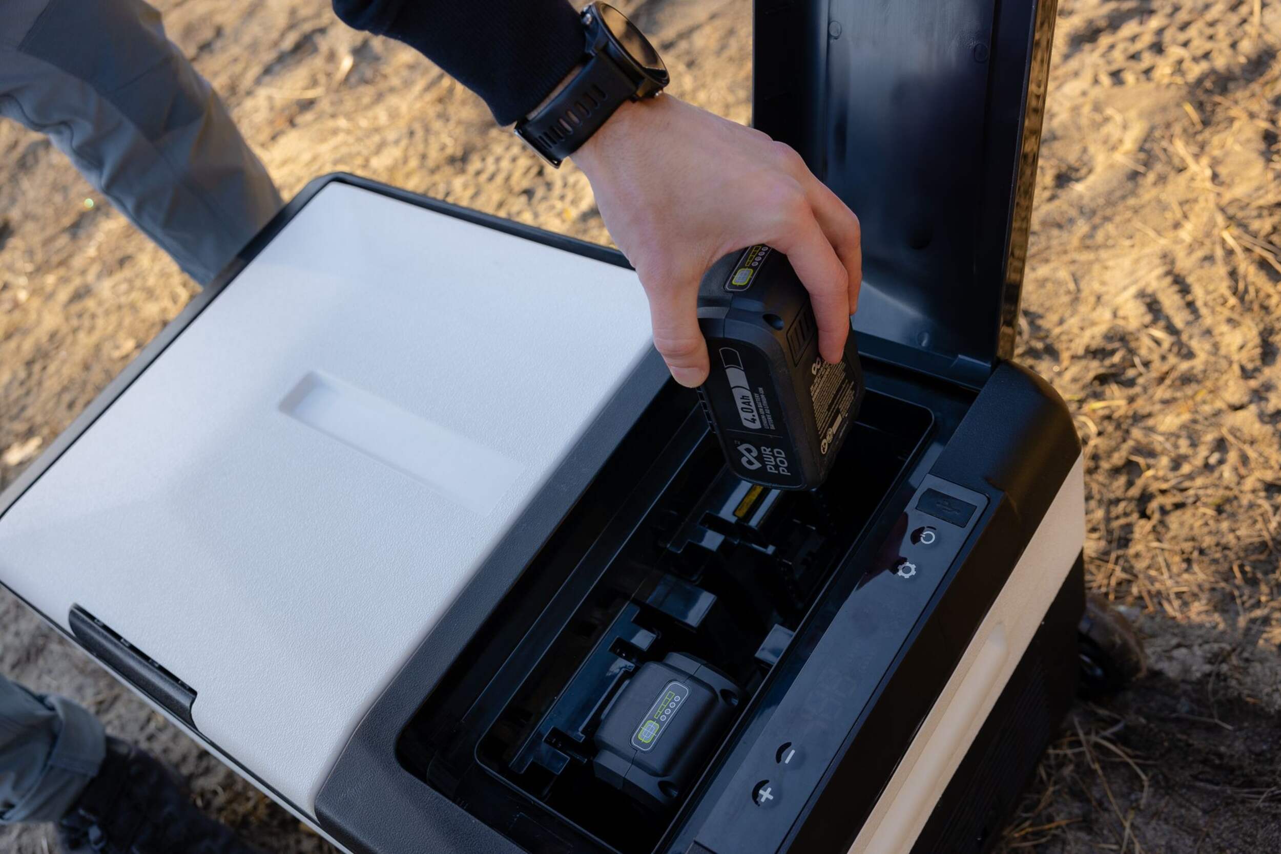3 power options: one or two PWRPOD 20V Max (5.0Ah recommended) lithium-ion batteries (batteries sold separately), 120V AC wall adaptor (included), or 12V or 24V DC vehicle adapter (included)