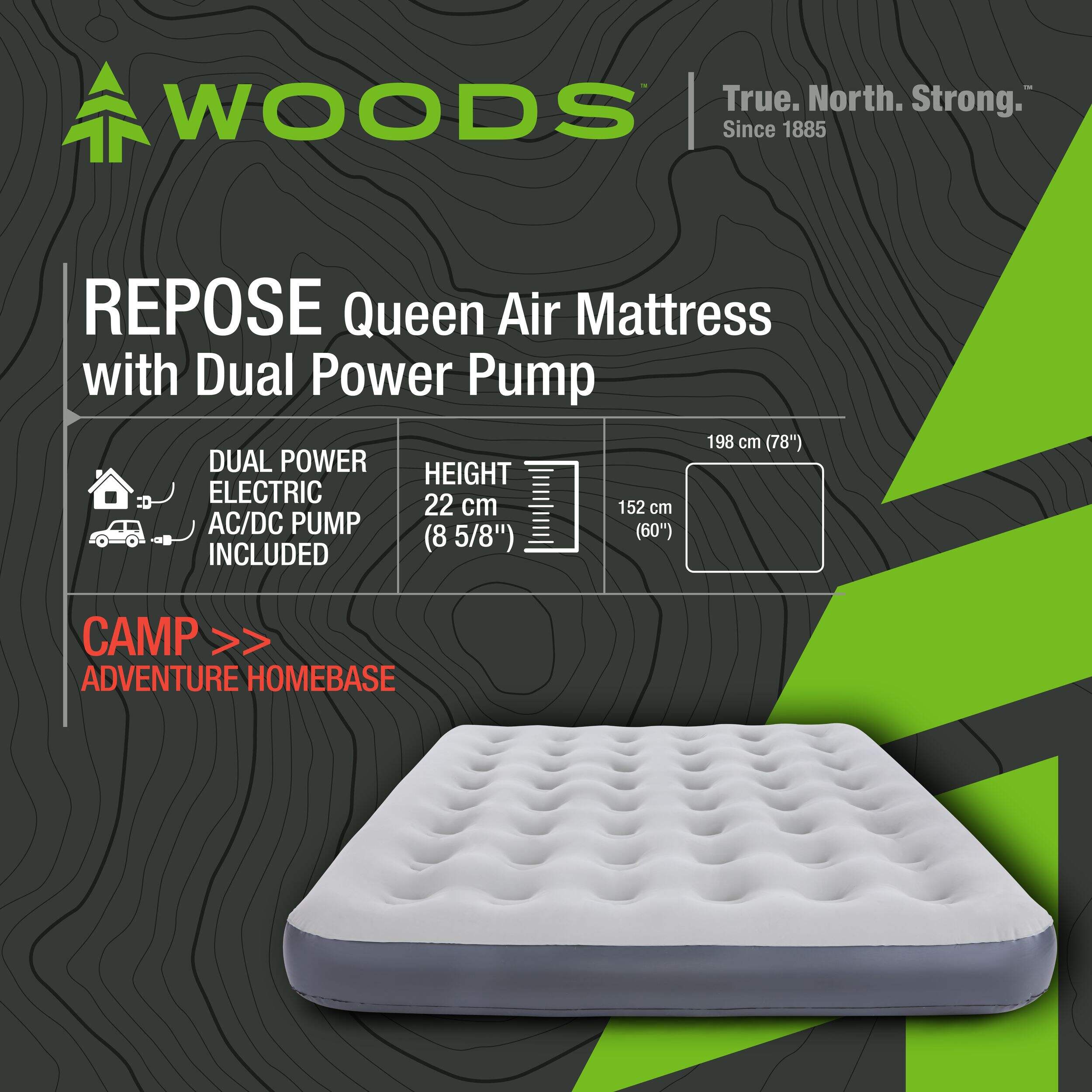 The Woods Queen Single-High Inflatable Air Mattress provides a convenient and comfortable sleeping solution for camping trips, road trips, or home use. Featuring a 2-in-1 pump compatible with both AC and DC outlets, this airbed inflates and deflates quickly and easily. The durable, puncture-resistant material ensures long-lasting use, while the queen size offers ample space for two adults. Whether you're in the great outdoors or hosting overnight guests, the Woods Inflatable Air Mattress delivers reliable comfort and stability for a restful night’s sleep.
