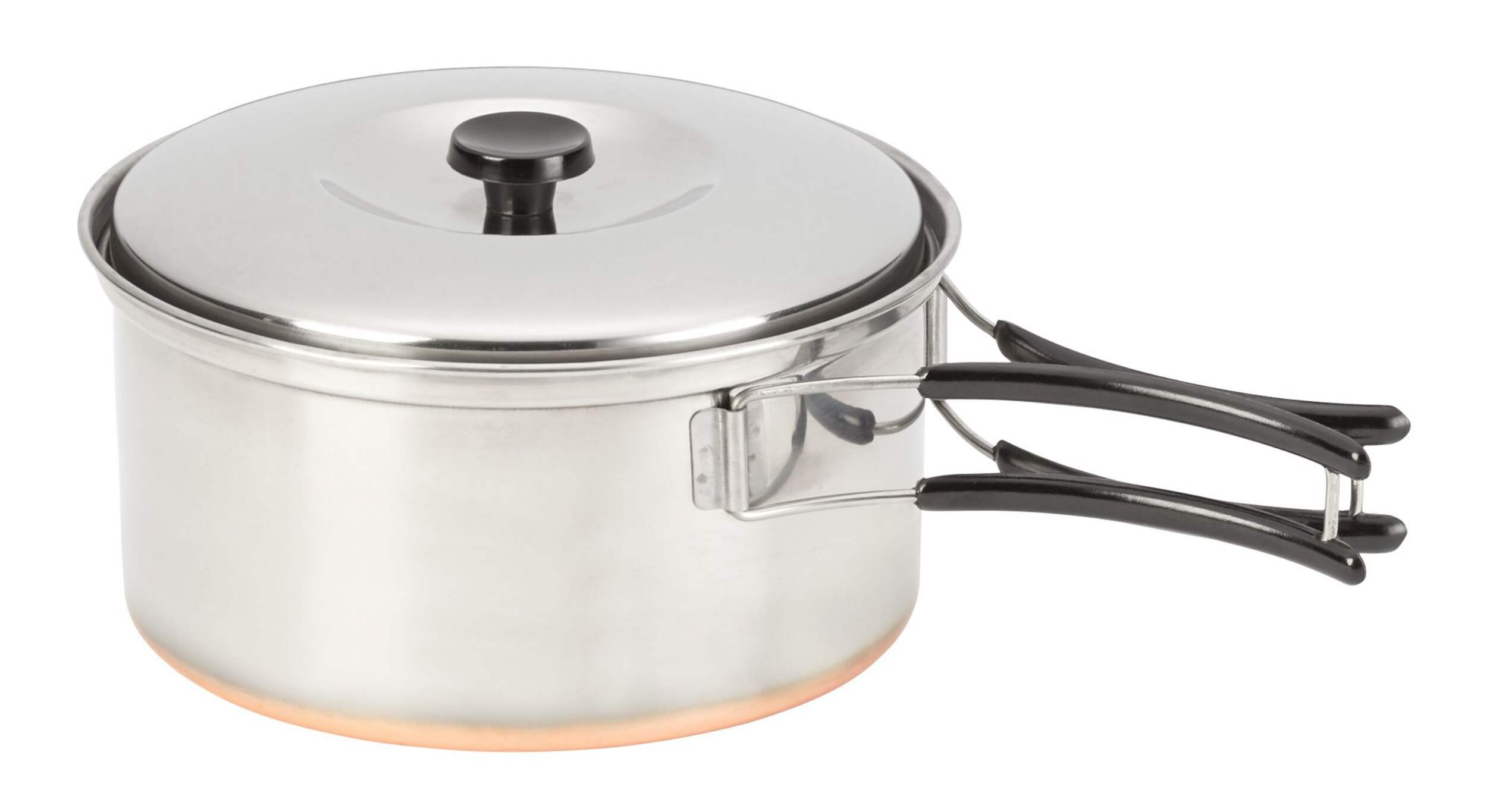 7-piece set includes: 2 plastic cups, 1 qt (1 L) saucepan with cover, 1.5 qt (1.4 L) saucepan with cover, 6" (15 cm) frying pan and a carry bag