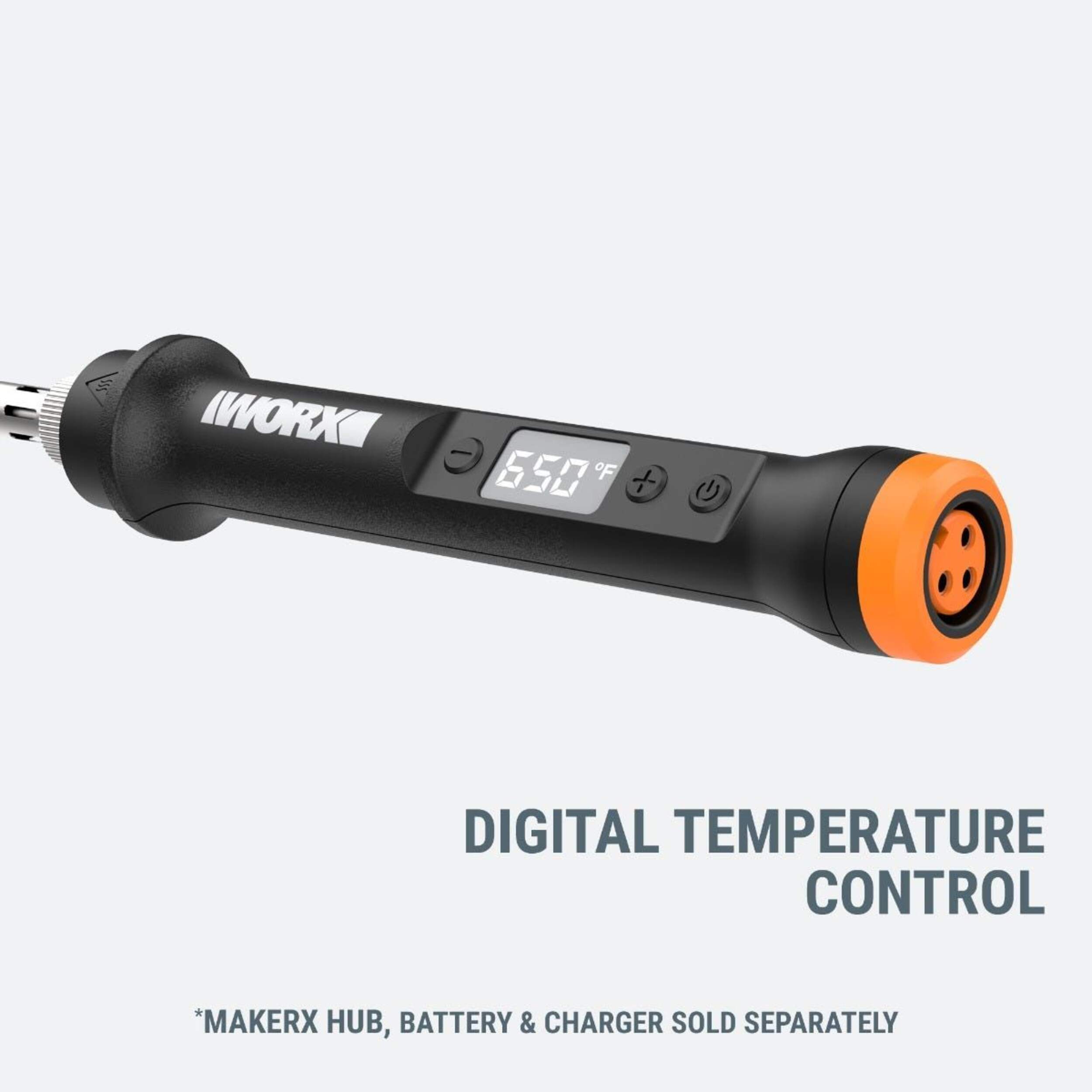 The WORX 20V MAKER X Wood and Metal Crafter Tool is a compact, easy-to-use tool for detailed work. It heats up in 30 seconds and can reach temperatures from 400° to 900 °F, making it ideal for wood, soldering, and metal crafting projects. This tool is part of the MAKERX series and uses a rechargeable 20V Power Share battery, which is compatible with all WORX 20V and 40V tools. The package includes 9 wood-burning and 1 soldering tip for various applications. The tool is also equipped with a 4' long cord for easy maneuvering. The Hub and battery are not included.