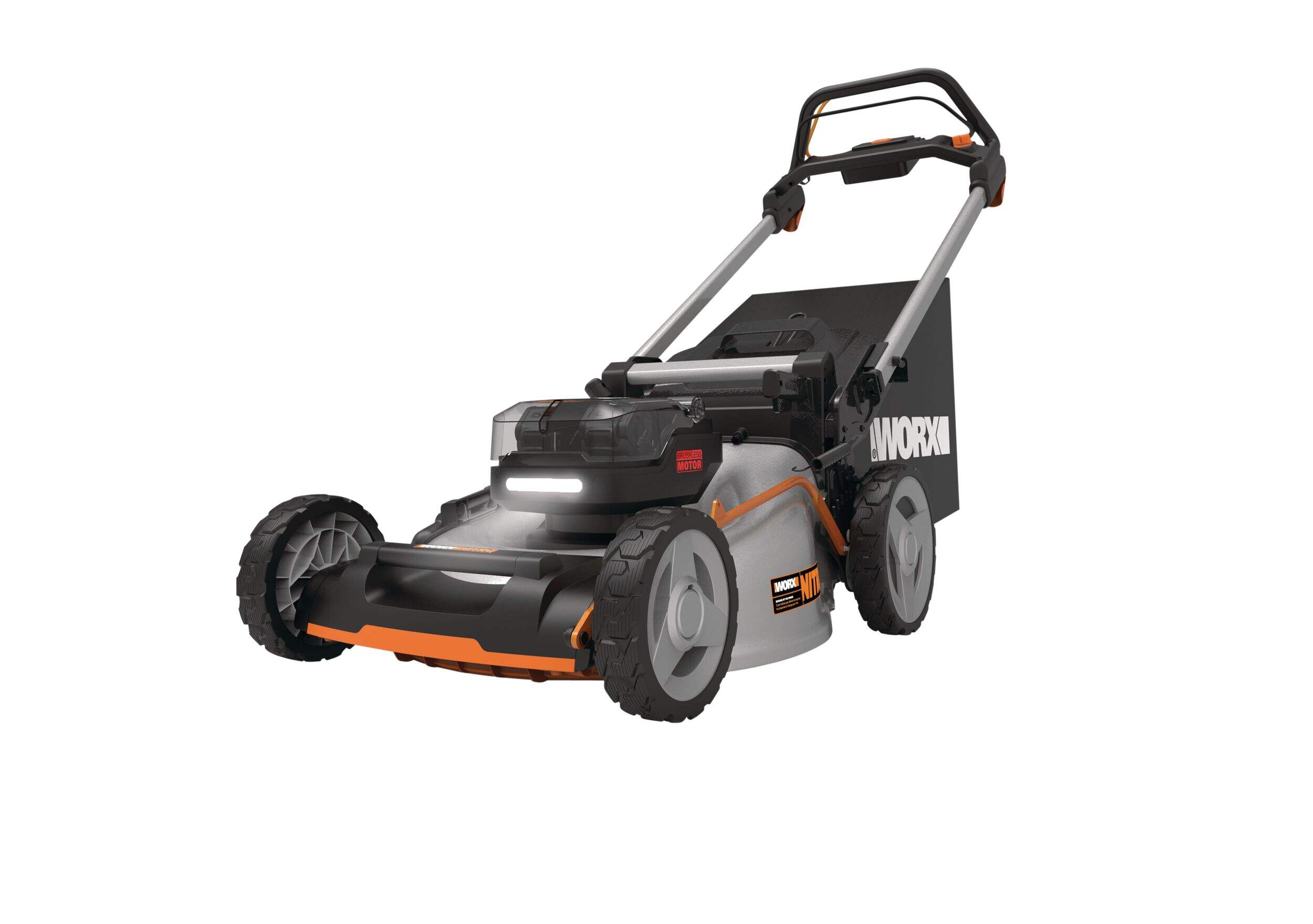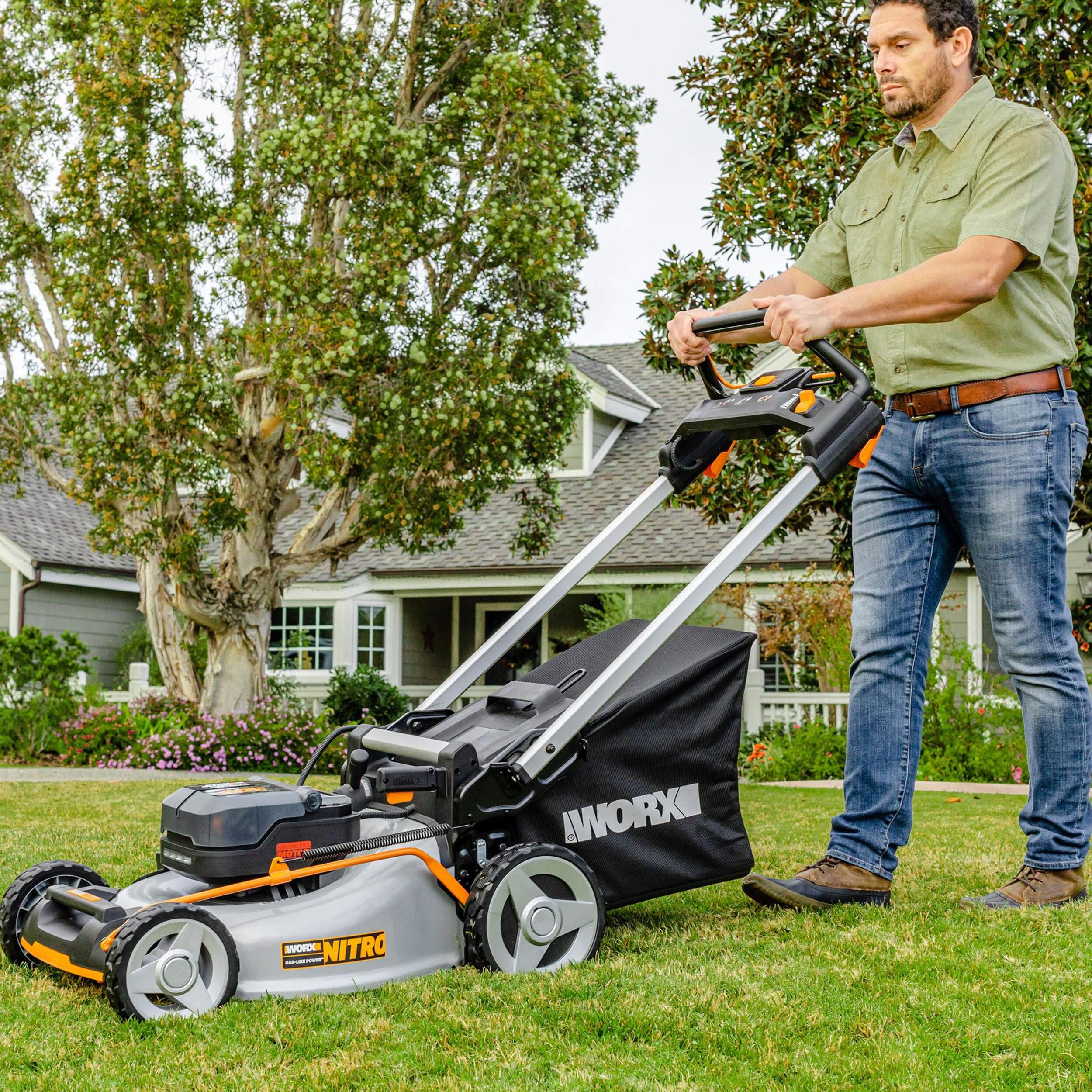 The Worx Nitro WG753 40V Power Share Cordless 21" Self-Propelled Lawn Mower with Rear Wheel Drive and 2X 5.0Ah Batteries has a highly-efficient brushless motor running 50% longer, churning out 25% more power, and providing 10% more life than brushed motors. With two high-capacity Power Share PRO batteries, this self-propelled mower is a worthy replacement to gas mowers. And does so without any of the drawbacks of gas, like the cost, mess, fumes, excessive volume, or extra maintenance. Full of quality-of-life features, like rear-wheel drive with a variable-speed control so the user can pick a pace that’s comfortable for them. Single-lever height adjustments and mode changes make switching between cutting heights (7-positions, 1.6 in.-4 in.) and cutting modes (bag/mulch/side-discharge) quick and easy. LED lights provide greater visibility when mowing at dusk or in other low-light conditions. Auto-Intellicut™ technology increases the speed of the blades when it detects thicker grass, then slows them back down when the mowing gets easier to conserve battery usage. And the one-touch fully-collapsible handle makes for compact, stand-up storage in the garage. The bag capacity is 2 Bushels, the wheels are 8 in. (front) and 10 in. (rear). The durable steel cutting deck is a wide 21 in. (20 in. cutting width) and great for lawns with rough terrain, and features Nutricut™ dual-stage mulching capabilities to return both water and nutrients back to your lawn.
