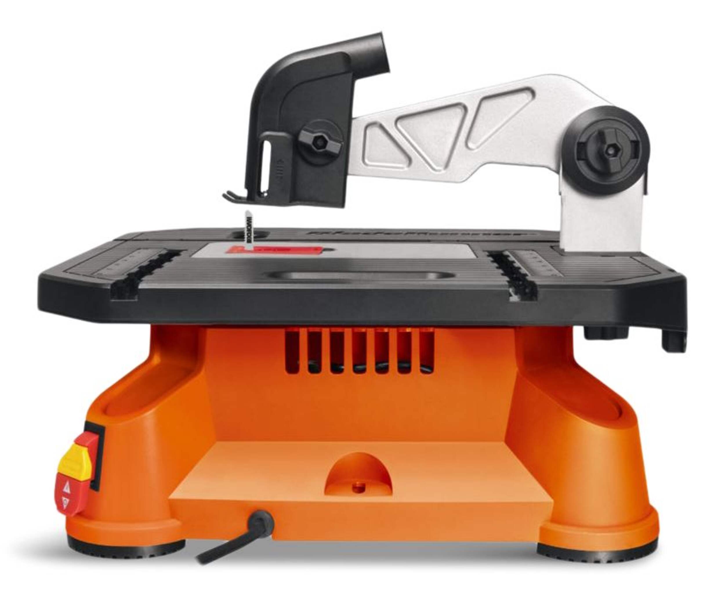 Accessories included: miter gauge, rip fence, 5 blades (wood, aluminum, steel, ceramic tile and scrolling), vacuum adapter and blade grip