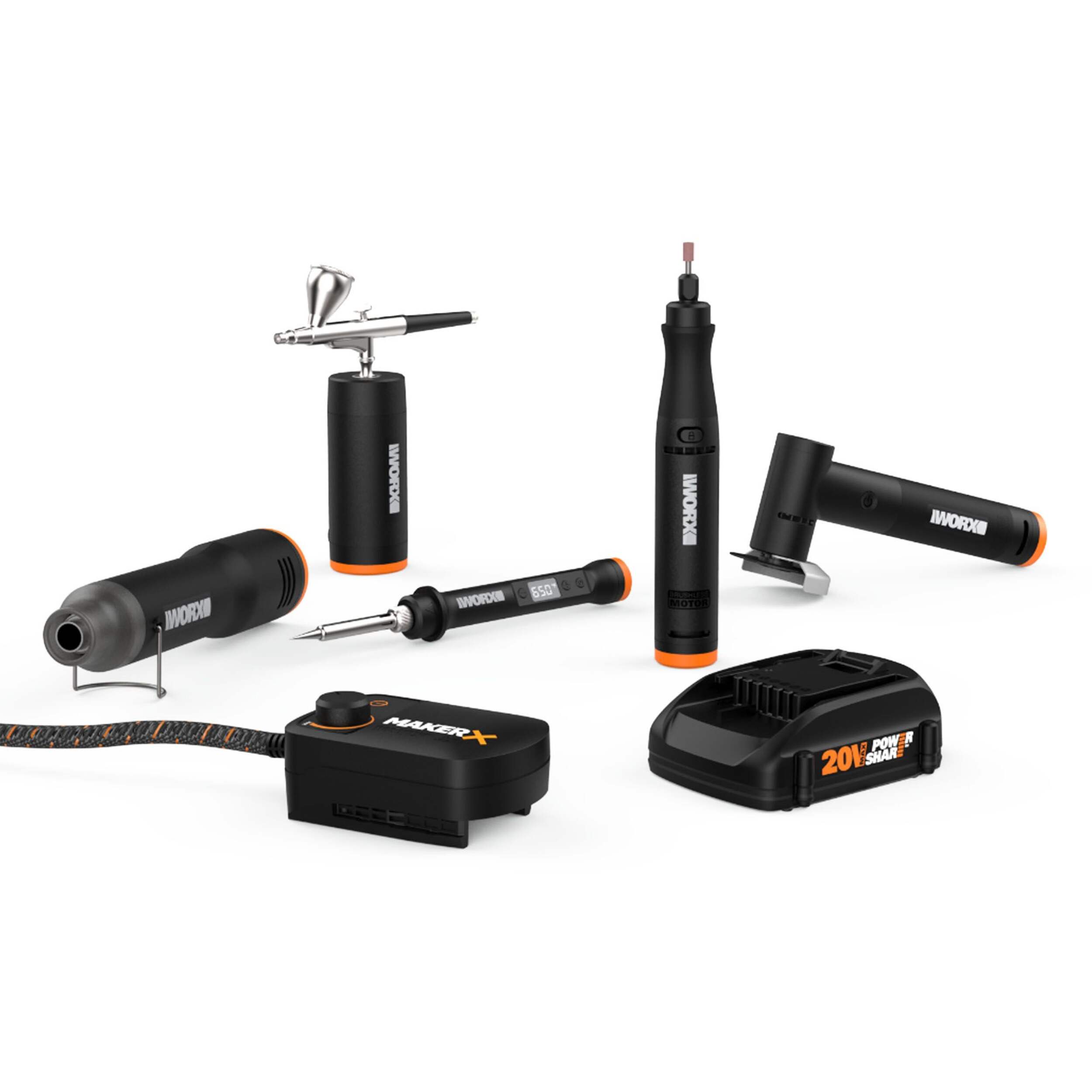 Tools Included: MakerX Hub, 20V 2Ah Power Share battery, Rotary Tool, Mini Heat Gun, Air Brush, Wood and Metal Crafter, Angle Grinder