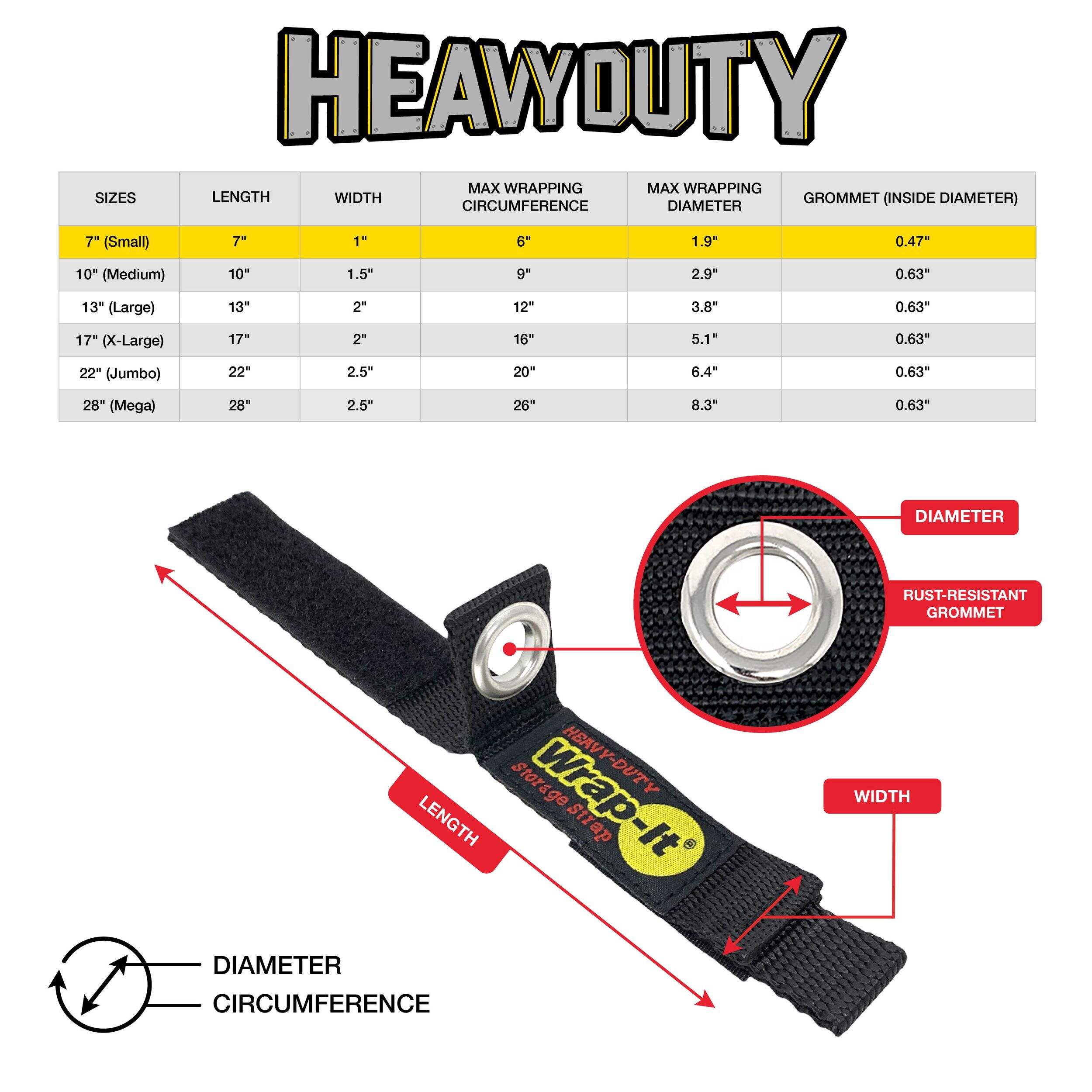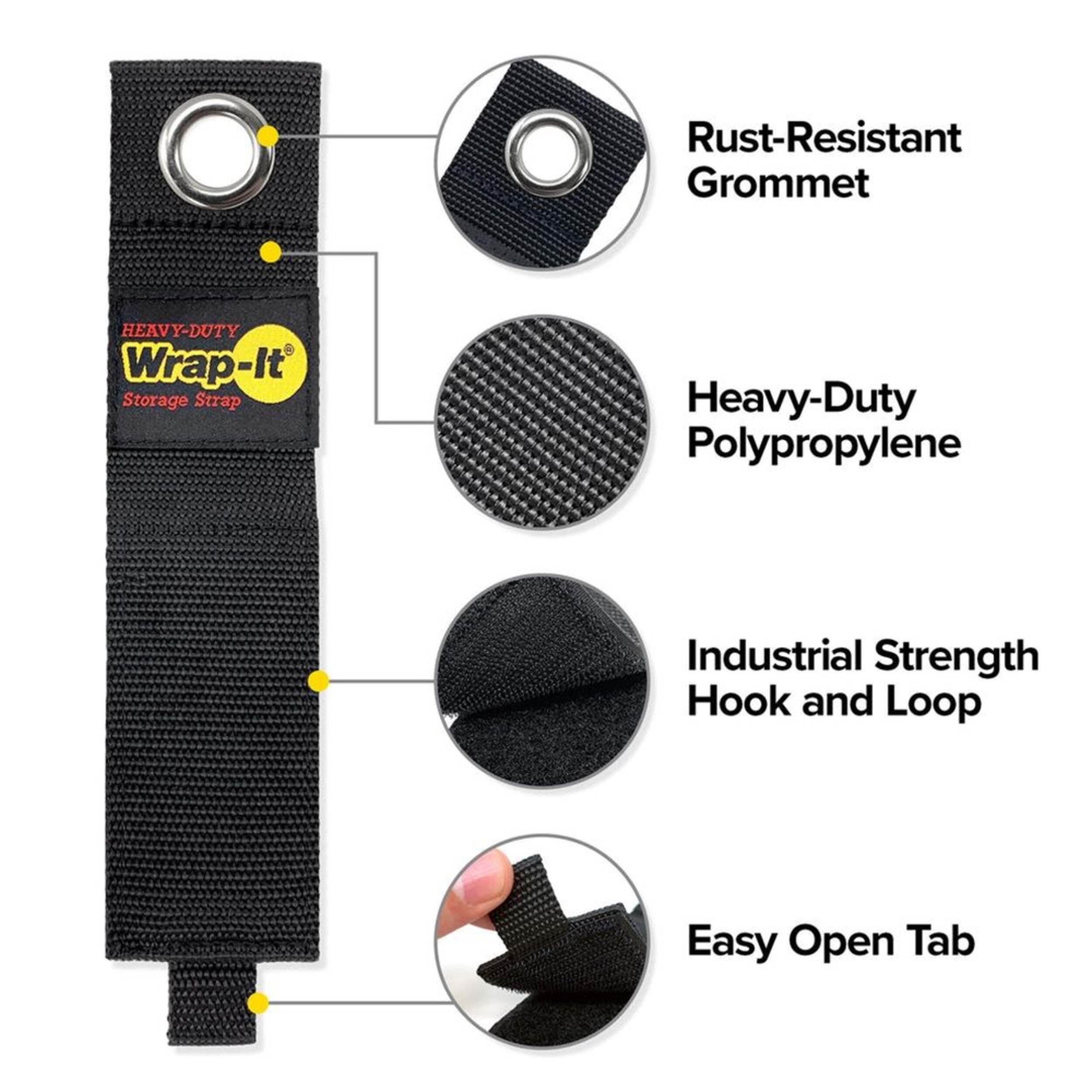 Heavy-Duty Wrap-It Storage Straps are tough. Made with heavy-duty polypropylene, industrial strength hook and loop, and a rust-resistant grommet these are built to last indoors or outdoors. Organize, hang, and store cords, hoses, rope, and so much more! Great to get organized around the house or in the garage, shop, shed, RV, boat, or truck.