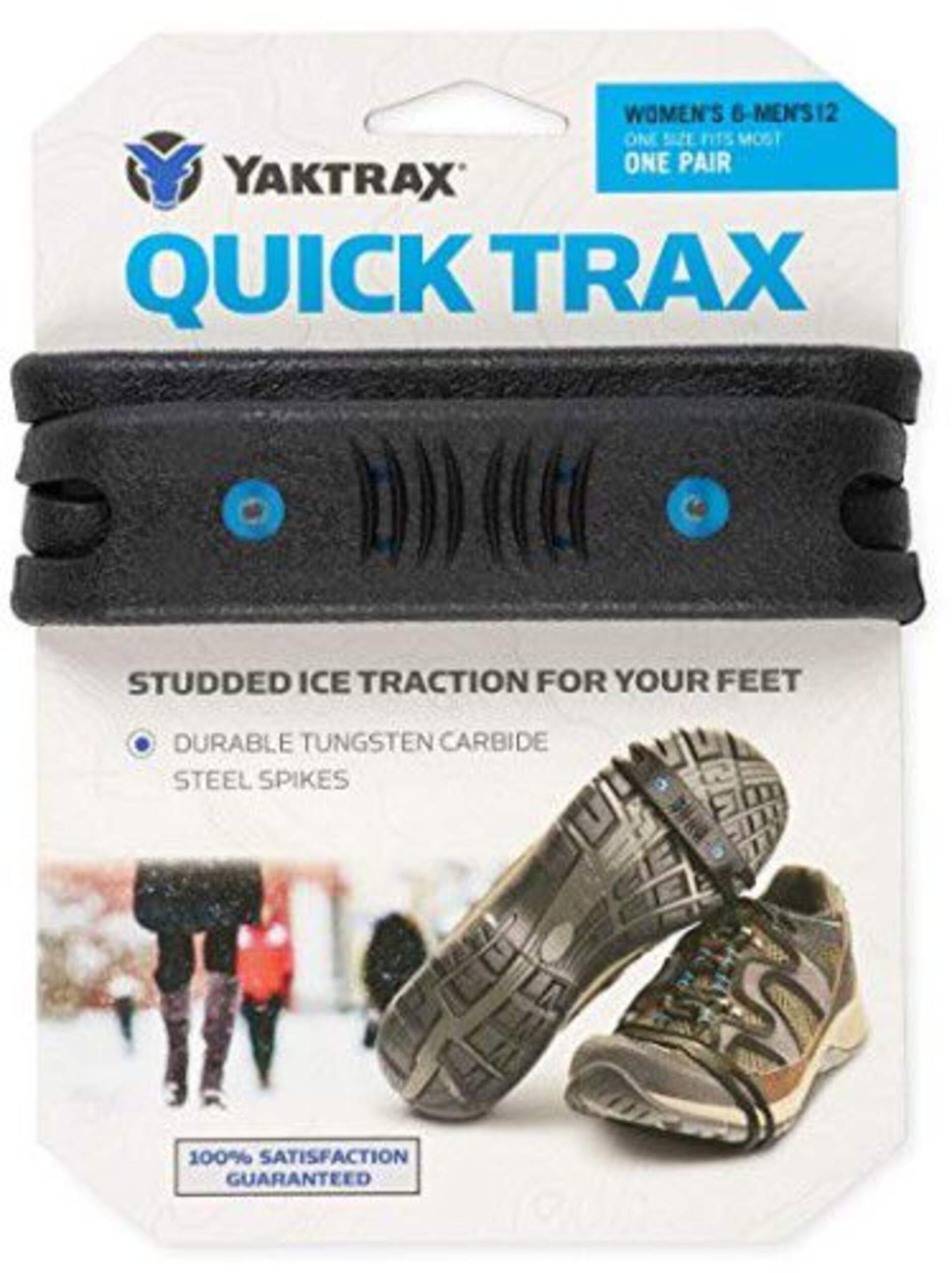 Avoid slipping and sliding this winter with the YakTrax Adult Quick Trax Snow & Ice Shoe Grips for Ice/Snow, One Size. Simply stretch these durable tungsten carbide steel spikes over your shoes for instant traction on snow and ice. The compact size lets you stash them in a purse or glove box, so you can tackle icy sidewalks and slippery stairs on the go. The one-size-fits-most design provides superior grip for both men and women, keeping you steady on your feet in slick conditions. Don't let winter weather leave you feeling off balance. Stay upright and confident with the stability of YakTrax shoe grips for snow.