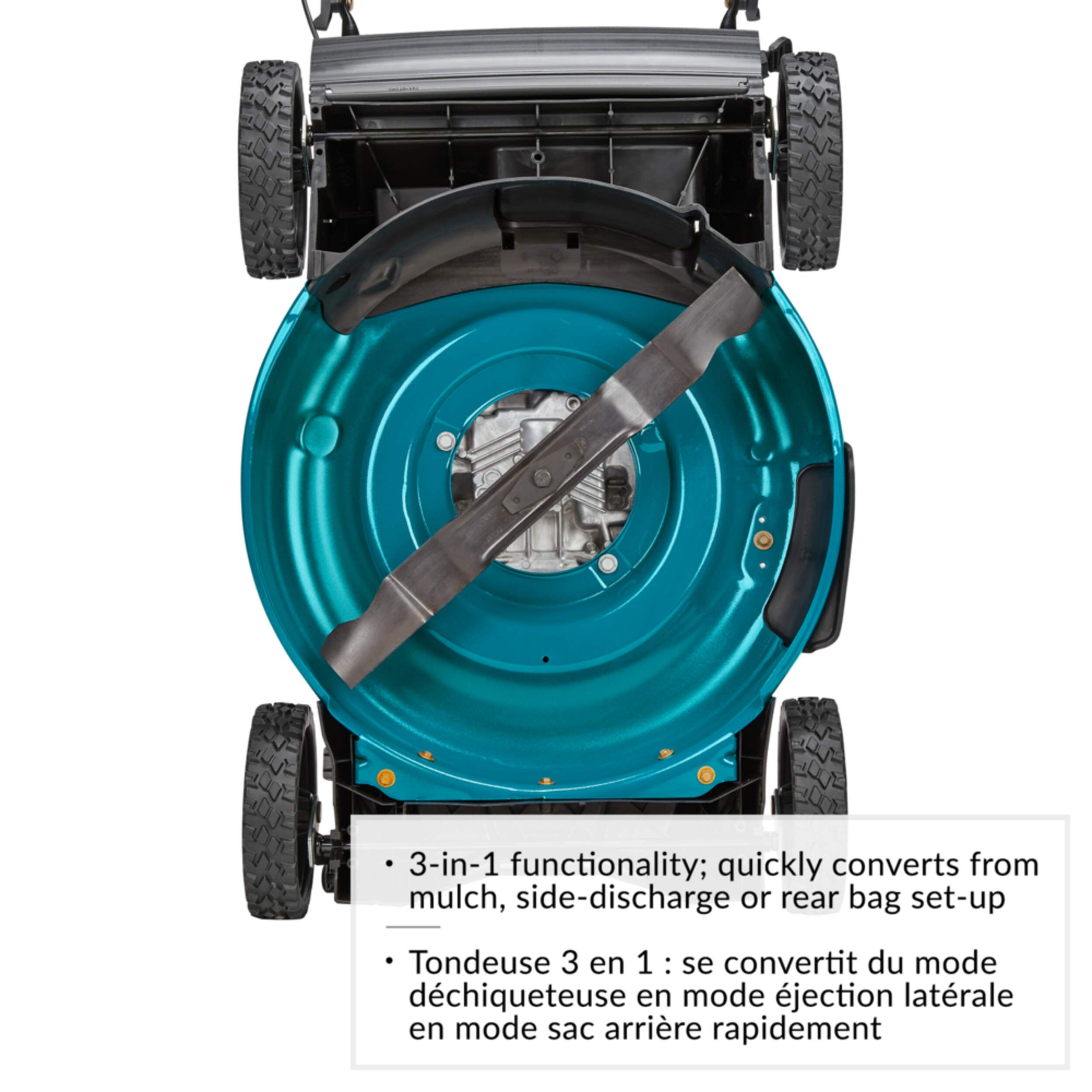 3-in-1 functionality to include rear-bag collection, mulching and side-discharging