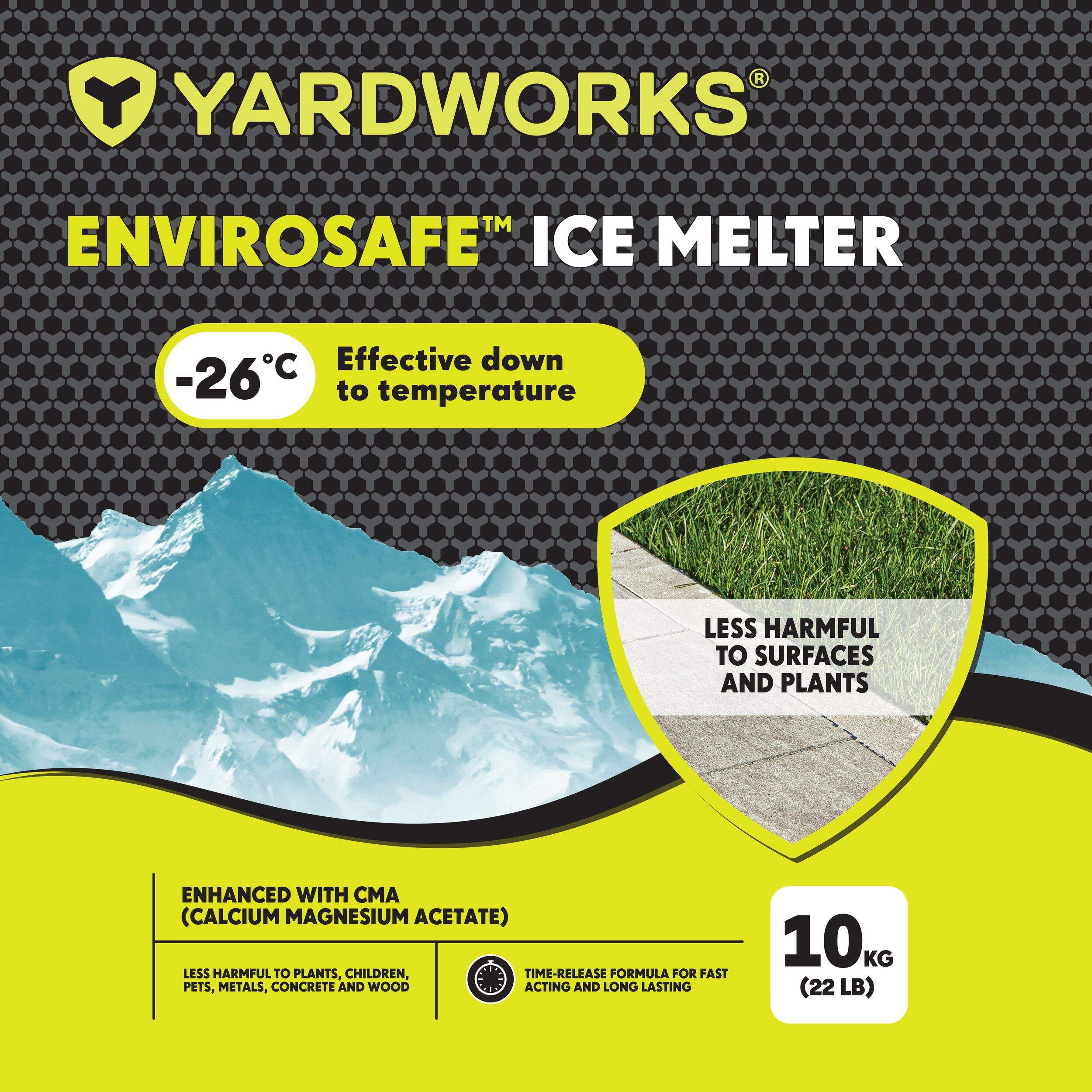 The Yardworks Envirosafe™ Ice Melt Bag is a plant-safe and pet-friendly ice melter that starts working instantly. Enhanced with calcium magnesium acetate, this ice melter initiates de-icing quickly and is less harmful to surfaces, vegetation, and pets. It melts down to -26°C, creating a bond with surfaces to protect against corrosion. The easy-to-handle bag makes this ice melter simple to spread, while keeping your property safe.
