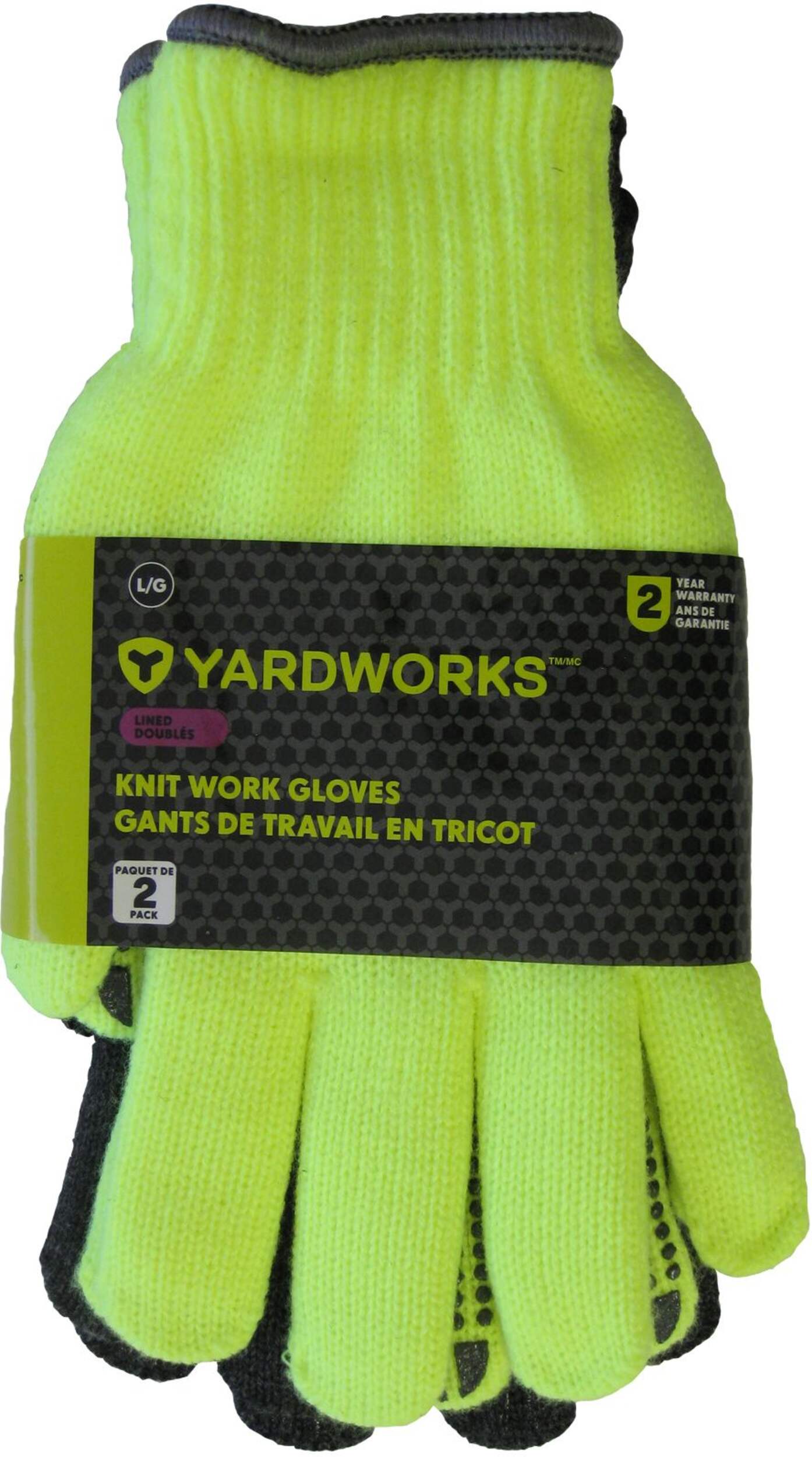 The Yardworks Knit Lined Work Gloves are your go-to multi-purpose gloves for an assortment of jobs. These work gloves come in bright high visibility yellow and grey and have a PVC dot design for added grip. The extra lining provides both added protection and warmth in cooler conditions.