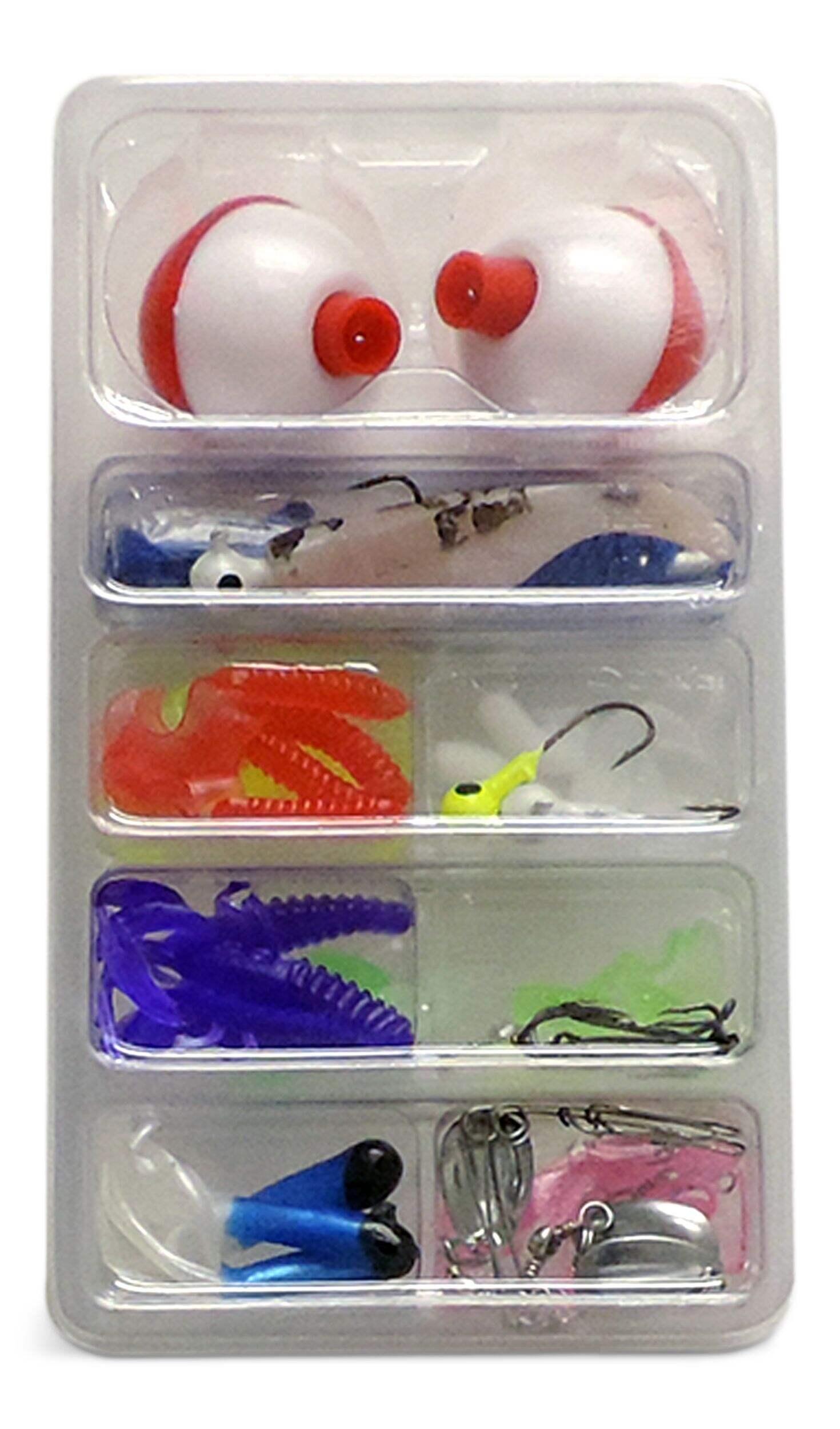53-piece tackle wallet includes 9 hooks, 2 bobbers, 4 swivels, 1 stringer, 2 split-shot sinkers, 3 jig heads, 15 curly-tail jigs, 7 twin-tail grubs, 3 spinner attachments, 3 tube jigs, 3 crawfish jigs and 1 swimbait