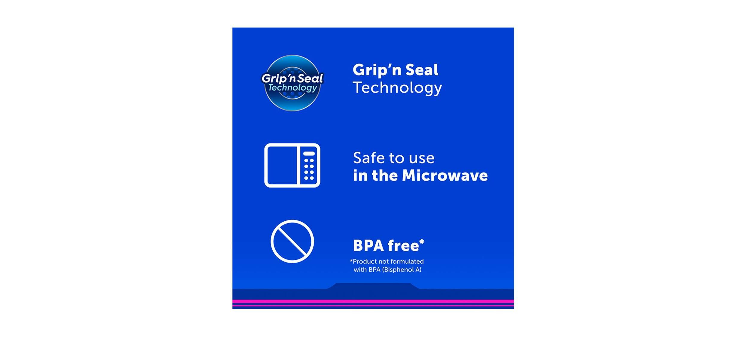Triple seal system features an extended tab, easy grip texture and a double zipper